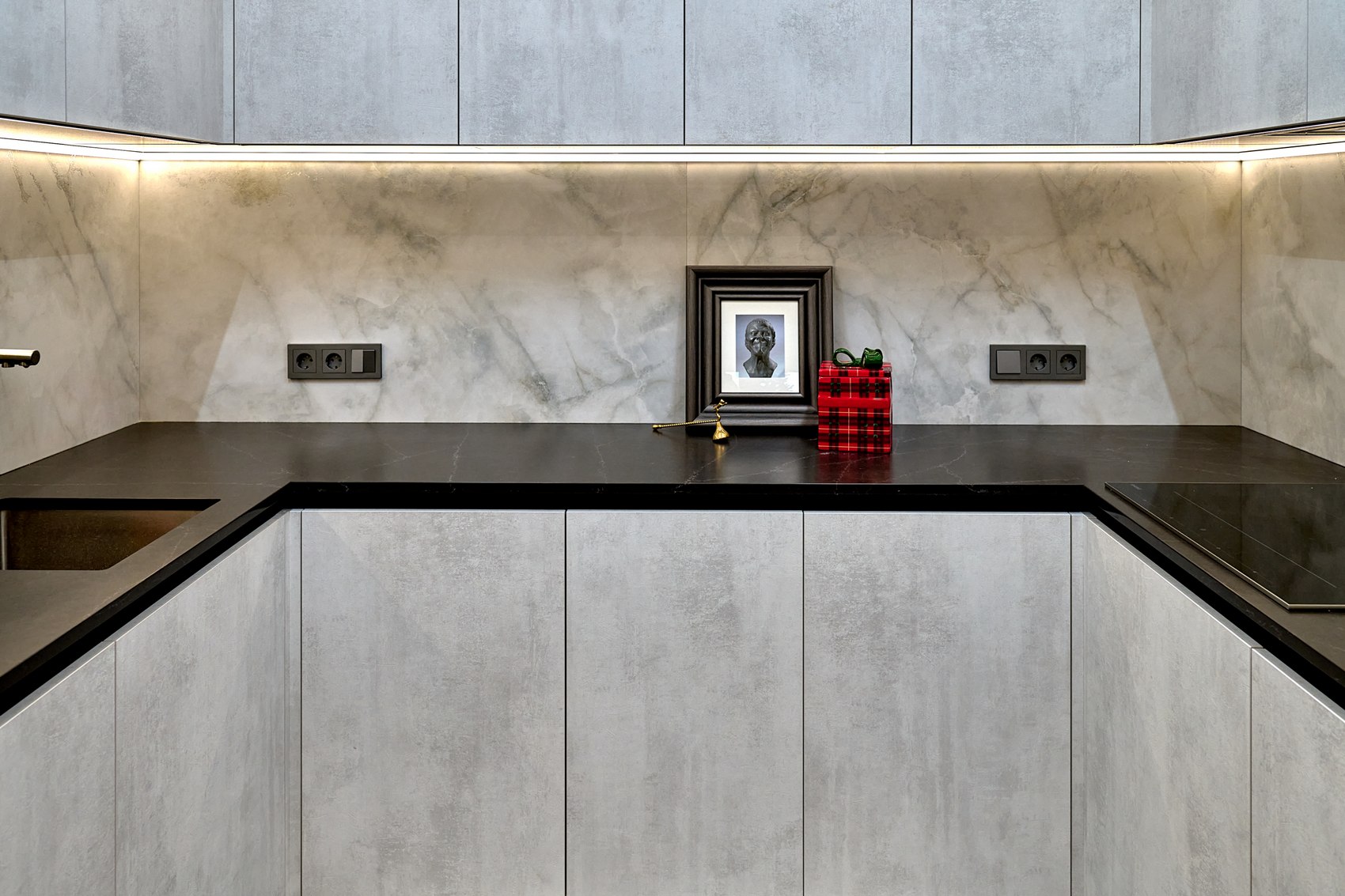 Фартук подбирали под отделку фасадов кухонной мебели. Очень близкий по цвету к кухне мы нашли индийский керамогранит форматом 80*160, под серый мрамор, с эффектом карвинга.