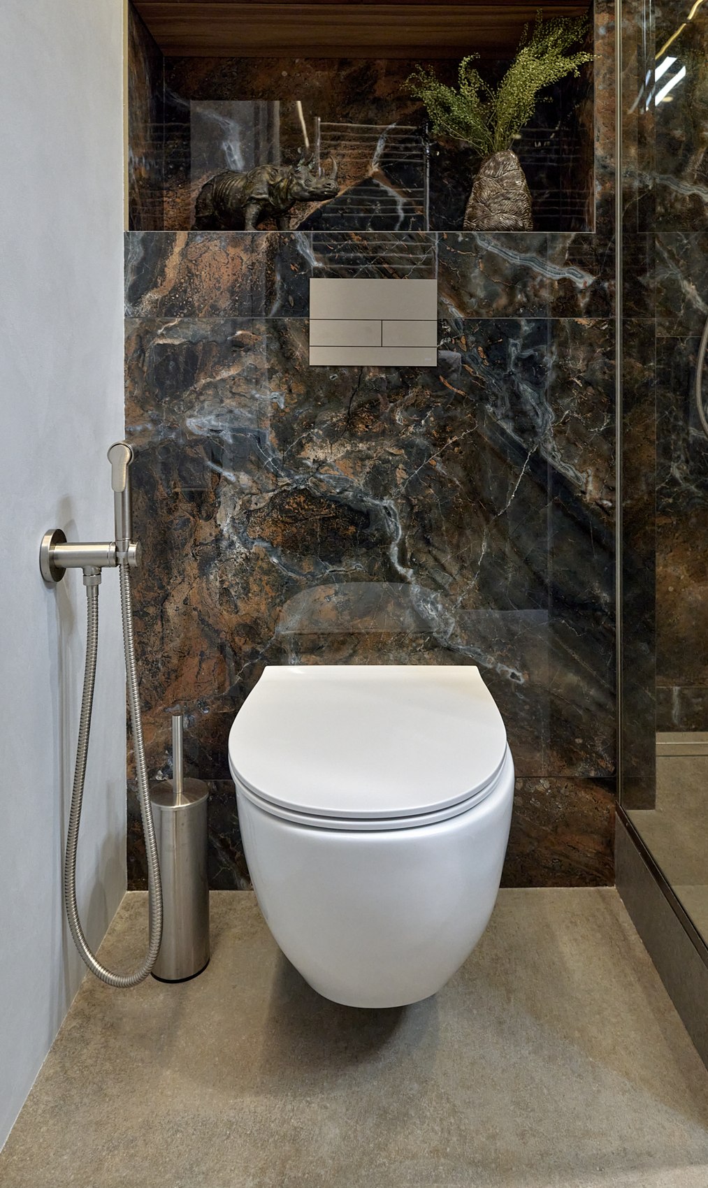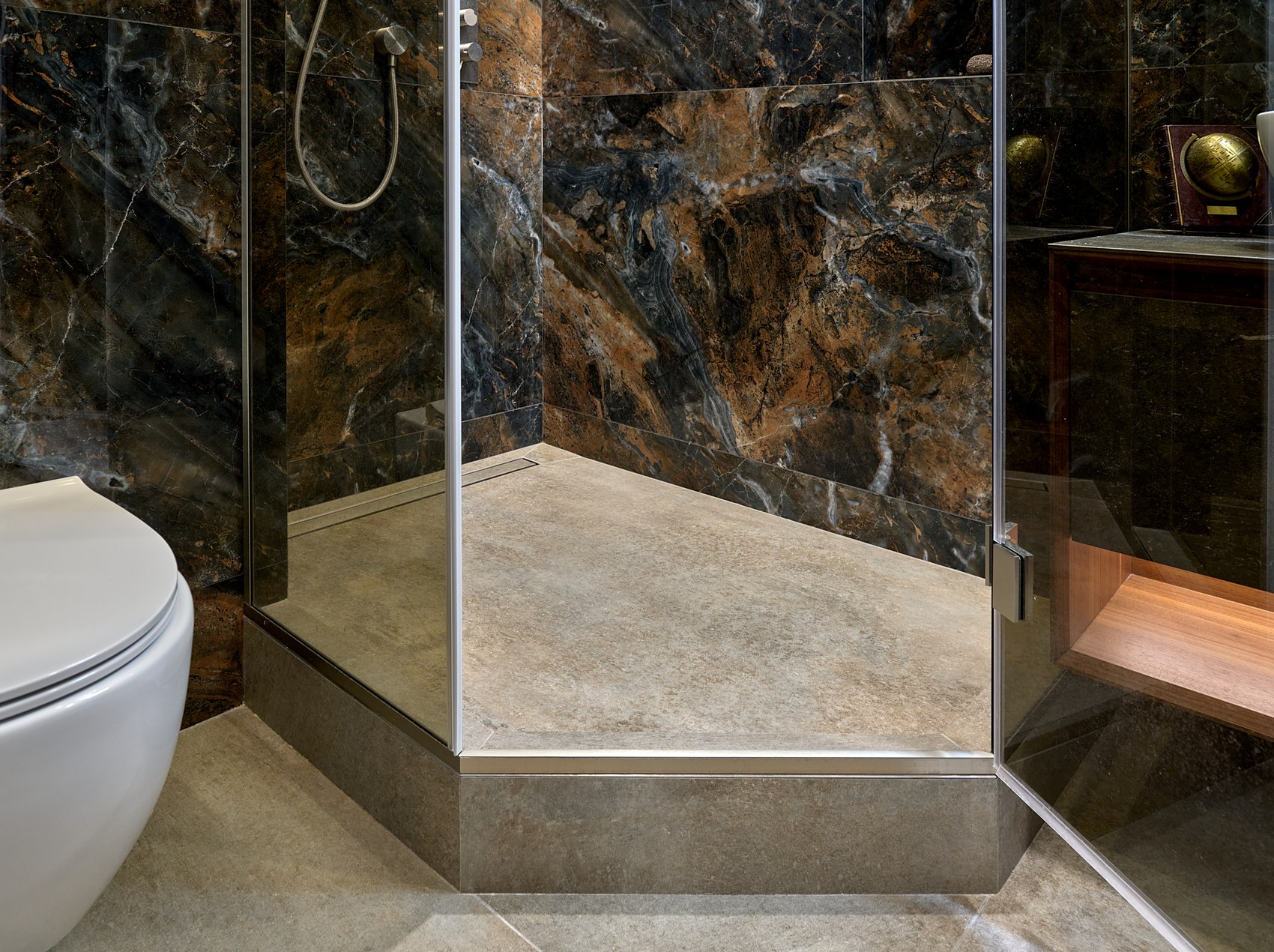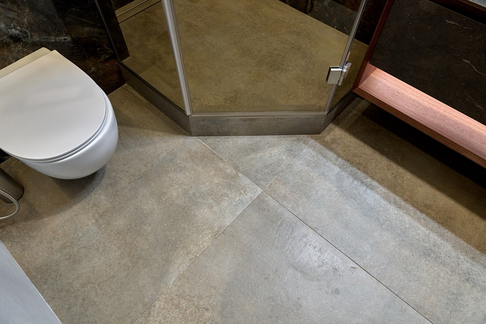 Компания МастерДом помогла реализовать идеи двух санузлов. Заказчикам очень понравился индийский керамогранит с потрясающим "космическим" рисунком. И мы решили сделать три стены в санузле из этого керамогранита. Разбавили на полу спокойным материалом и одну стену сделали в декоративной штукатурке (микроцемент).