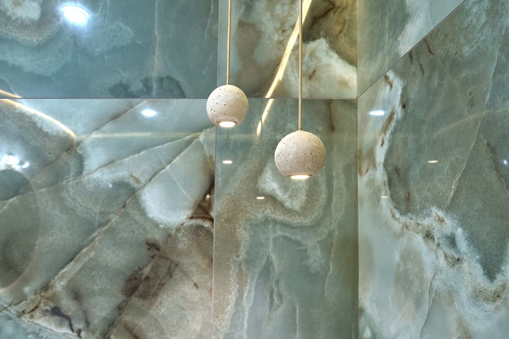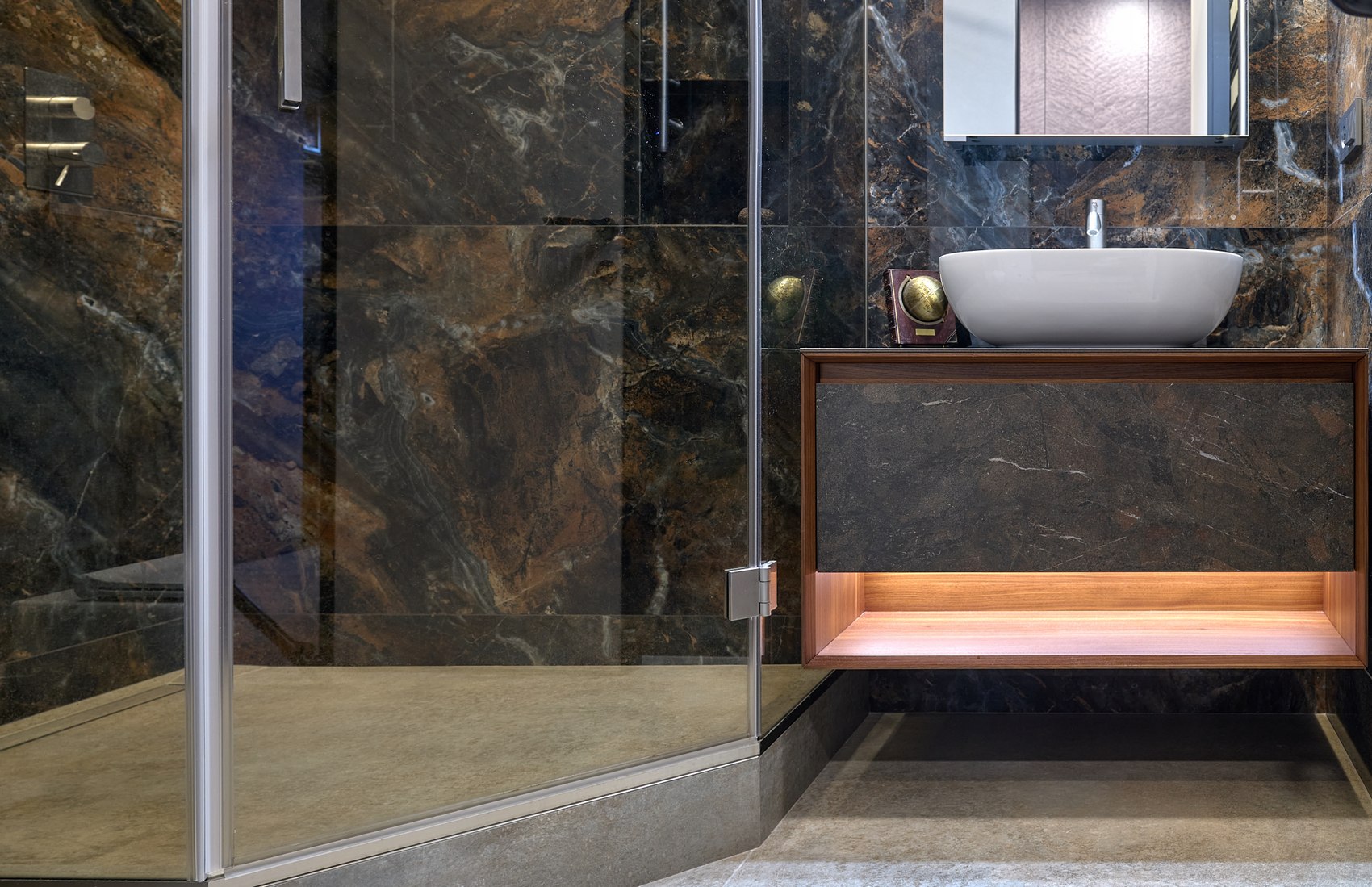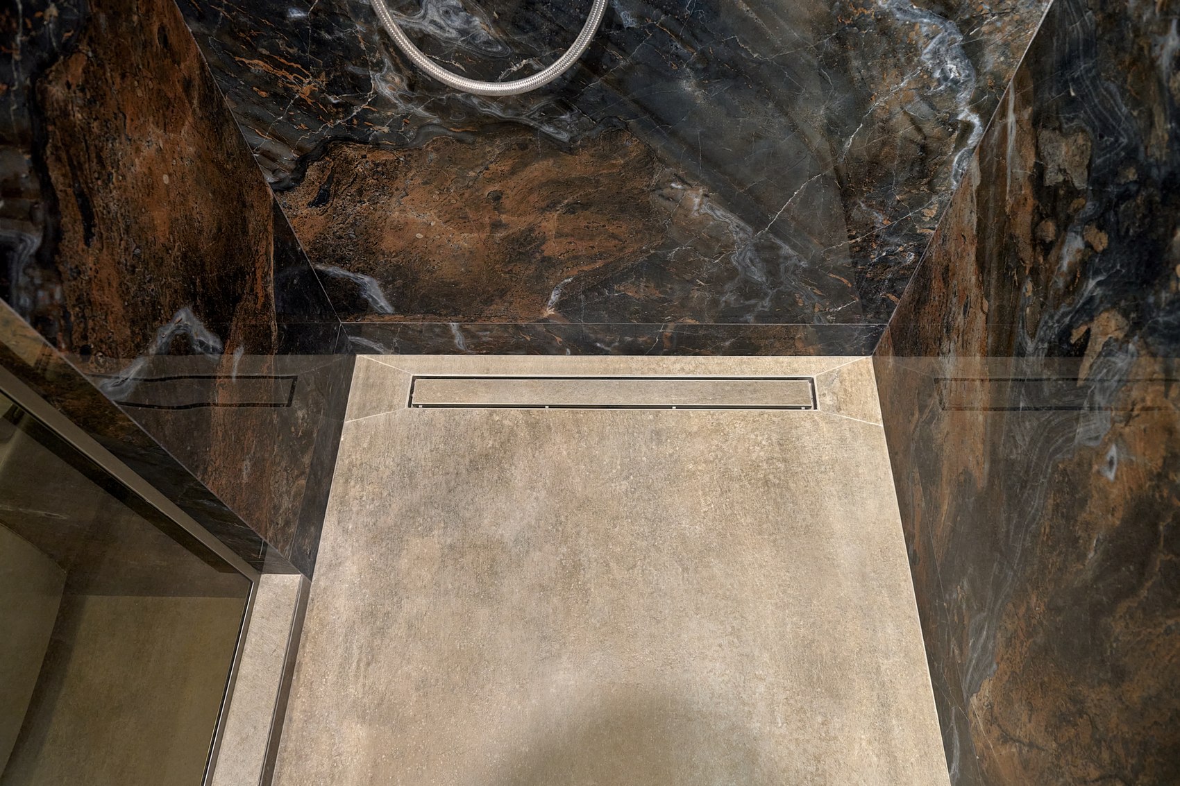 Компания МастерДом помогла реализовать идеи двух санузлов. Заказчикам очень понравился индийский керамогранит с потрясающим "космическим" рисунком. И мы решили сделать три стены в санузле из этого керамогранита. Разбавили на полу спокойным материалом и одну стену сделали в декоративной штукатурке (микроцемент).