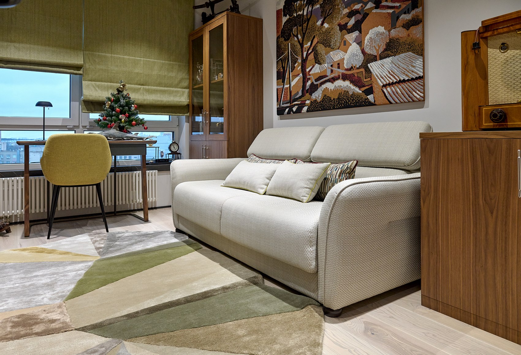 Мягкая мебель (кроме дивана в гостиной): диван в кабинете, диван и кровать в детской и кровать в спальне были изготовлены под наши эскизы и габариты из тканей купленных в компании МастерДом.