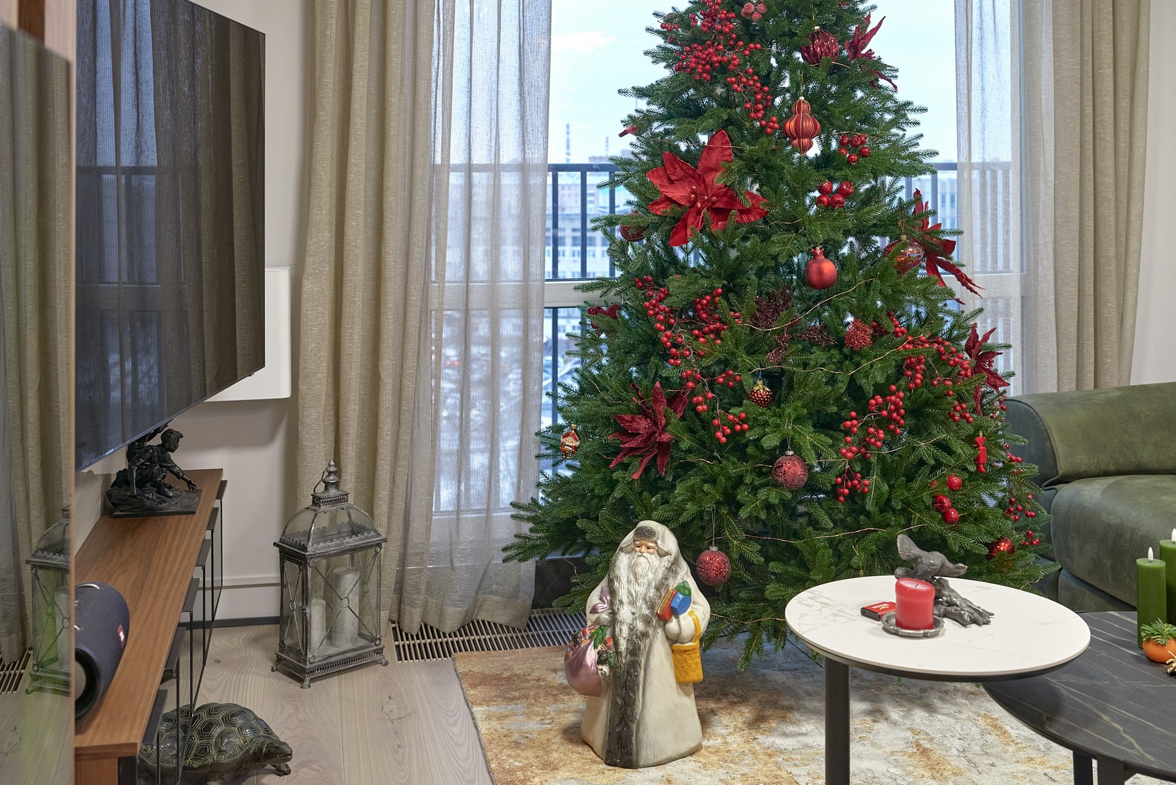 В зоне тв в гостиной мы использовали крупноформатный керамогранит, который установлен от пола до потолка. Сложный монтаж (с предварительной подрезкой на производстве) с помощью рекомендованных специалистов по крупноформату.