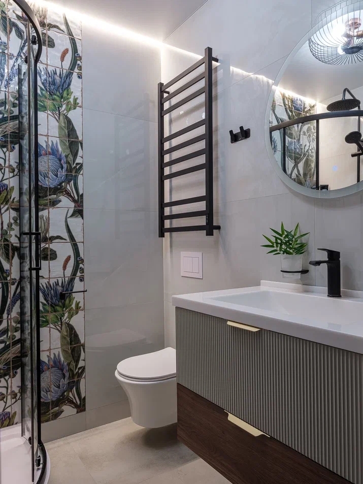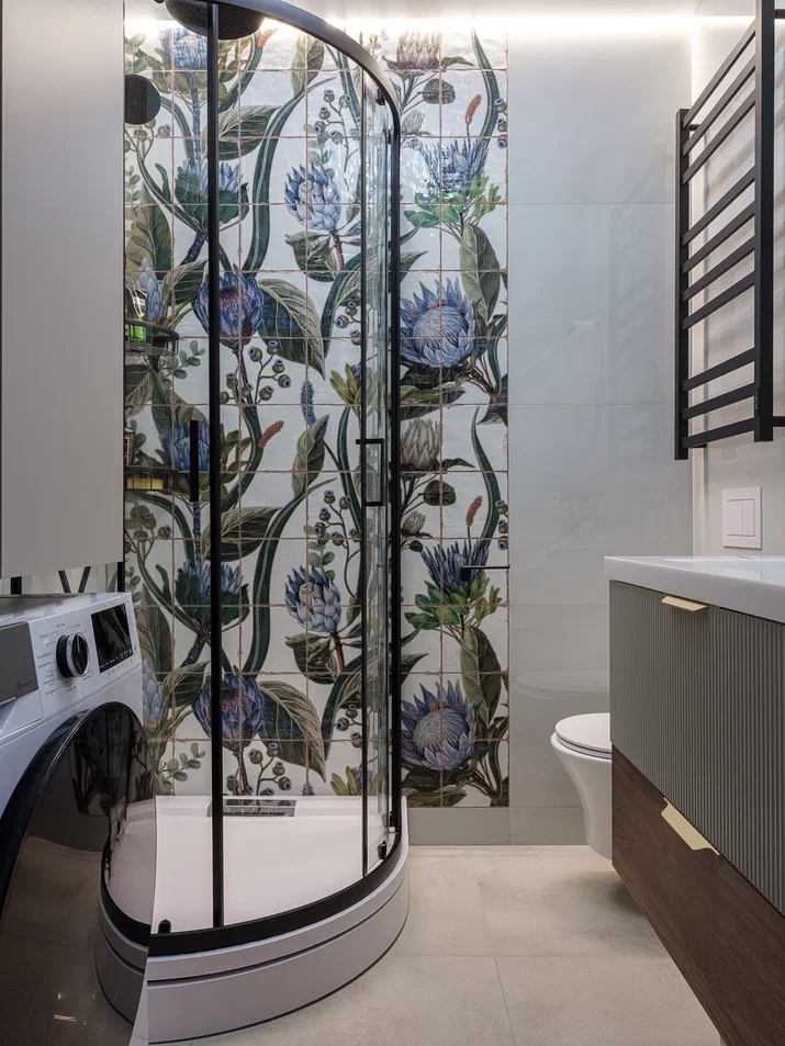Основным акцентом здесь является стена в душевой зоне, украшенная крупными плитками с ярким ботаническим принтом. Элегантные изображения экзотических цветов, таких как протеи, создают динамичный и живописный фон, наполняя пространство энергией природы и утончённой эстетикой.