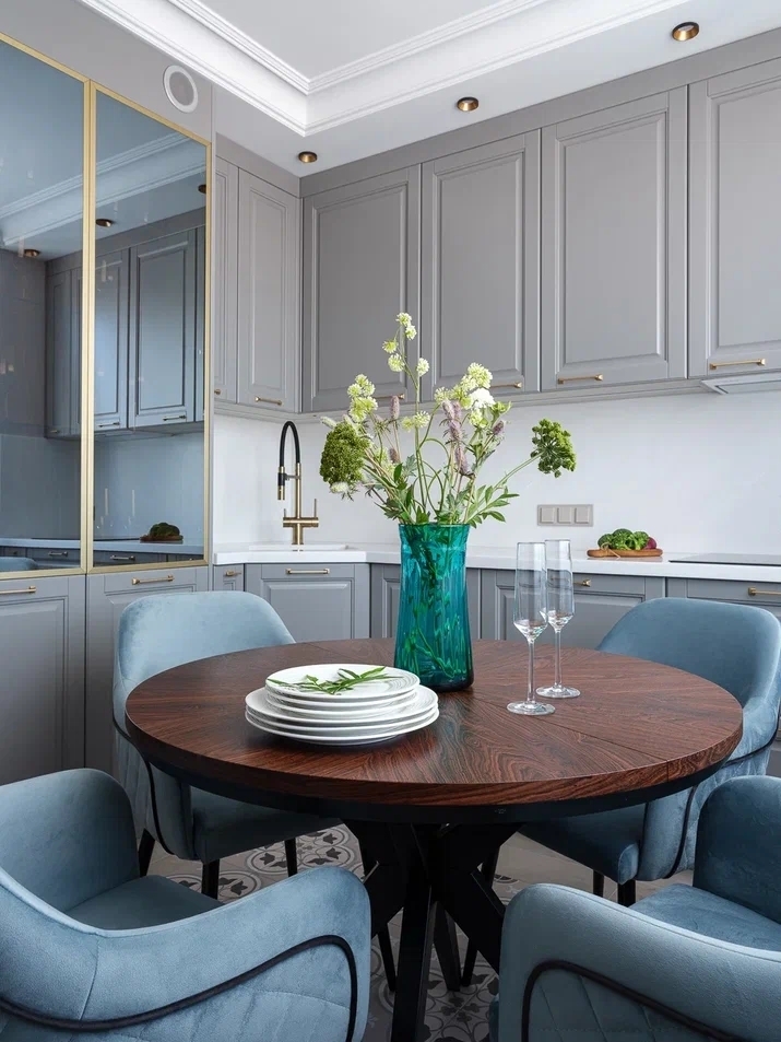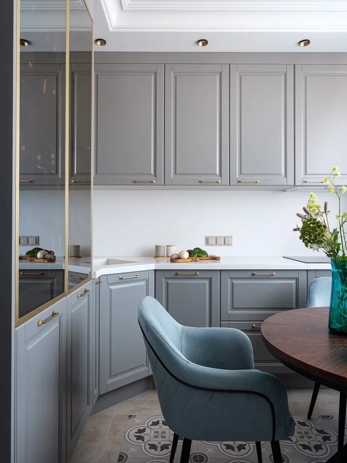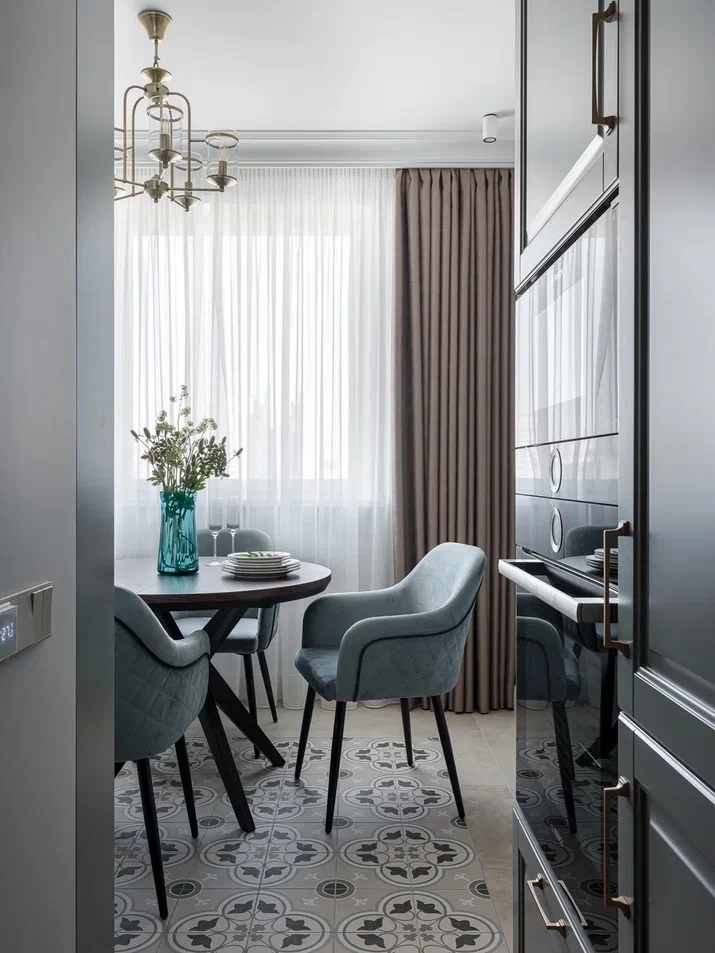 Кухня, в квартире на Пражской, обращает на себя особое внимание благодаря дизайну пола — керамическая плитка с винтажным узором придает помещению характер и индивидуальность, играя на контрасте с лаконичностью остального интерьера.