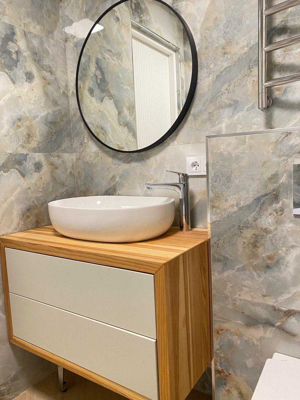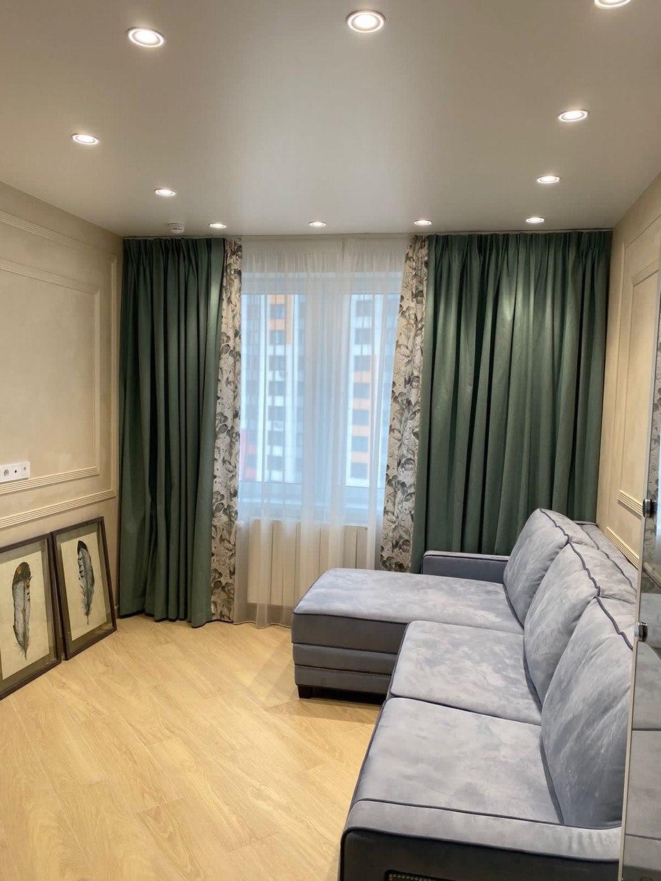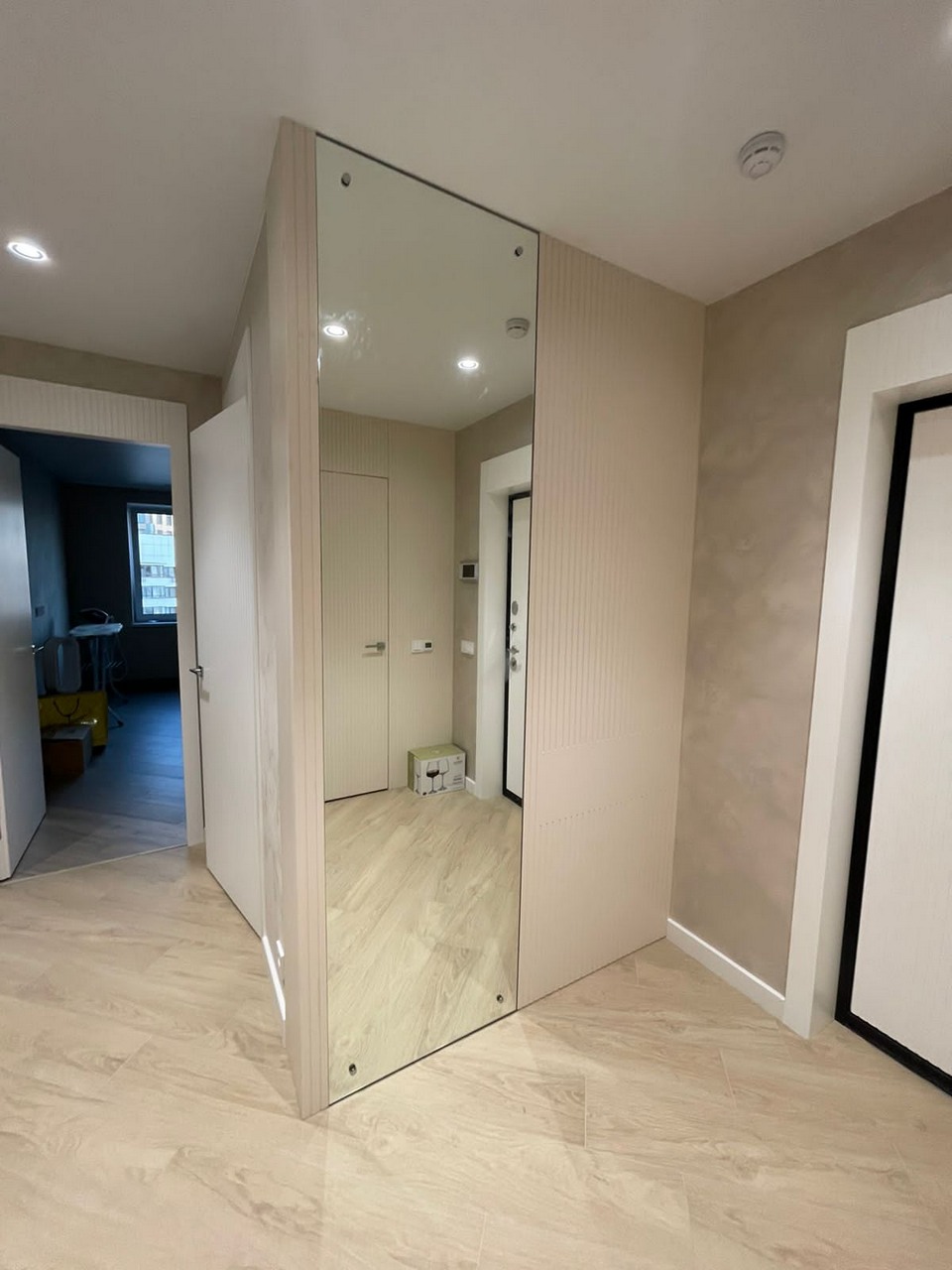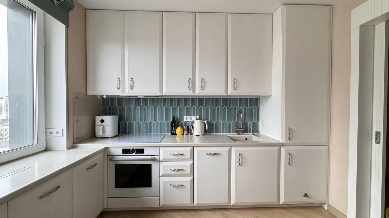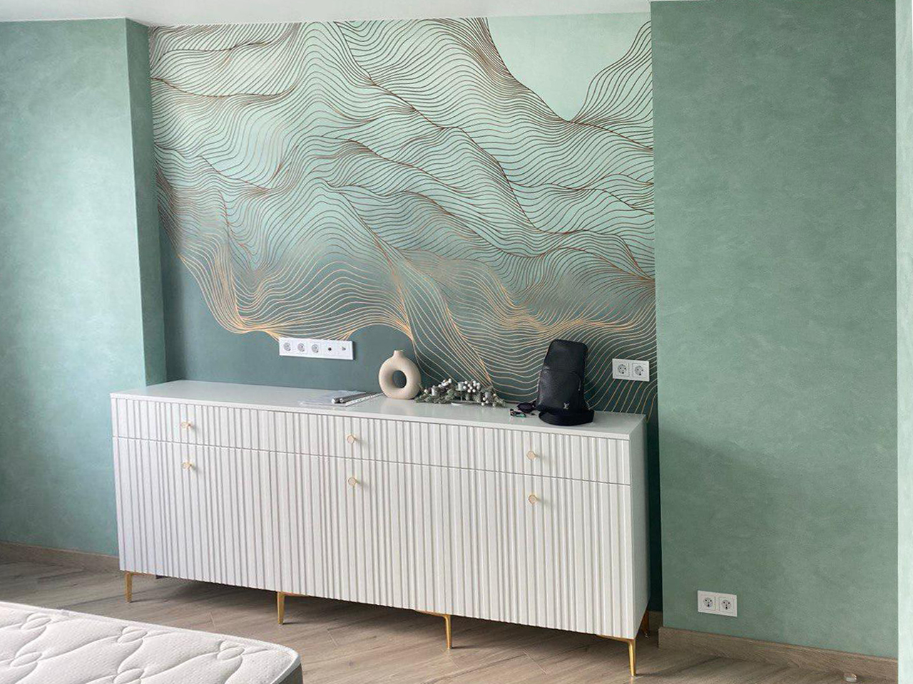 В интерьерах квартиры использовалась краска Swiss Lake, заколлерованная по палитре.
