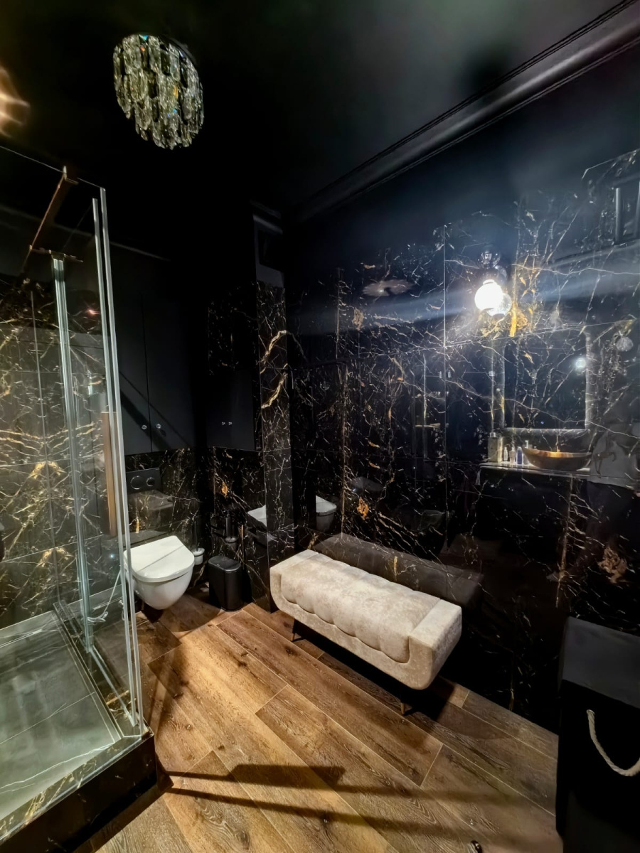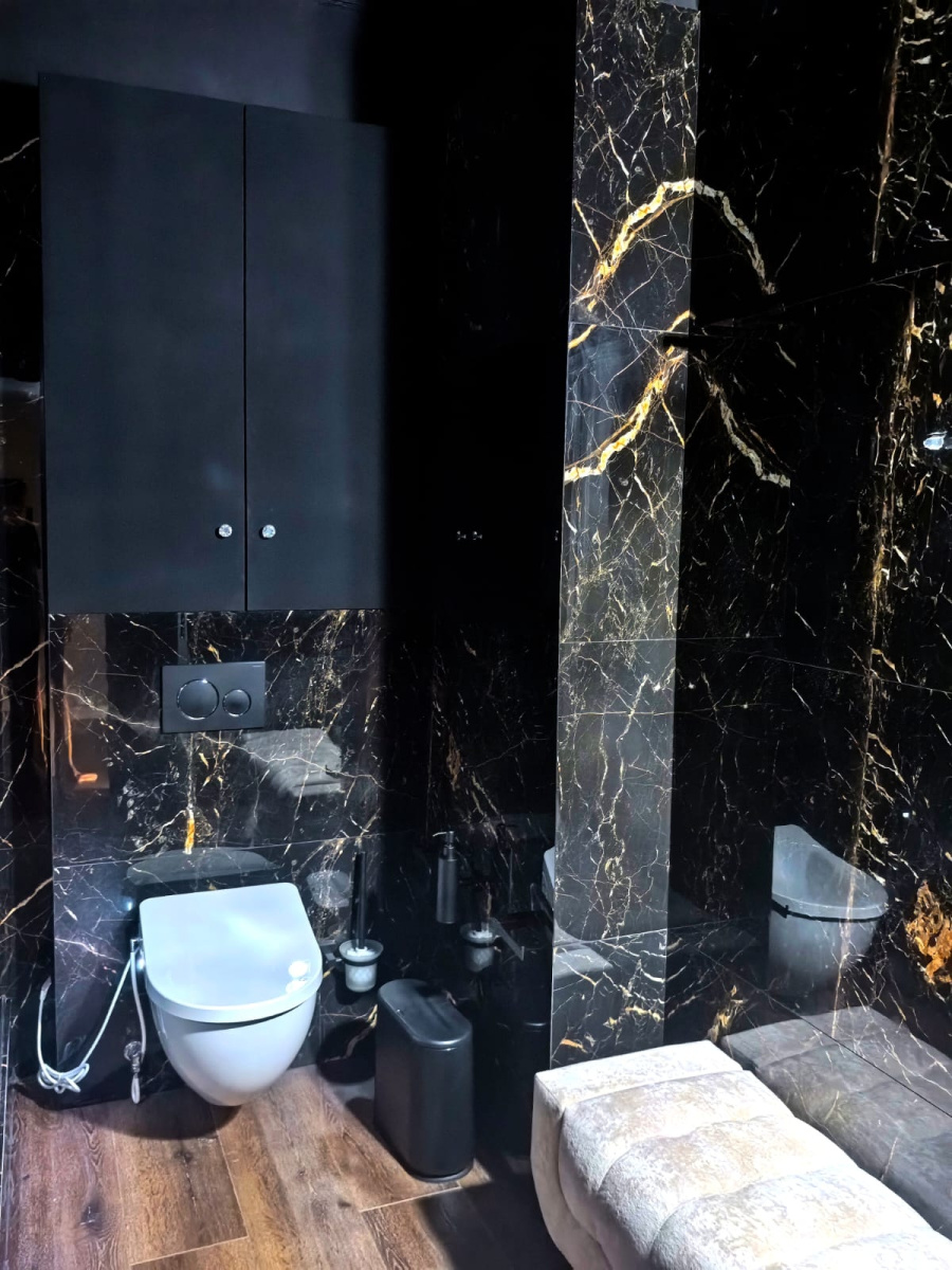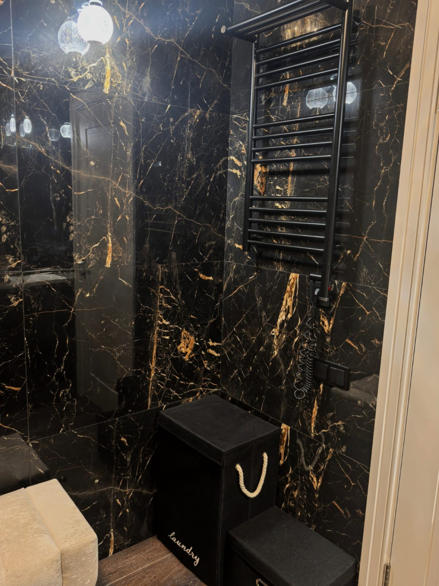 Гармонию комнаты продолжает керамогранит под дерево на полу, который смягчает интенсивность черного мрамора, добавляя пространству естественный, заземляющий элемент. Уютная скамейка с мягкой обивкой, расположенная рядом со светильниками, приглашает к минутам отдыха, сочетая функциональность с роскошью.