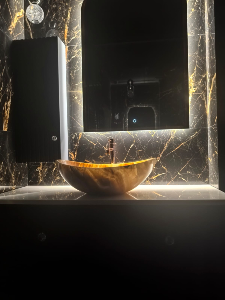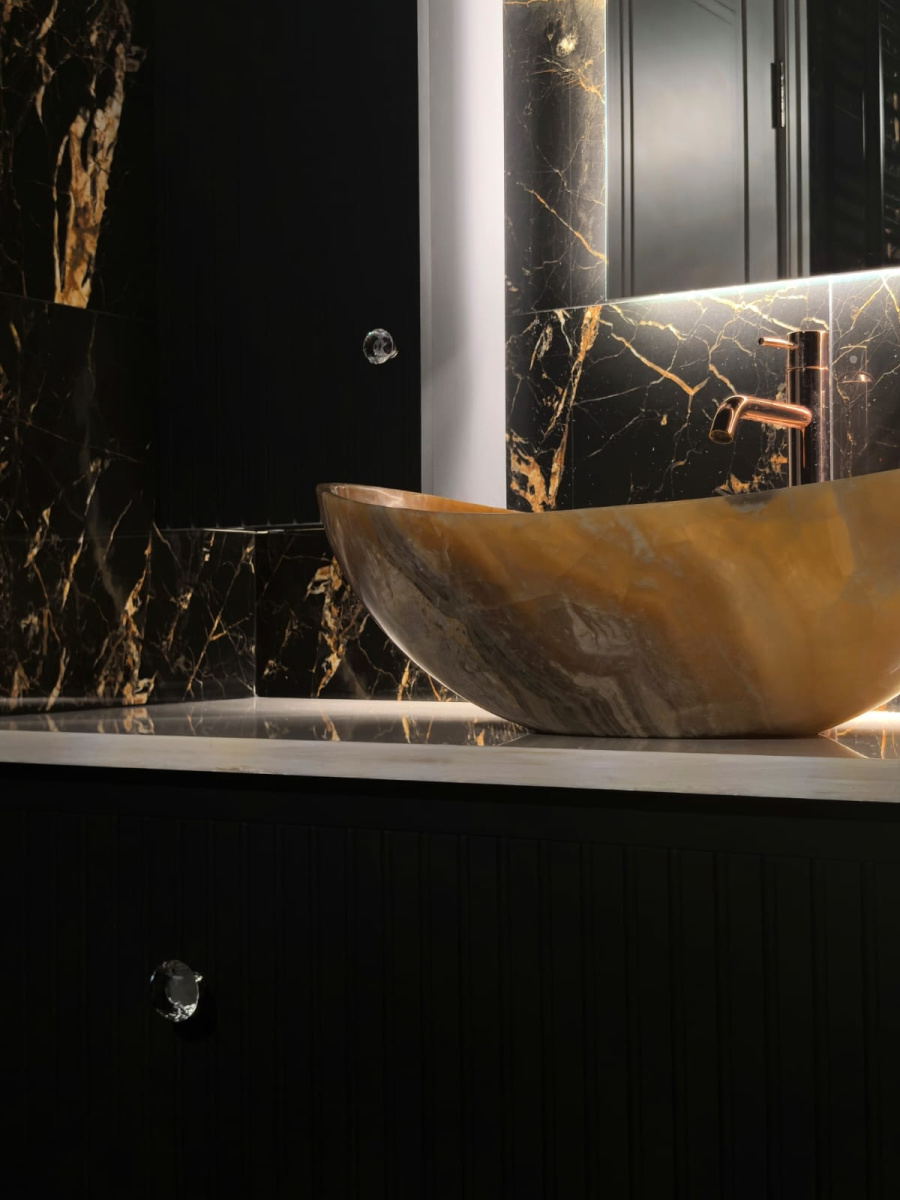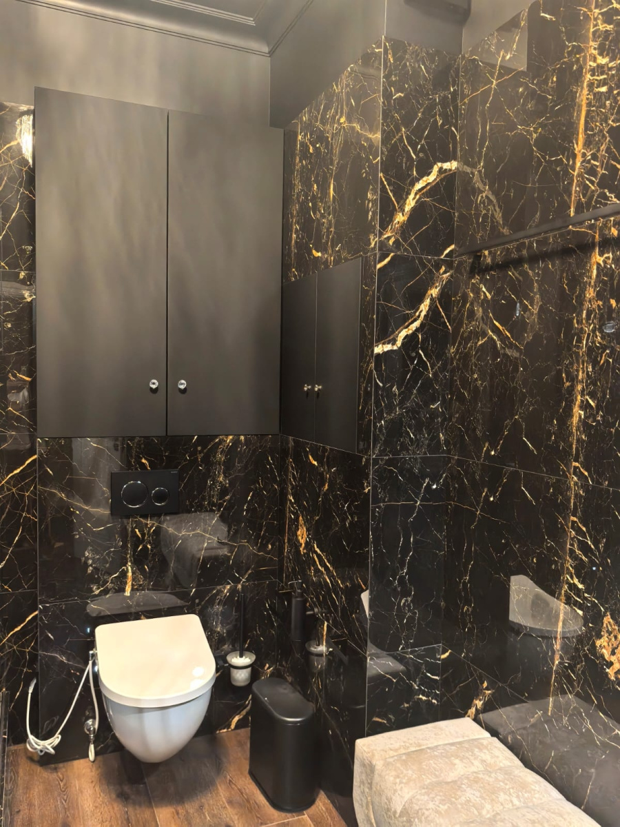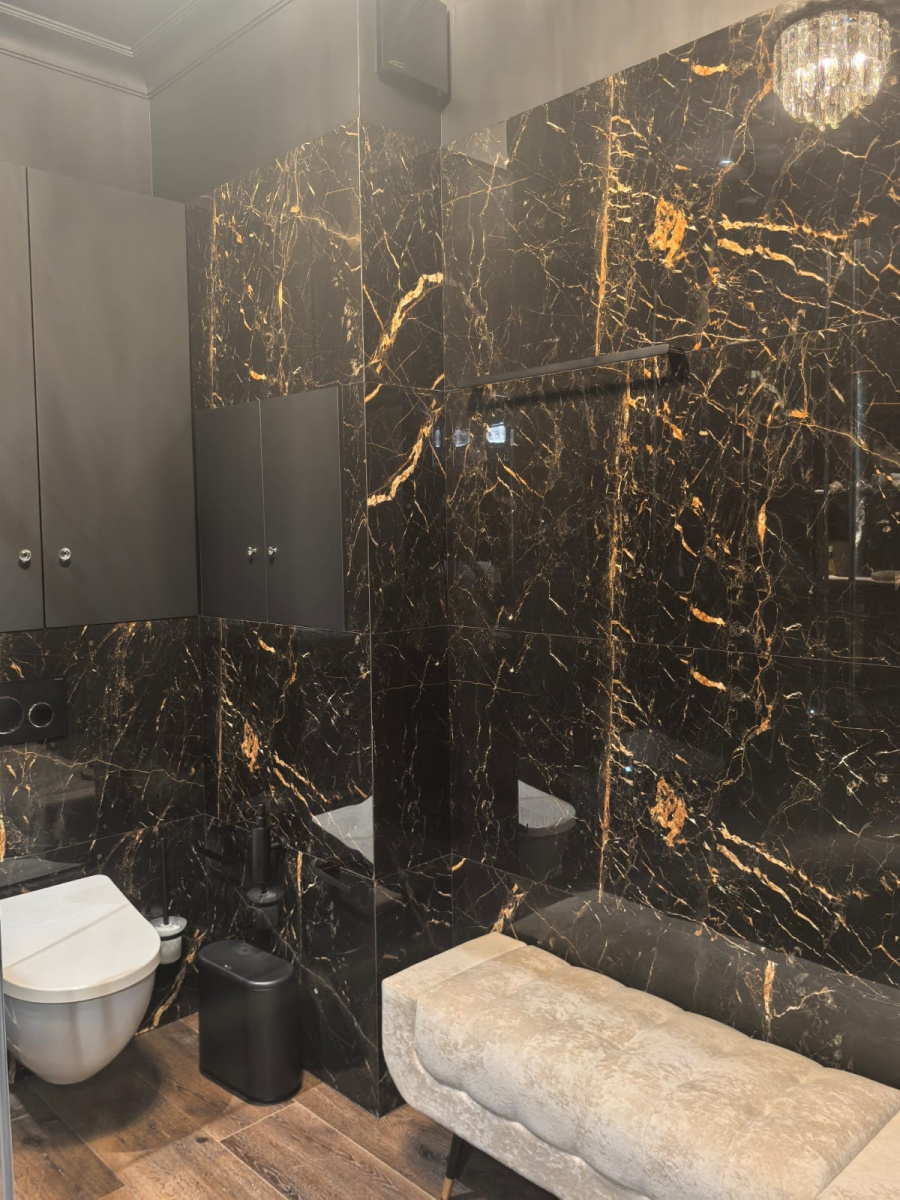 Гармонию комнаты продолжает керамогранит под дерево на полу, который смягчает интенсивность черного мрамора, добавляя пространству естественный, заземляющий элемент. Уютная скамейка с мягкой обивкой, расположенная рядом со светильниками, приглашает к минутам отдыха, сочетая функциональность с роскошью.