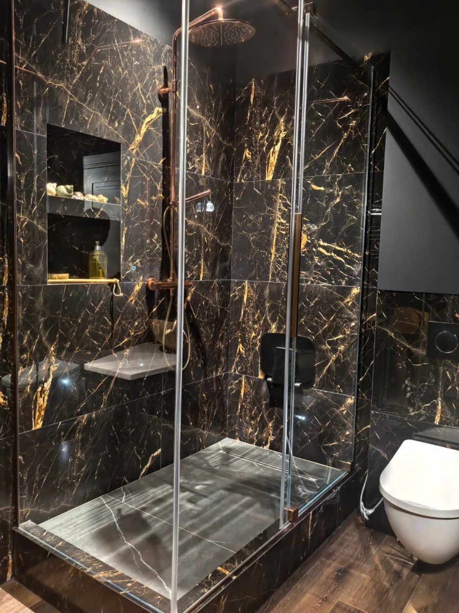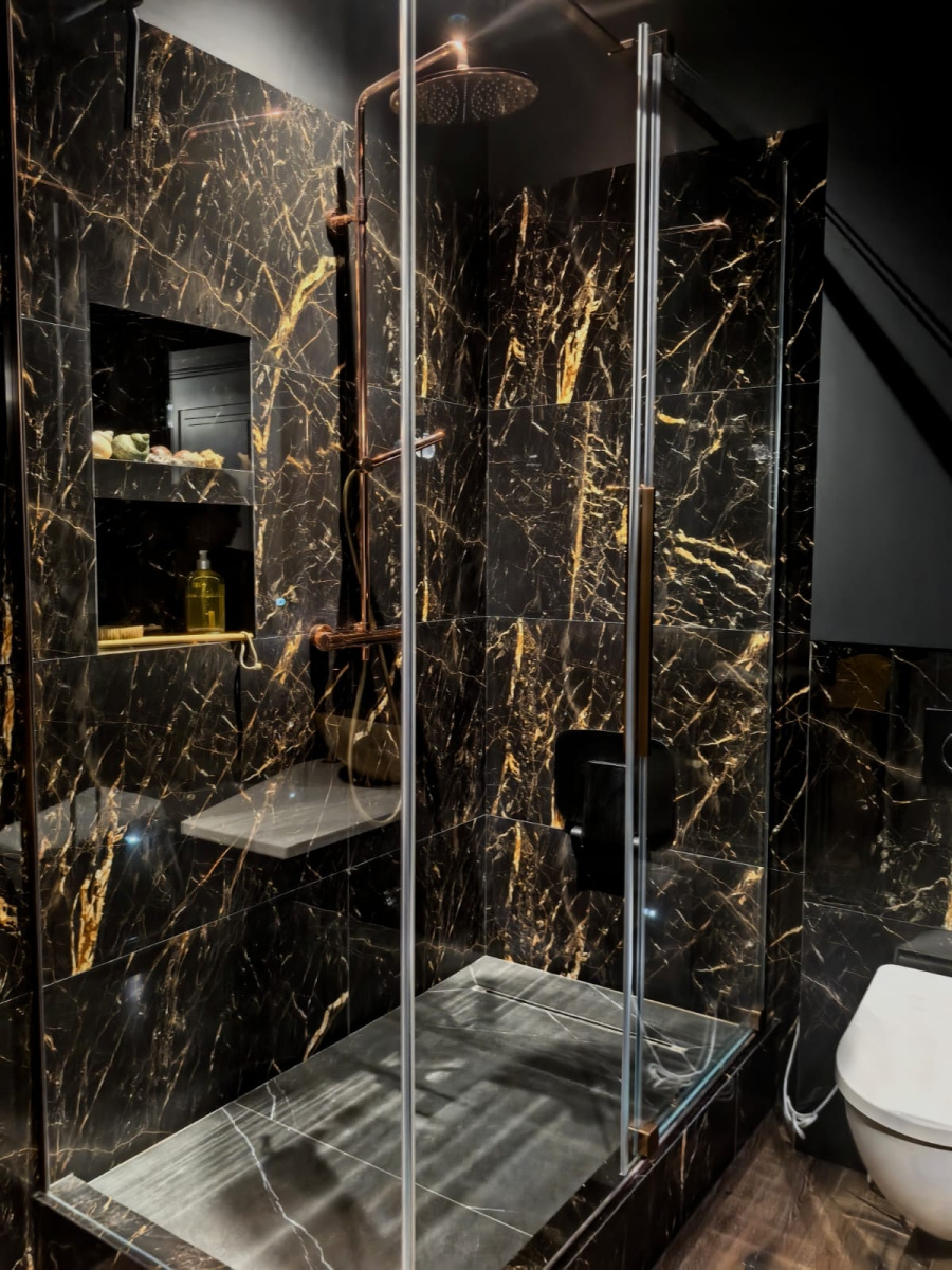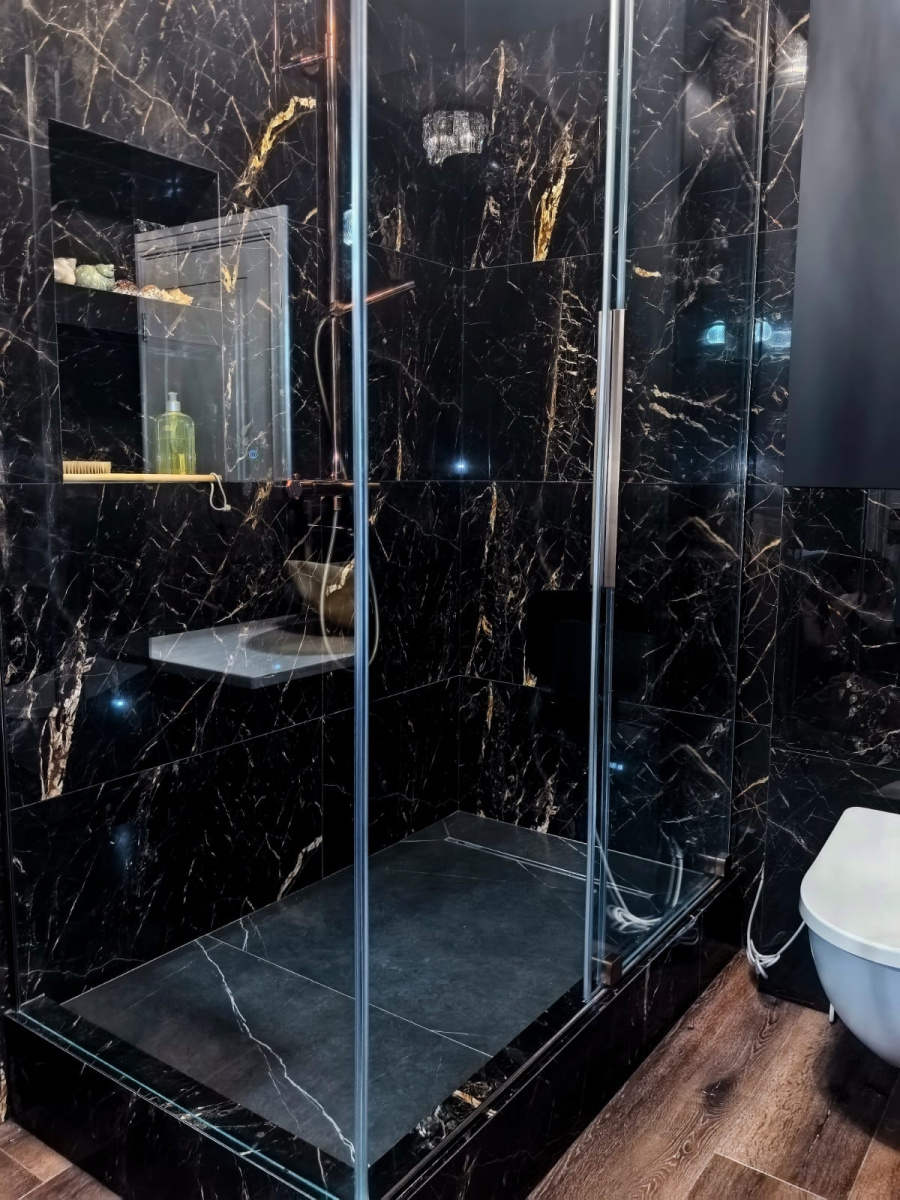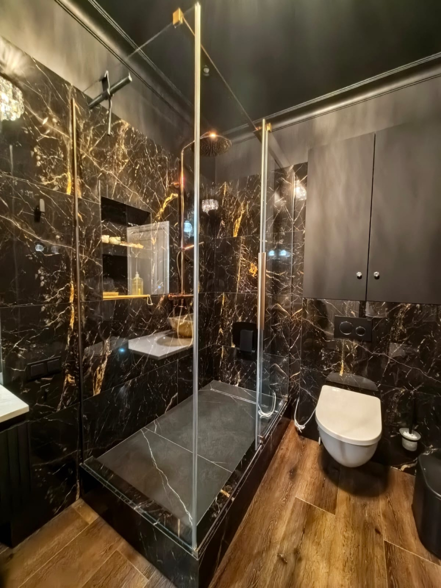 Черные мраморные стены с прожилками золота создают поразительный визуальный контраст, который мгновенно очаровывает. Душевая зона, окруженная гладкими стеклянными панелями, представляет собой современный шедевр, который отражает окружающий мрамор, усиливая драматический эффект пространства. Матово-черные светильники тонко сливаются с богатым текстурированным фоном, а золотые акценты добавляют атмосфере королевский оттенок.