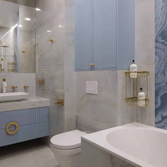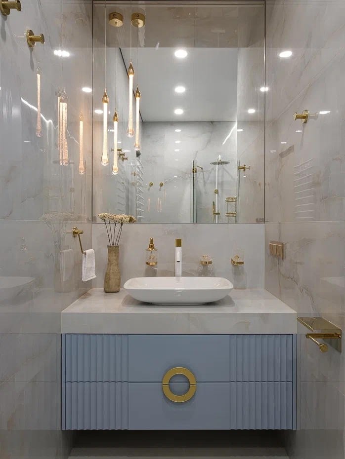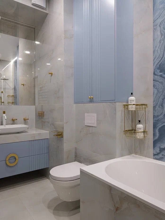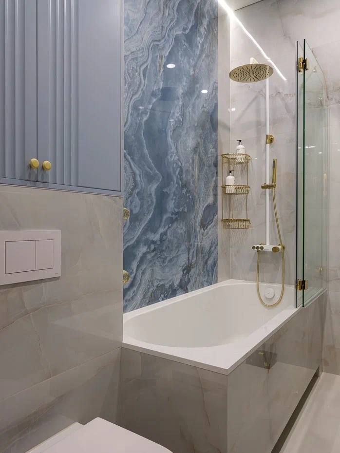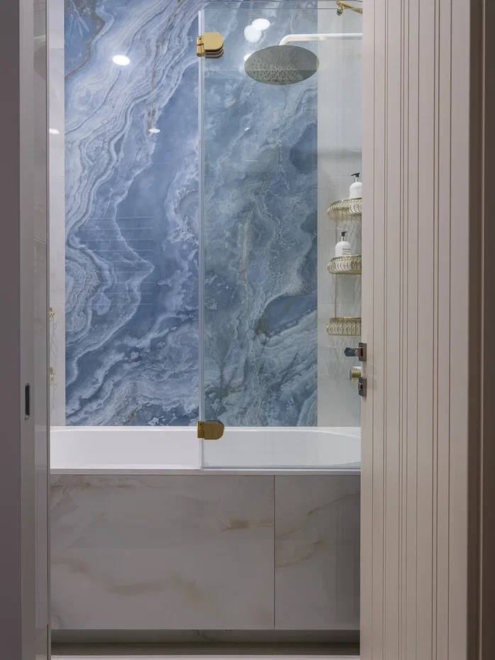 В ванной комнате был использован слэб широкоформатного керамогранита, создающего настроение бурлящей морской волны, а Neodom Onix Pro Bianco Polished (60x120)см на остальных стенах — создает ощущение покоя и штиля.