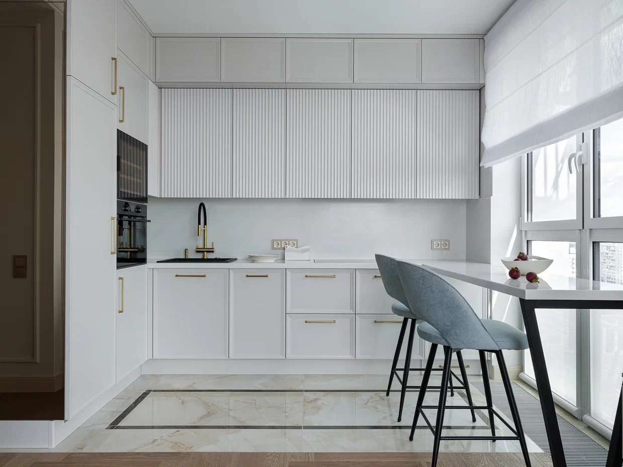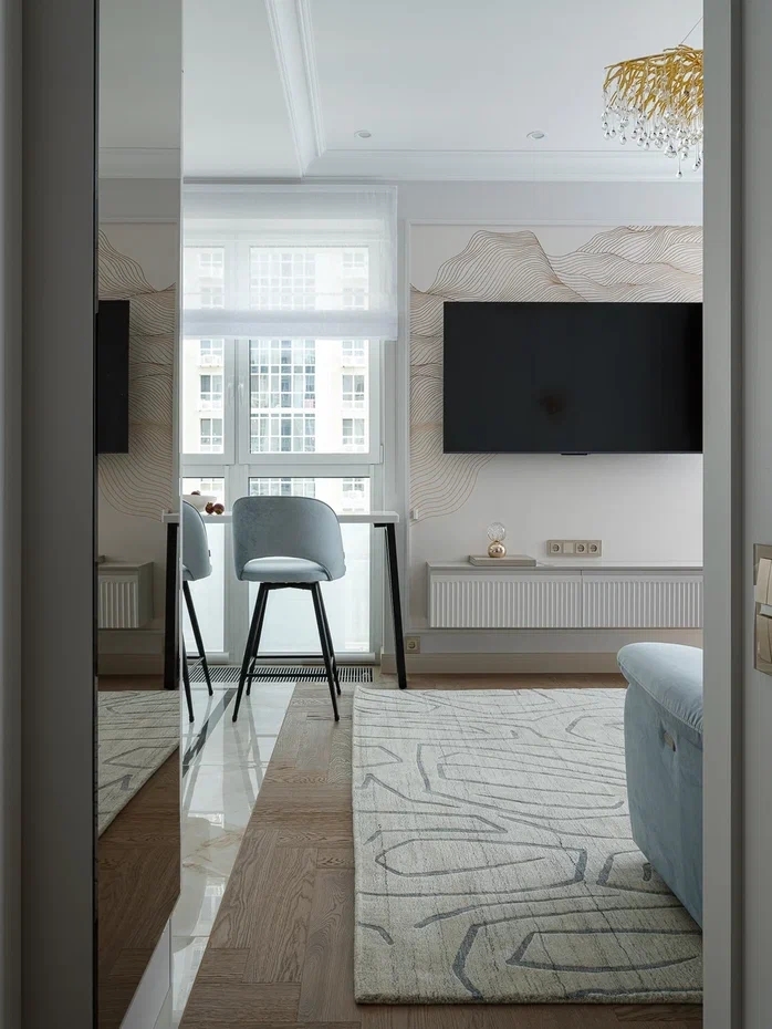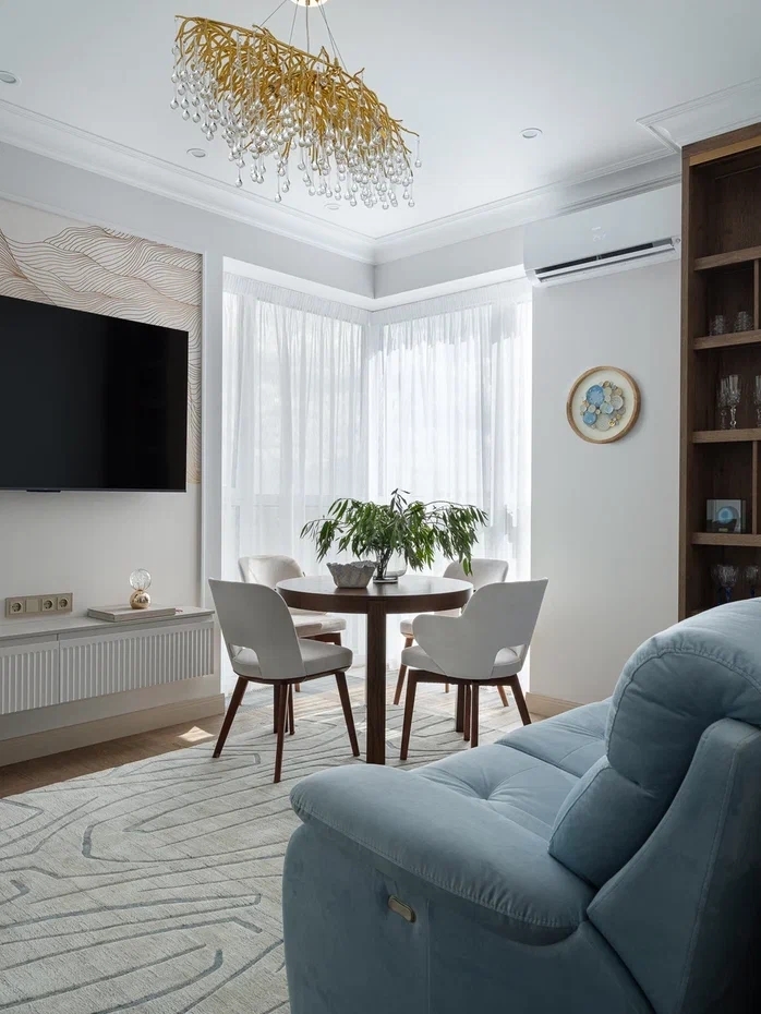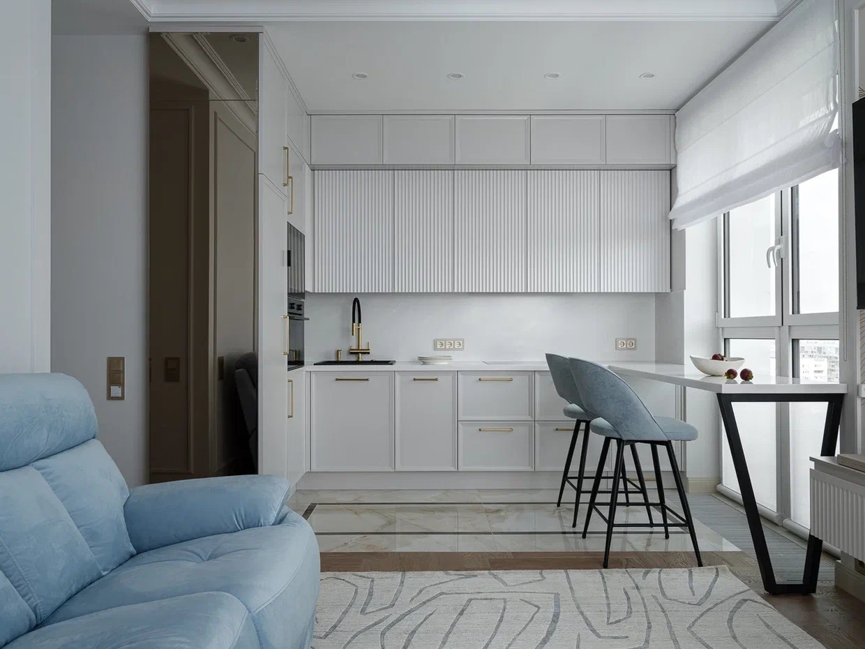 Просторное светлое помещение наполнено воздухом и светом, благодаря большим окнам и мягкой палитре интерьера. Монохромная гамма светло-серых и белых оттенков создает гармоничное спокойствие, в то время как голубой диван и барные стулья становятся изящными акцентами, добавляющими нотку уюта.