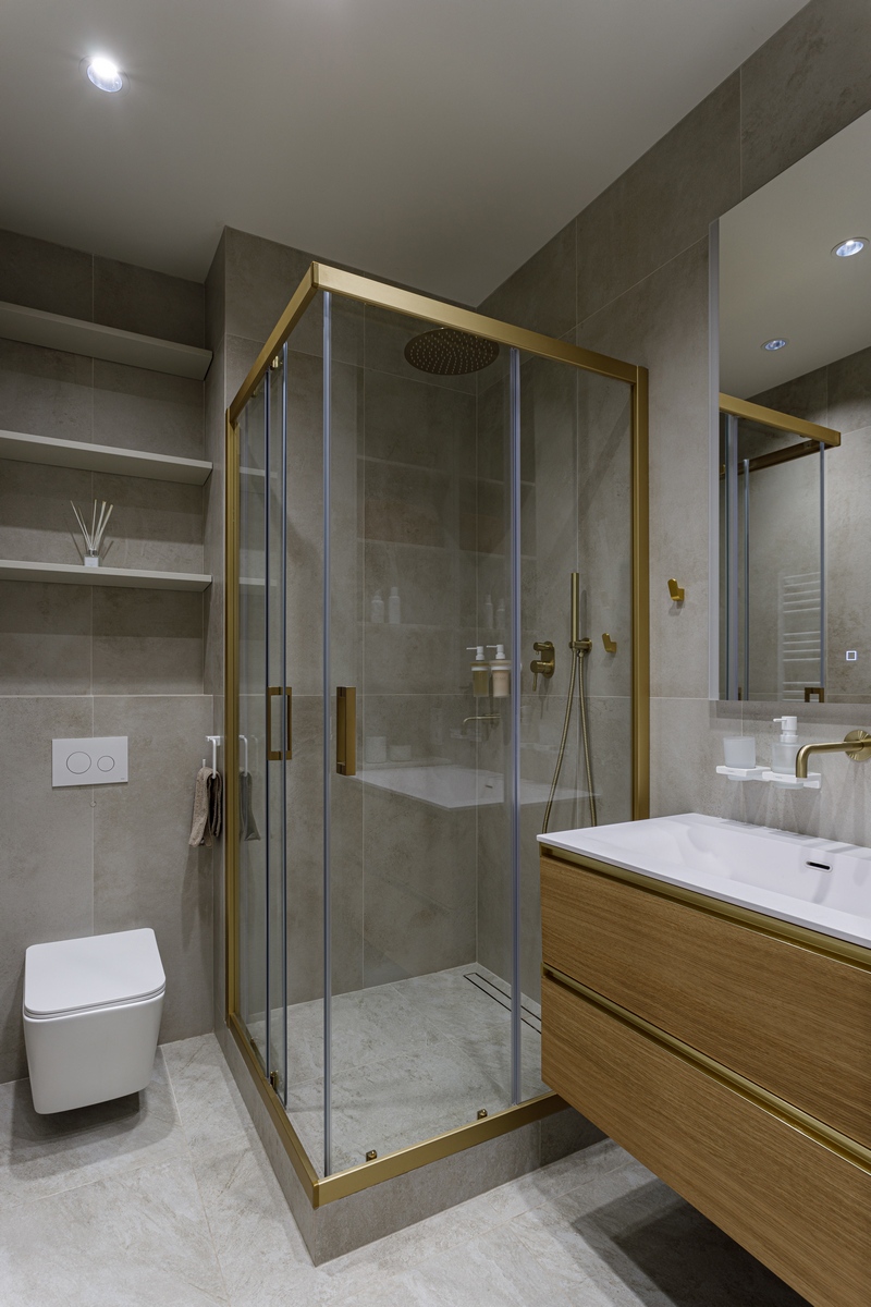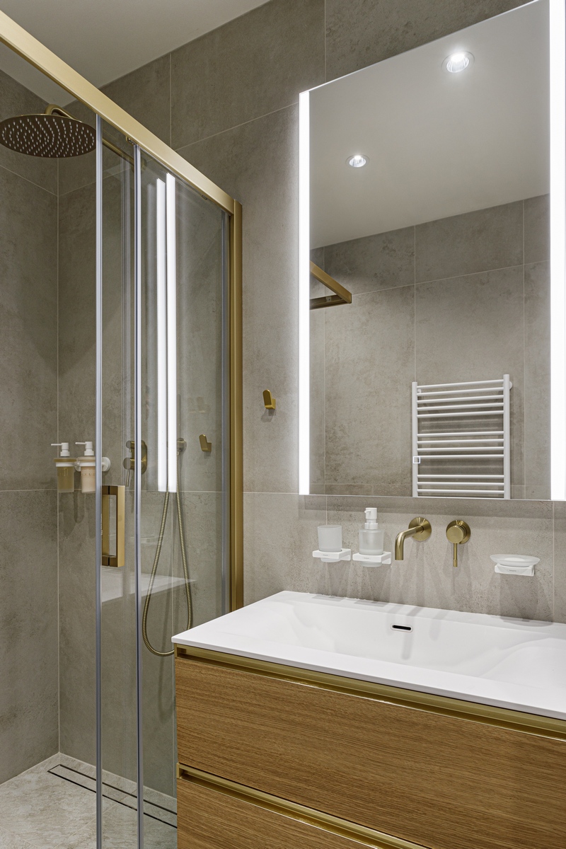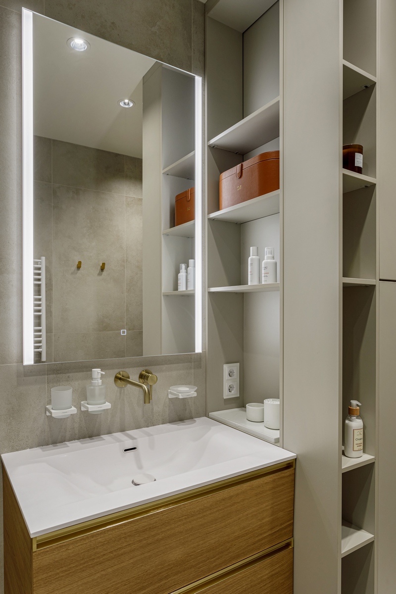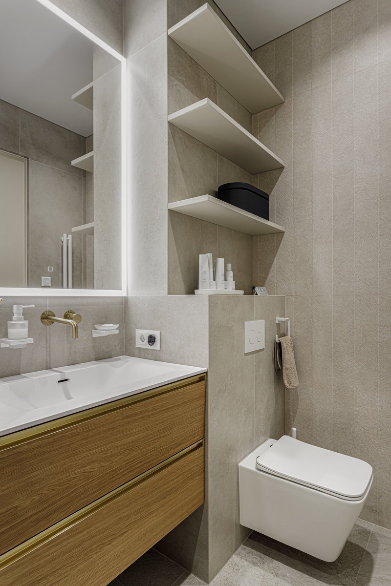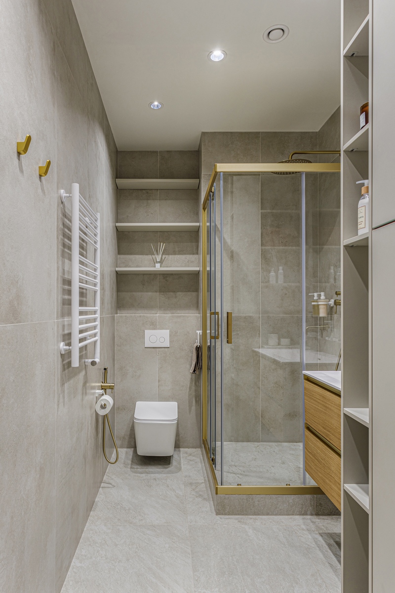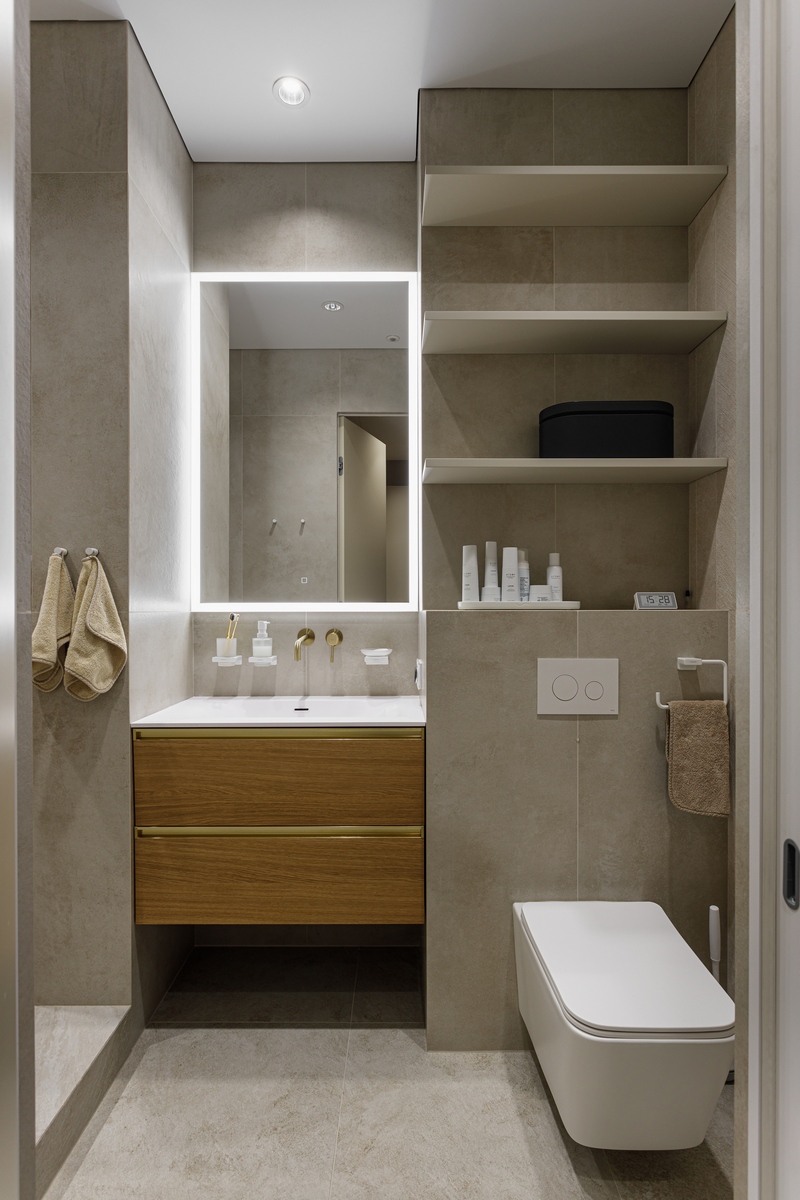 Комната получилась камерной, но визуально воздушной: крупноформатная плитка стирает границы, тёплая латунь и дерево добавляют домашнего уюта, а продуманная система хранения поддерживает идеальный порядок. Ванная отвечает всем требованиям современного ритма мегаполиса, оставаясь местом для расслабления и перезагрузки.