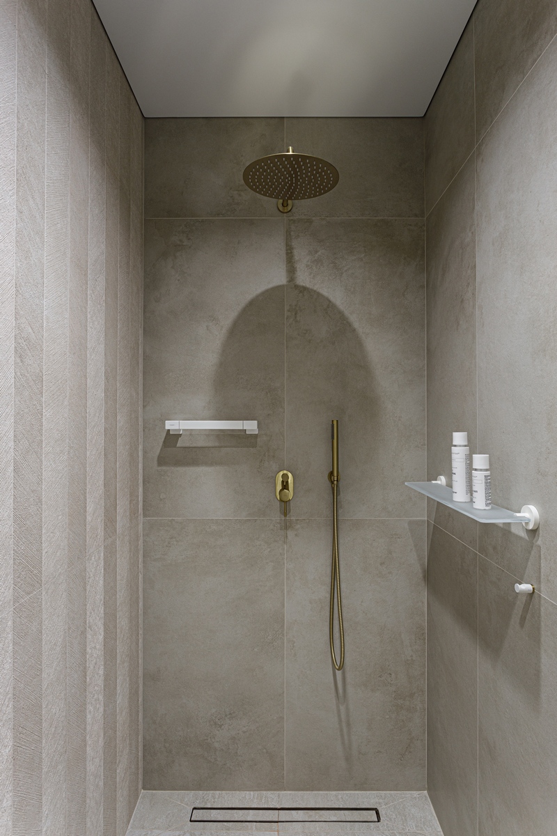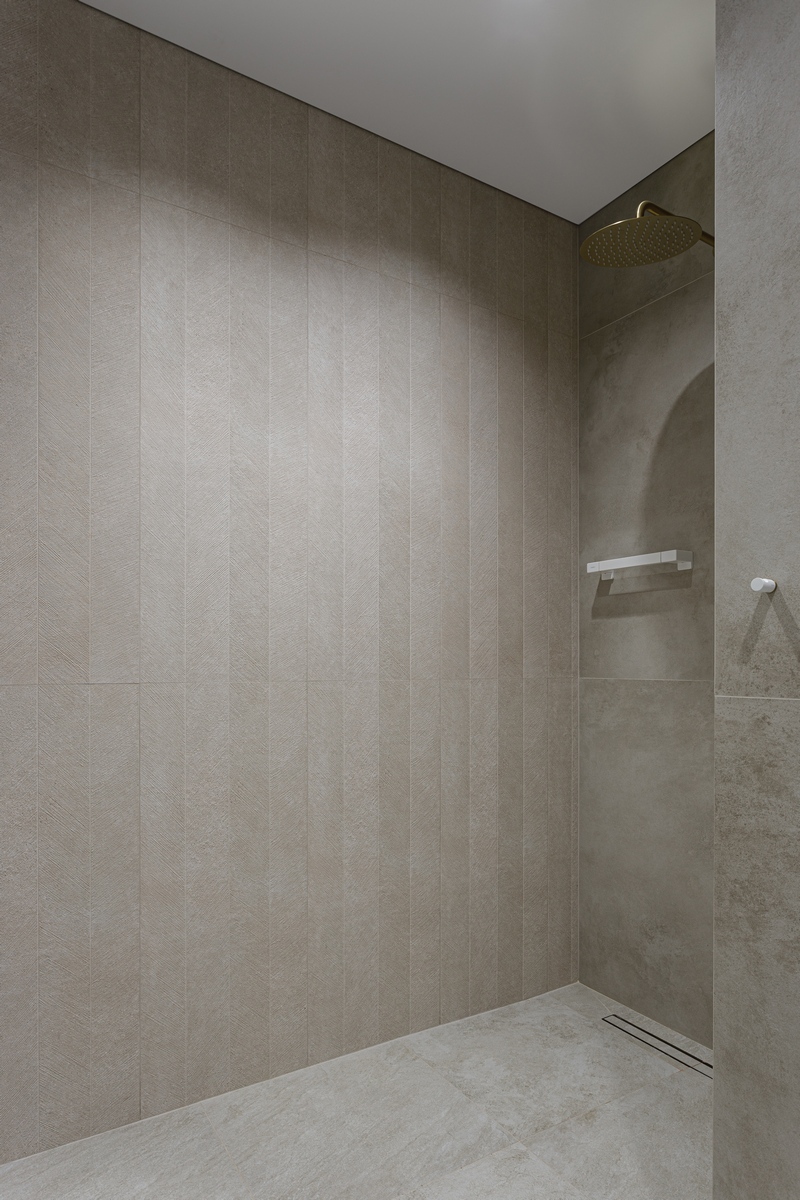 Главная идея — создать спокойное «городское спа», где суровая фактура камня сочетается с теплом латуни и натурального дерева. Нейтральная палитра цемента и прохладного сланца визуально расширяет пространство, а широкоформат 80 × 160 см сводит к минимуму швы и «шум» на стенах.