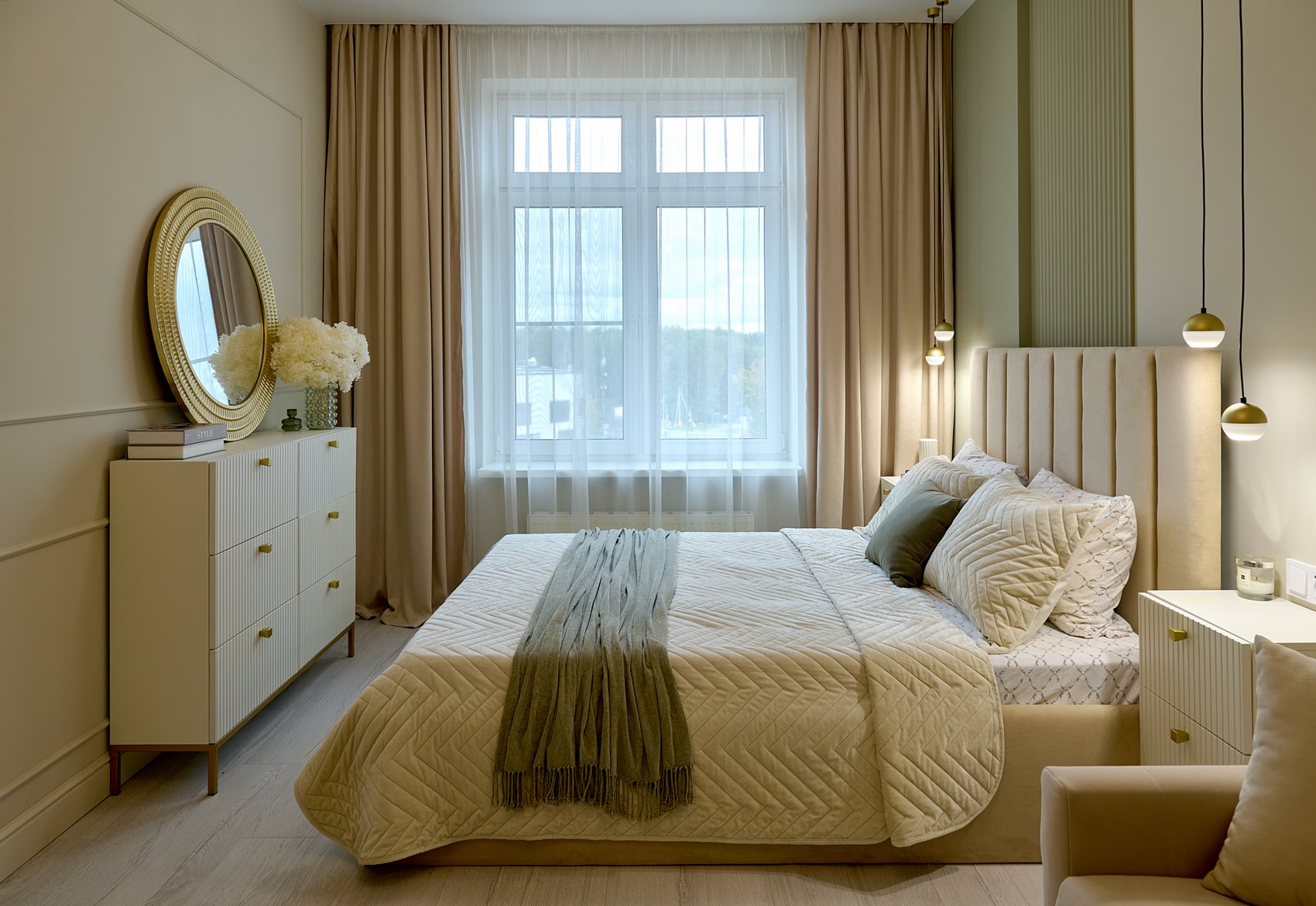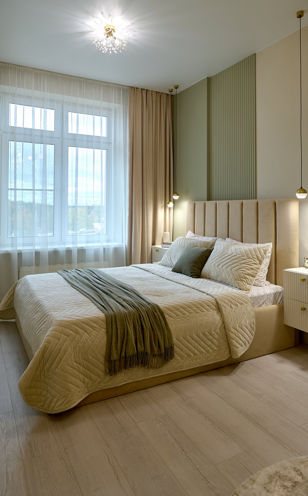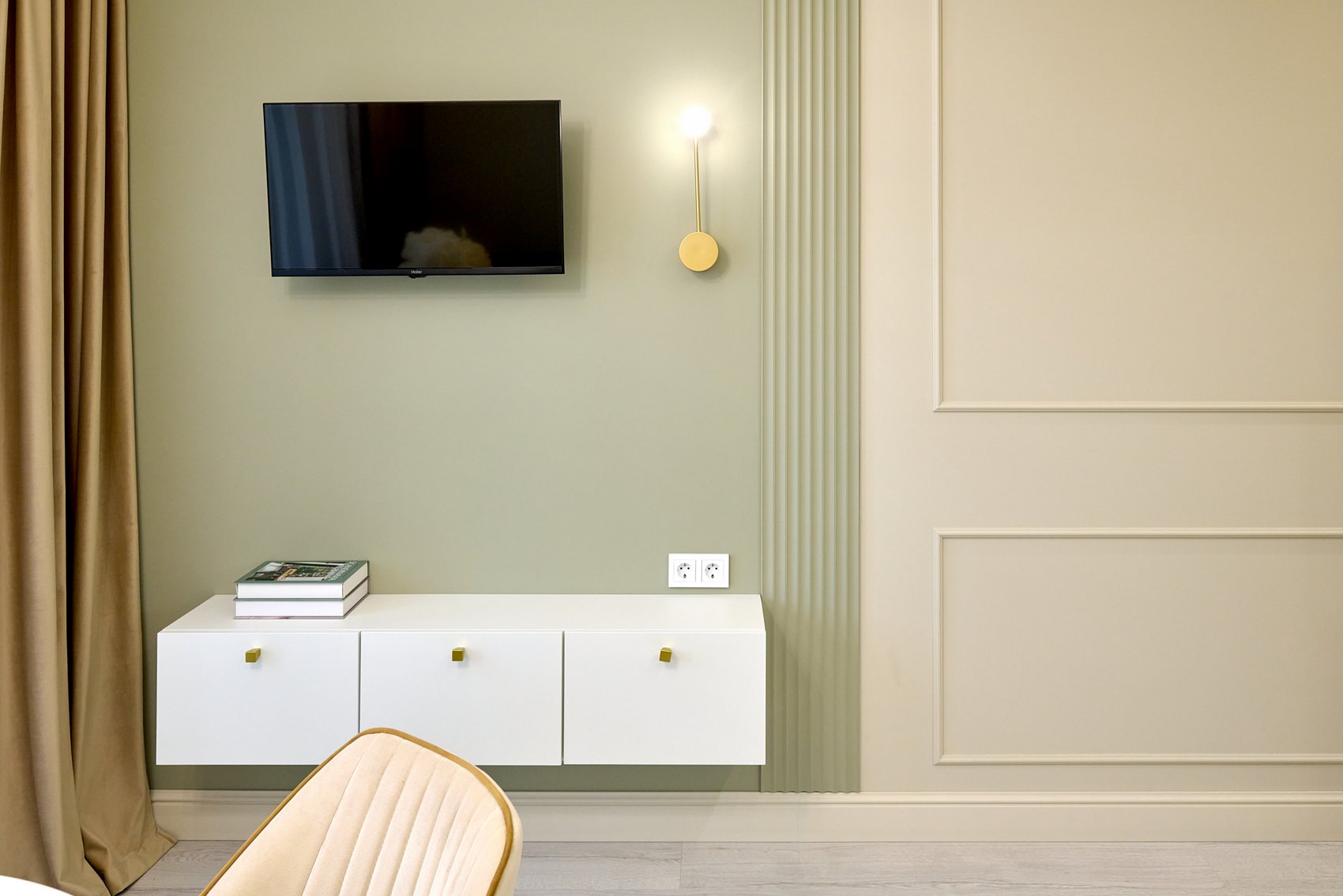 Пространство подчеркнуто светлыми цветами стен, которые визуально расширяют границы и создают спокойную атмосферу. Акцентные декоративные панели на стенах выполнены в оливковом цвете, добавляя изысканный и свежий акцент к общему нейтральному фону.