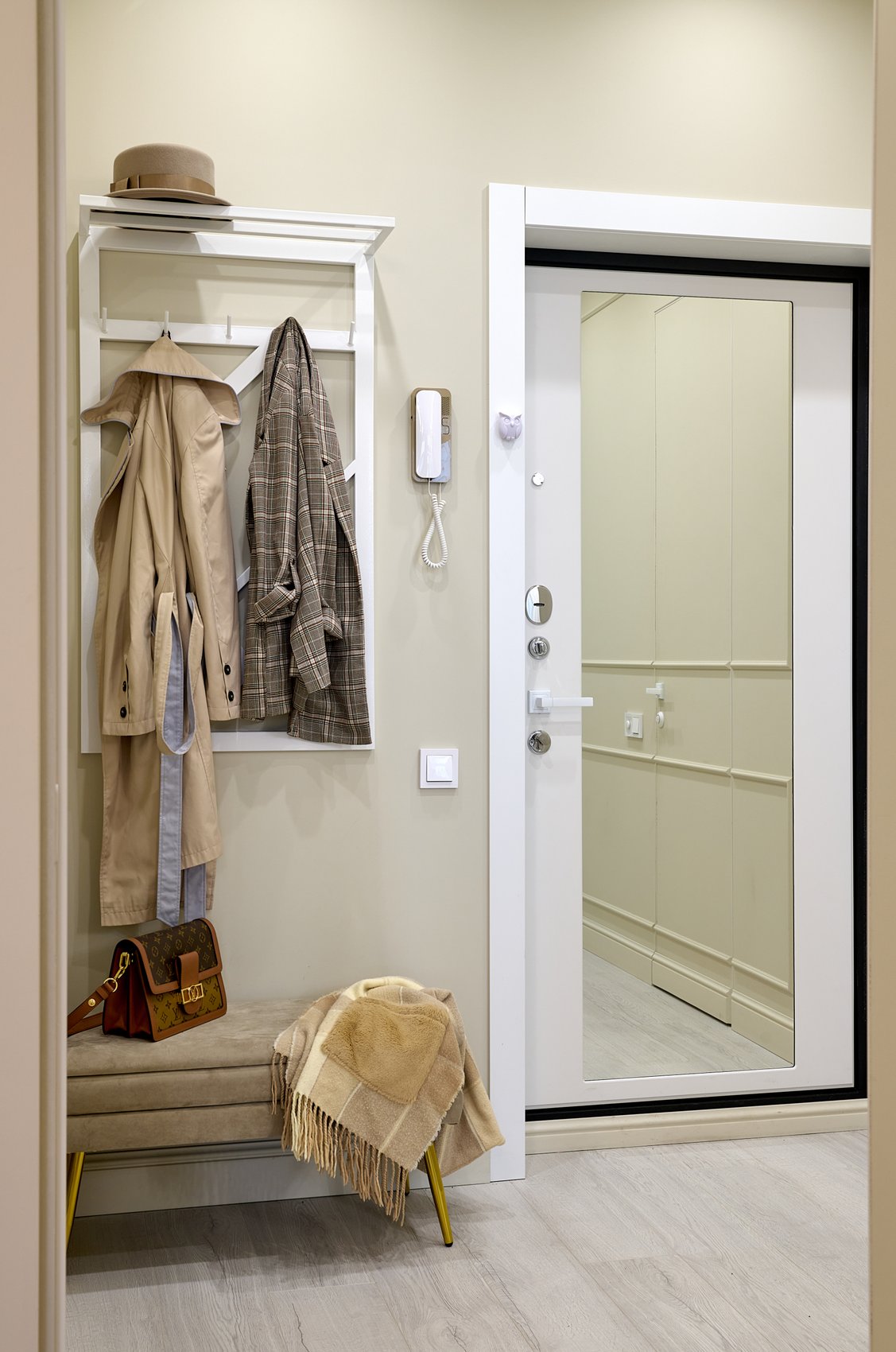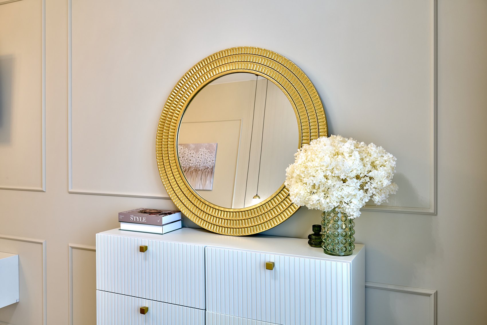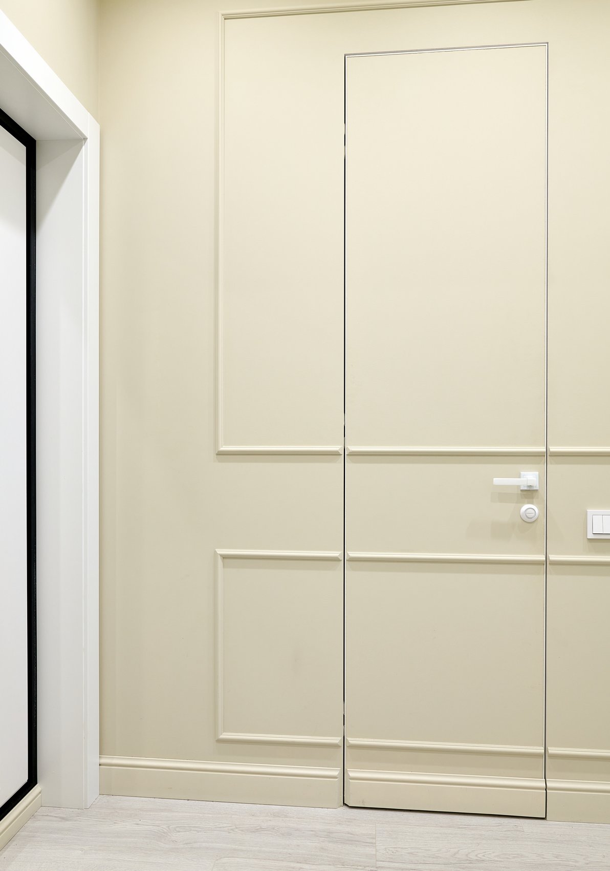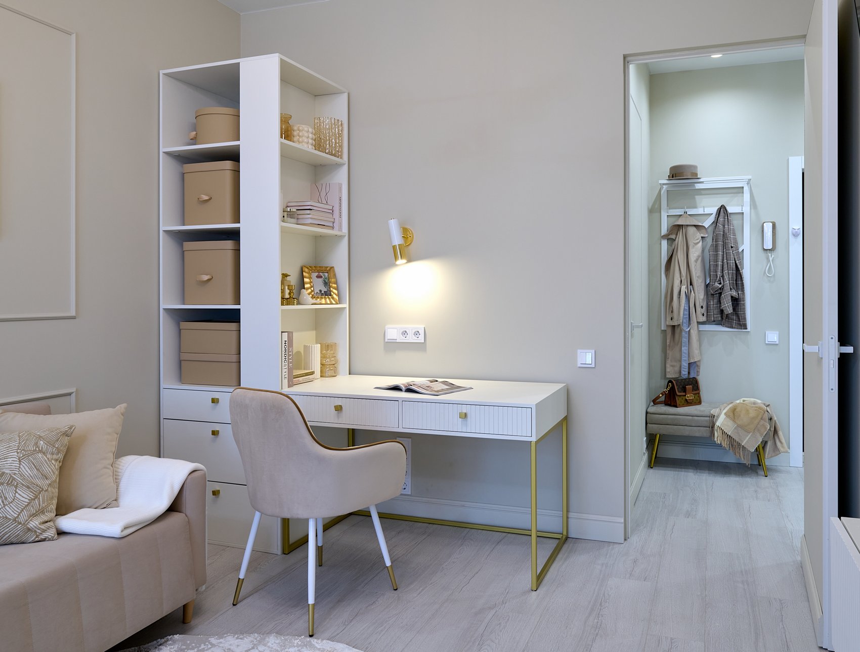 Пространство подчеркнуто светлыми цветами стен, которые визуально расширяют границы и создают спокойную атмосферу. Акцентные декоративные панели на стенах выполнены в оливковом цвете, добавляя изысканный и свежий акцент к общему нейтральному фону.