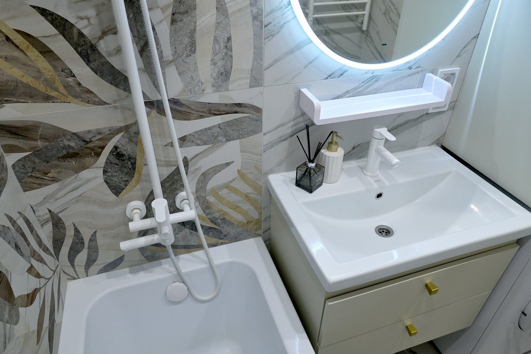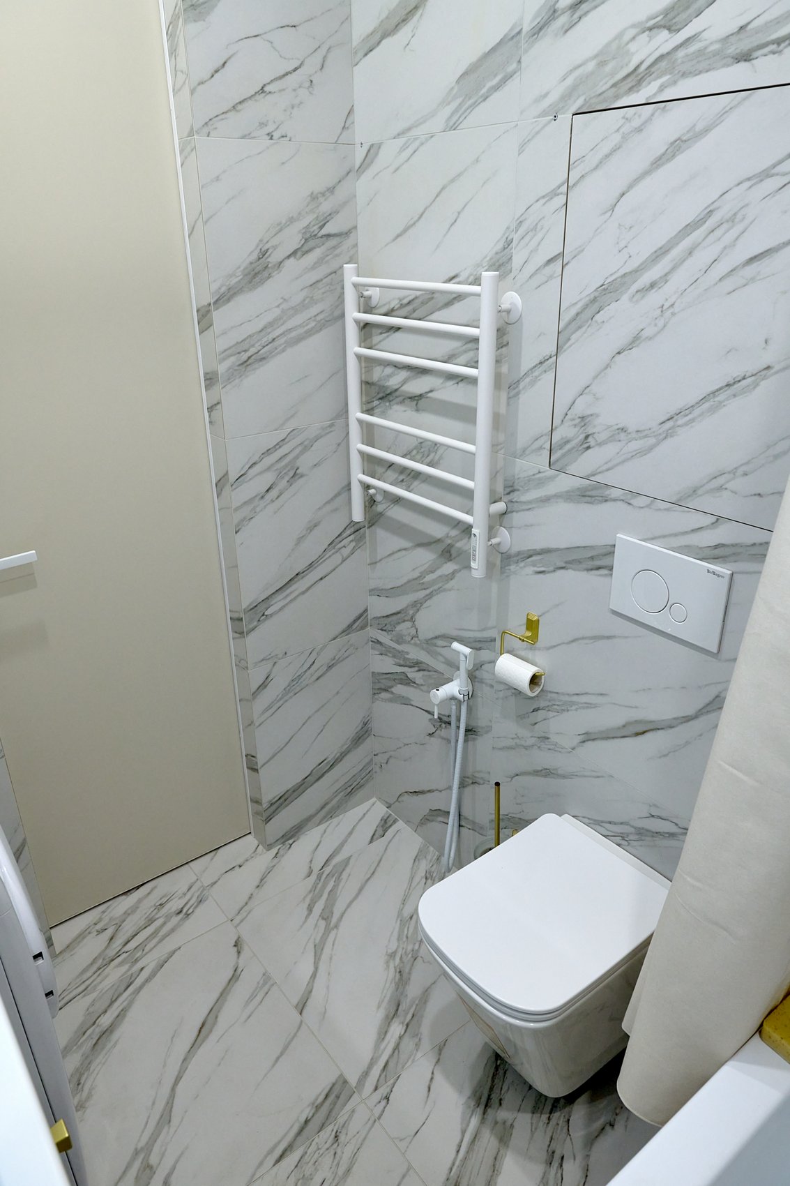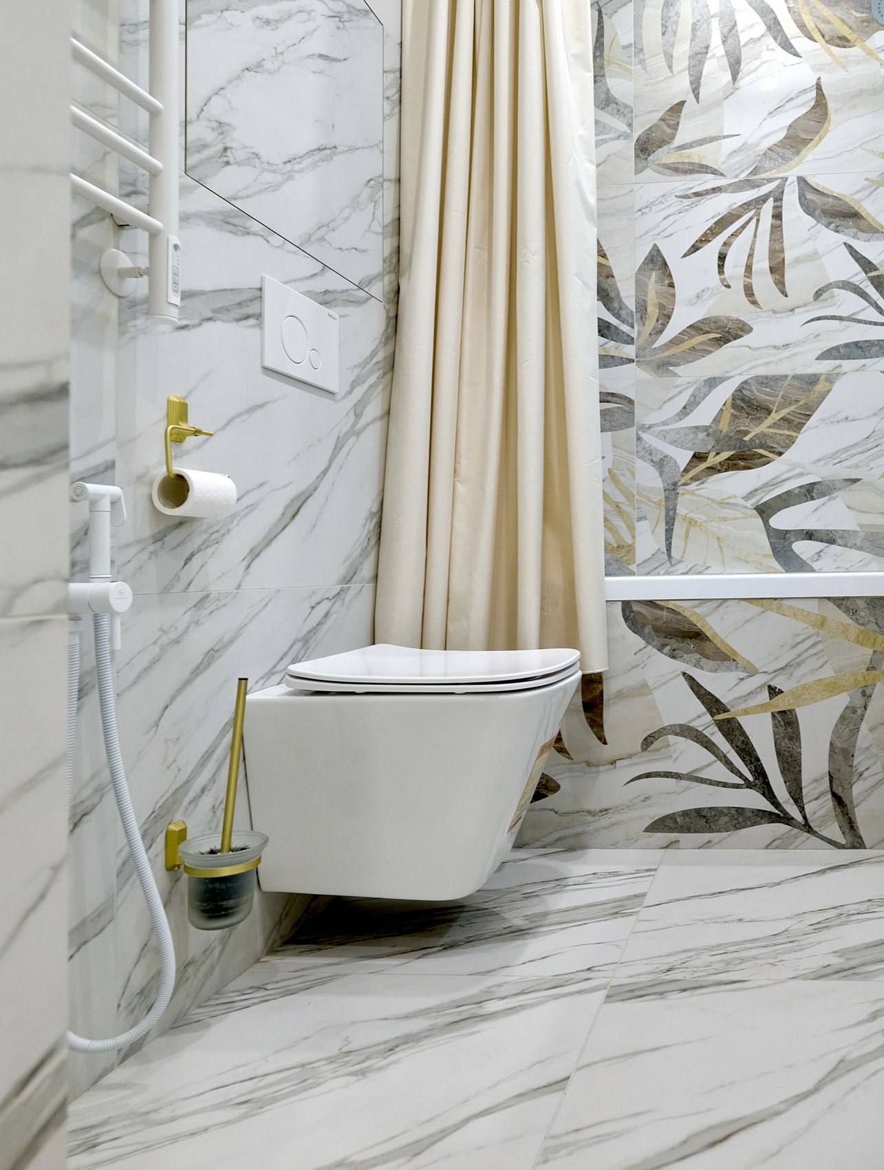 Ванная комната облицована керамогранитом под мрамор в светлых оттенках с минимальным количеством деталей, создавая эффект чистоты и свежести.