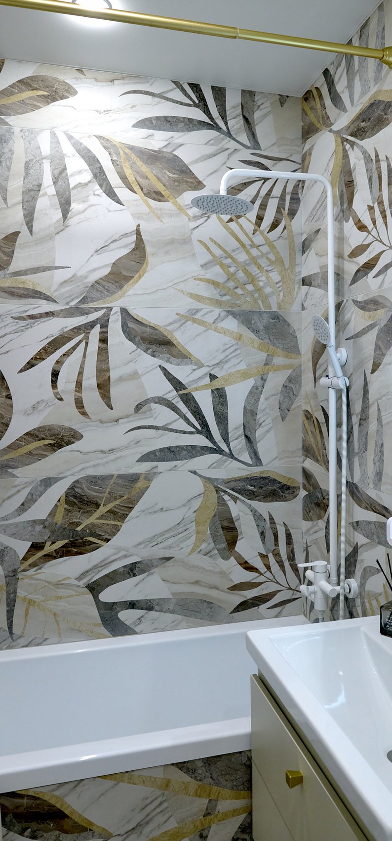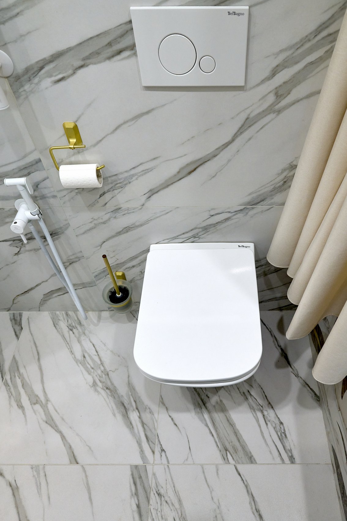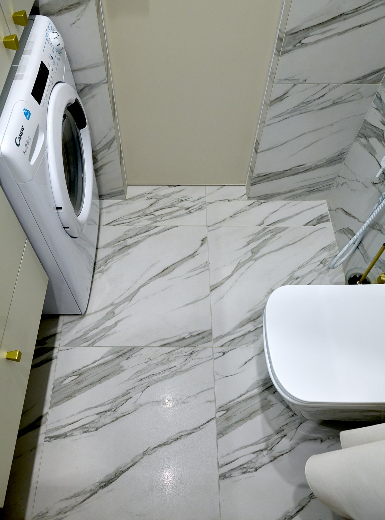 Ванная комната облицована керамогранитом под мрамор в светлых оттенках с минимальным количеством деталей, создавая эффект чистоты и свежести.