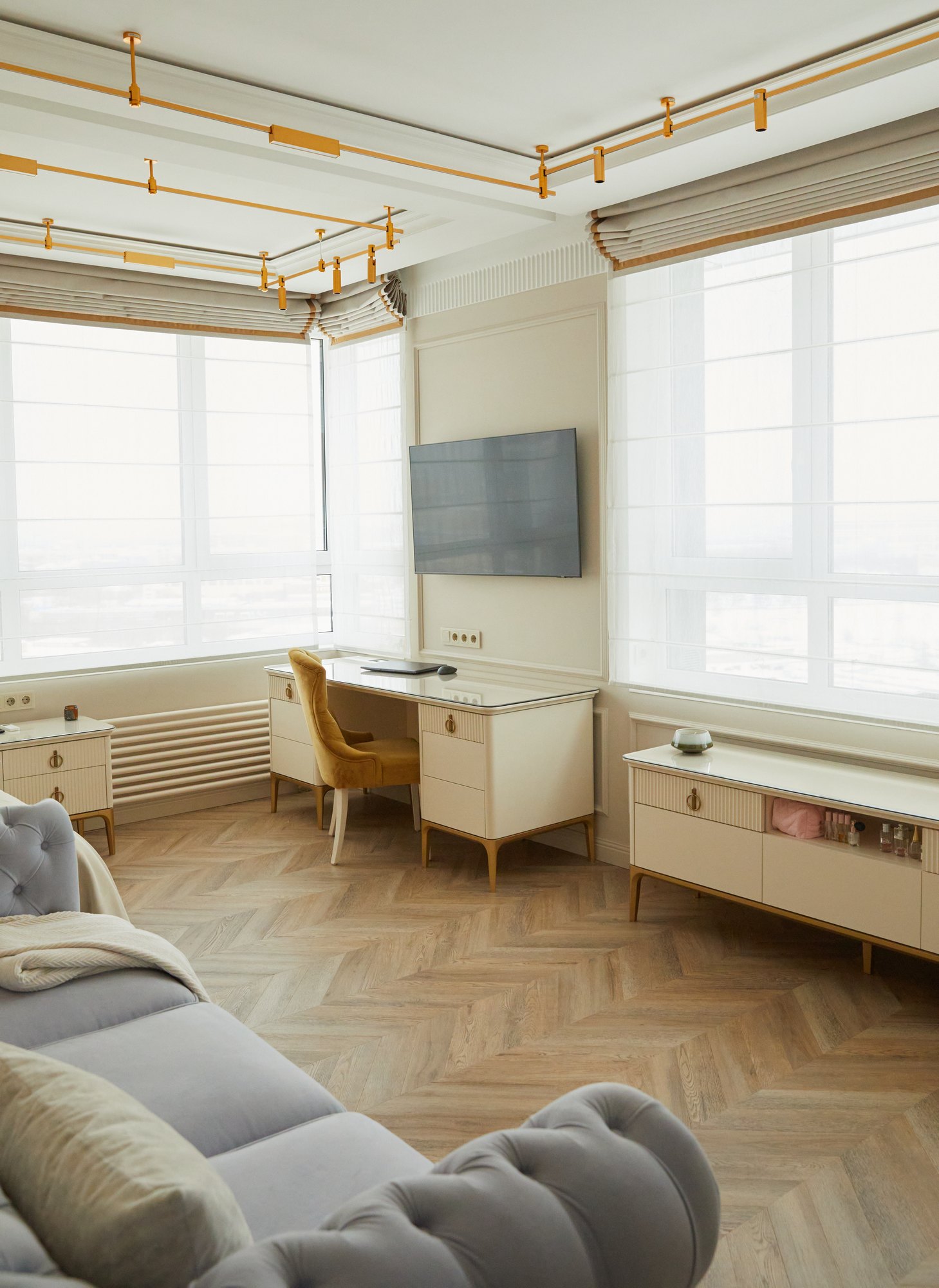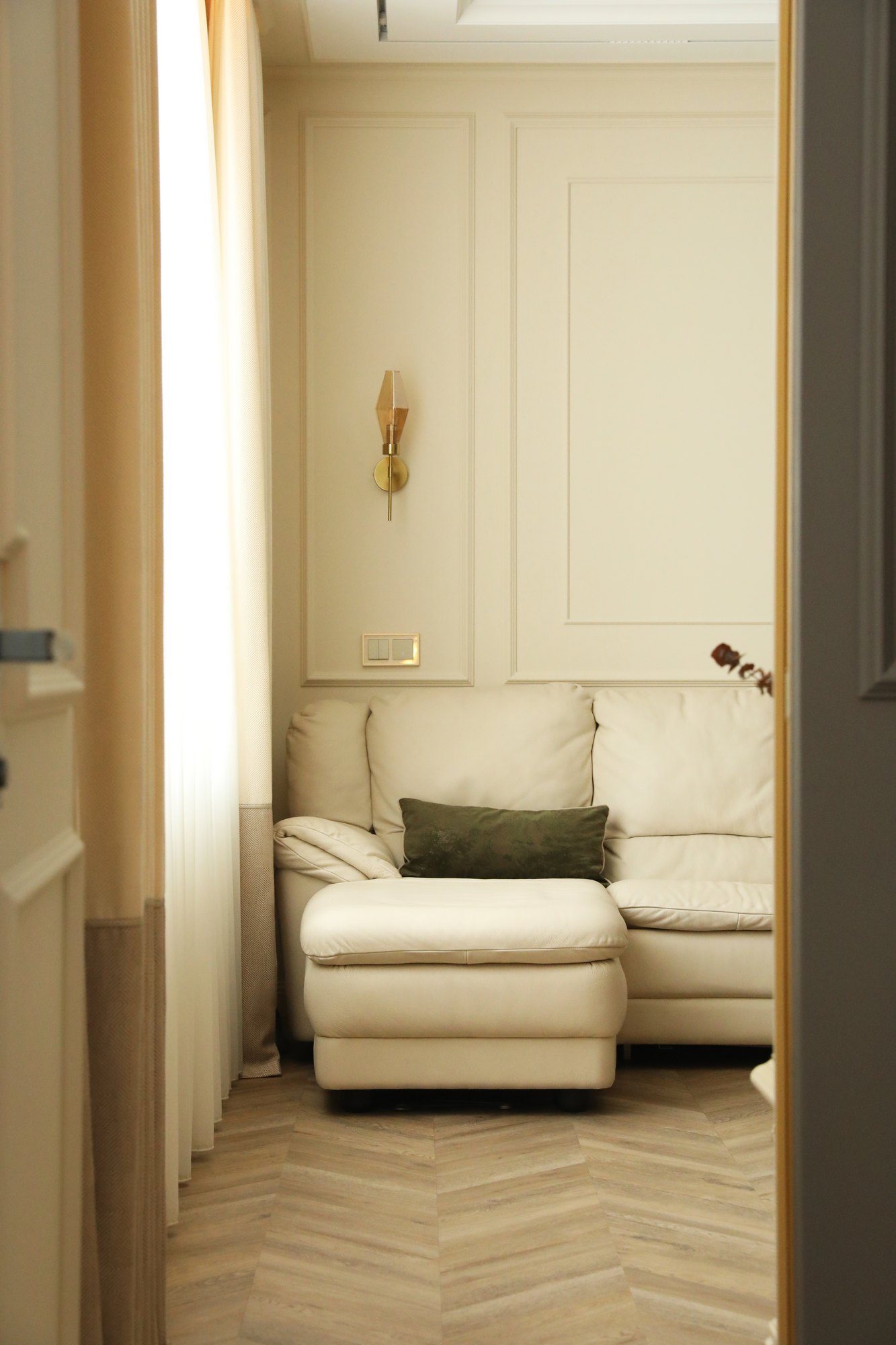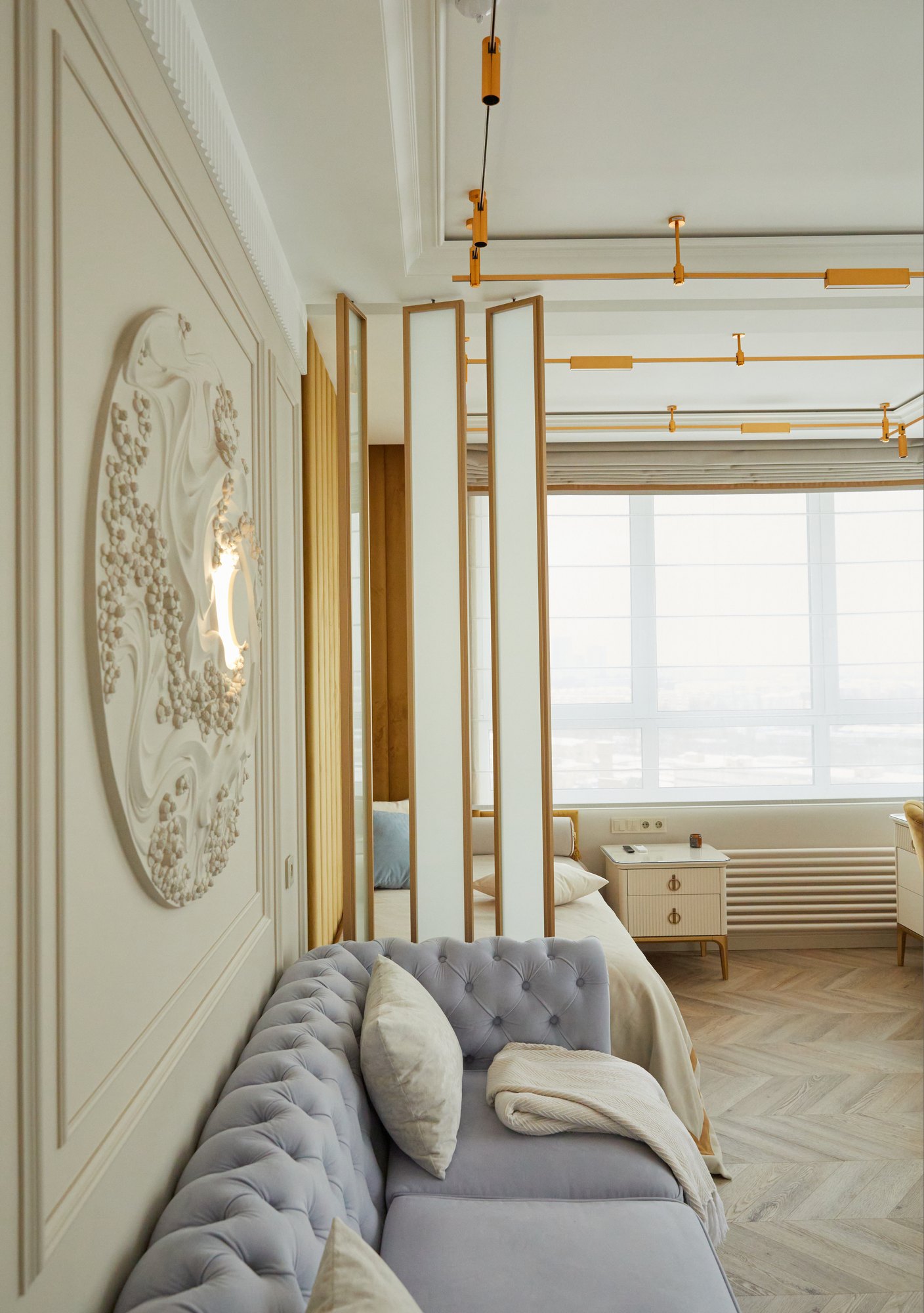 Этот интерьер выполнен в благородной современной классике с мягкими светлыми оттенками, изящной стеновой молдинговой отделкой и выразительными акцентами в мебели, текстиле и освещении. Пространство выглядит цельным и дорогим за счёт продуманной палитры, где тёплые кремовые, пудровые и древесные тона сочетаются с латунными деталями, матовыми фактурами и спокойным естественным светом. Во всех помещениях прослеживается единый стиль, который создаёт ощущение уюта, приватности и статуса.