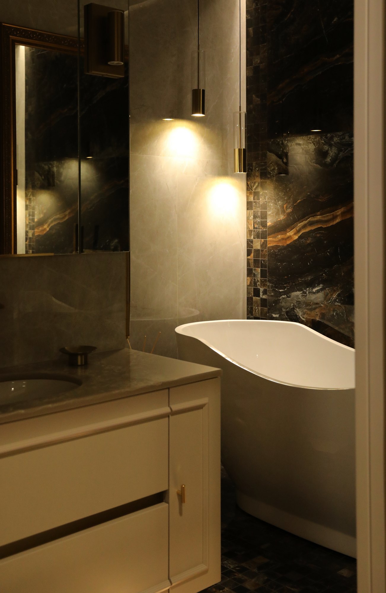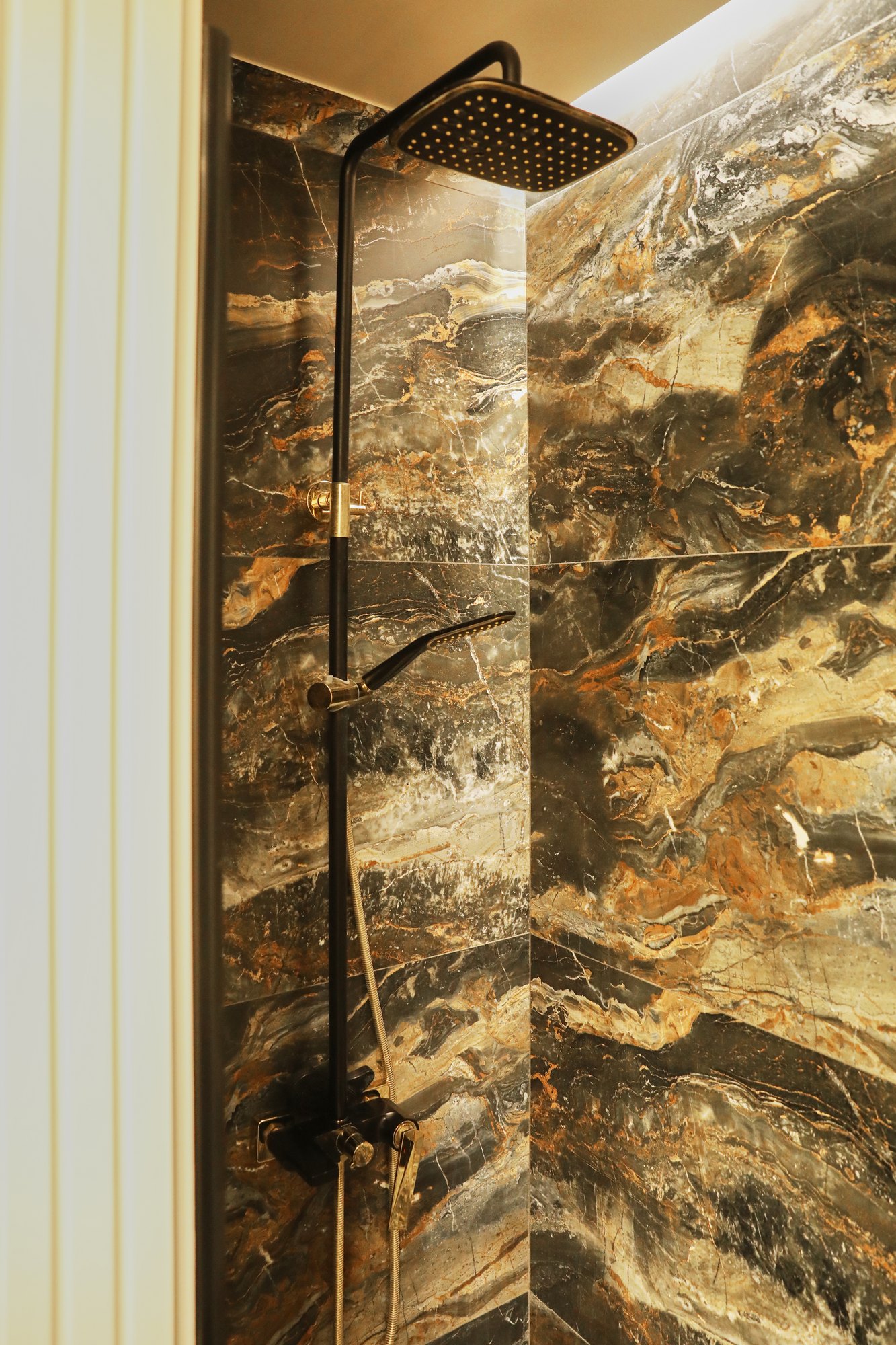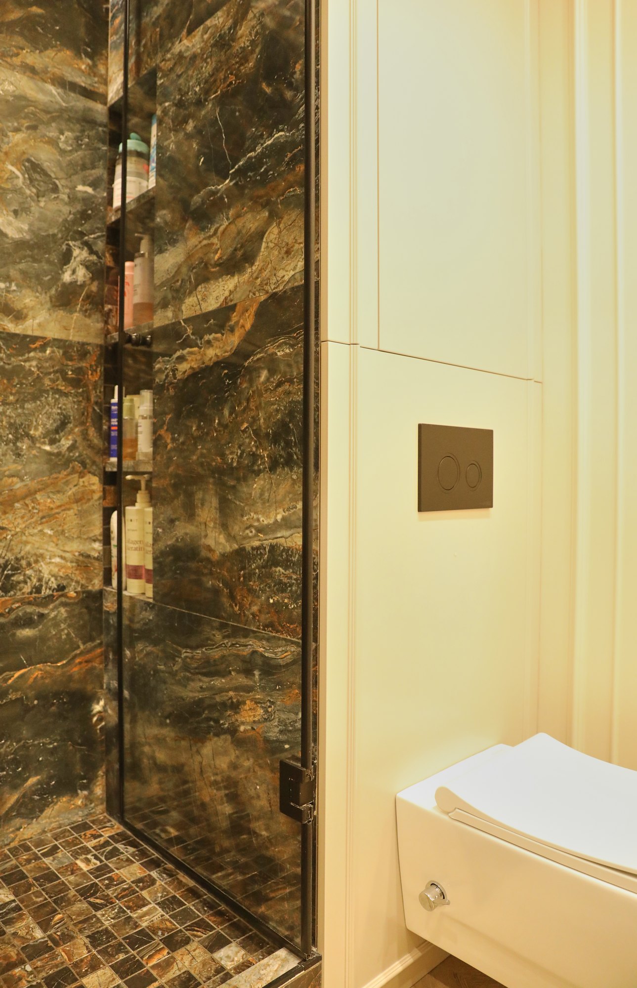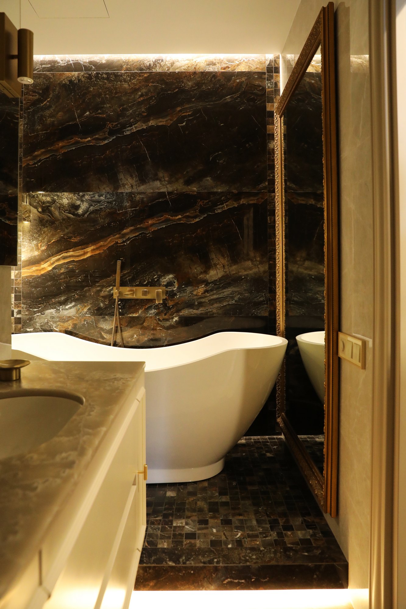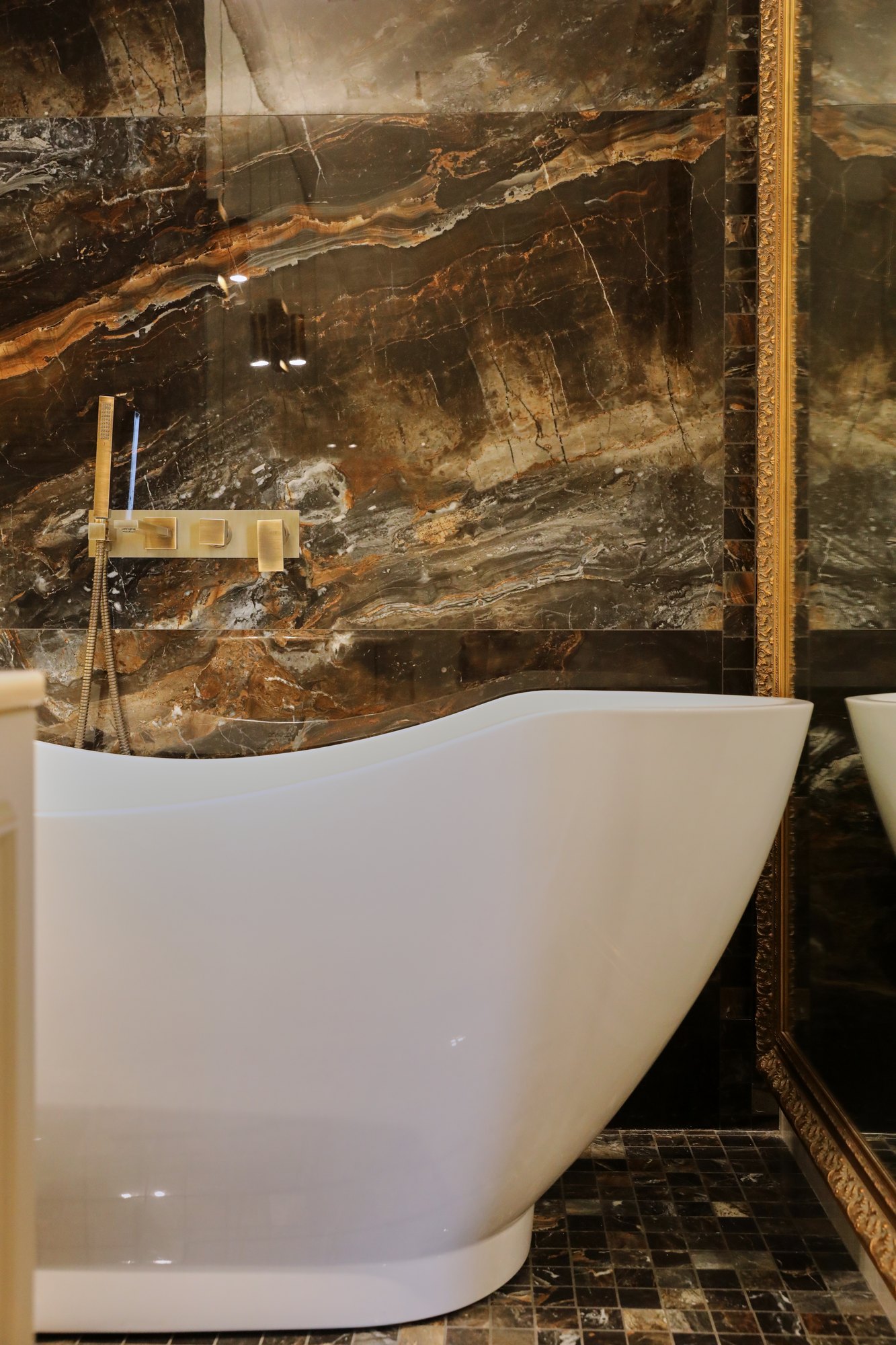 Особого внимания заслуживает ванная комната. Именно здесь интерьер раскрывается наиболее эффектно и эмоционально. Главным акцентом становится крупноформатная плитка с выразительным рисунком натурального камня в глубоких тёмных оттенках с золотистыми, медными и дымчатыми прожилками. Поверхность выглядит очень декоративно и создаёт почти арт объект в интерьере. Такая плитка не просто оформляет стены, а формирует весь характер пространства, делая его визуально дорогим, камерным и по настоящему впечатляющим.