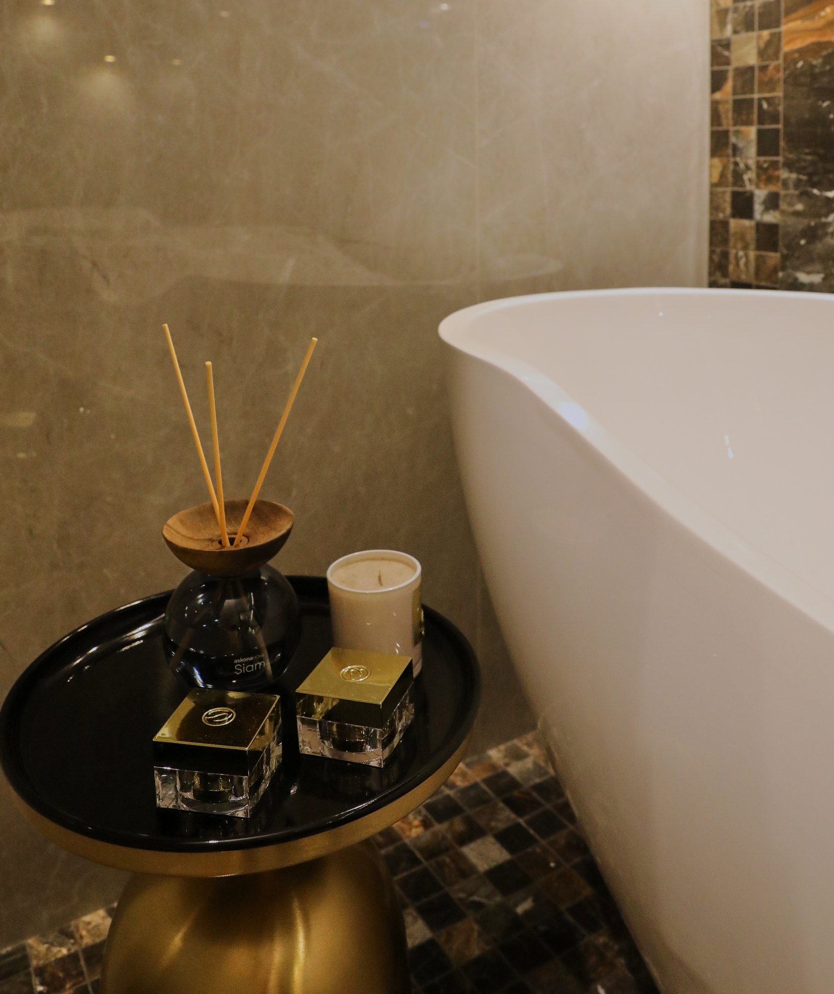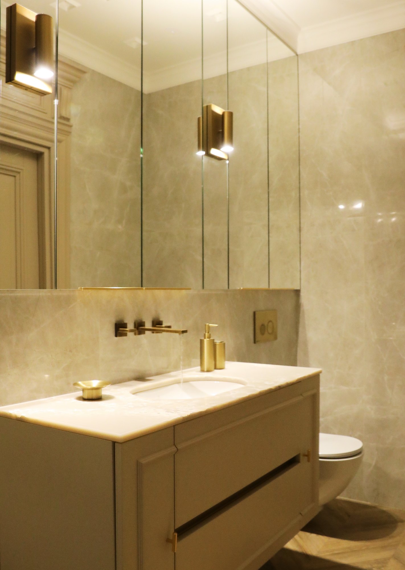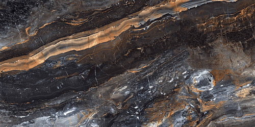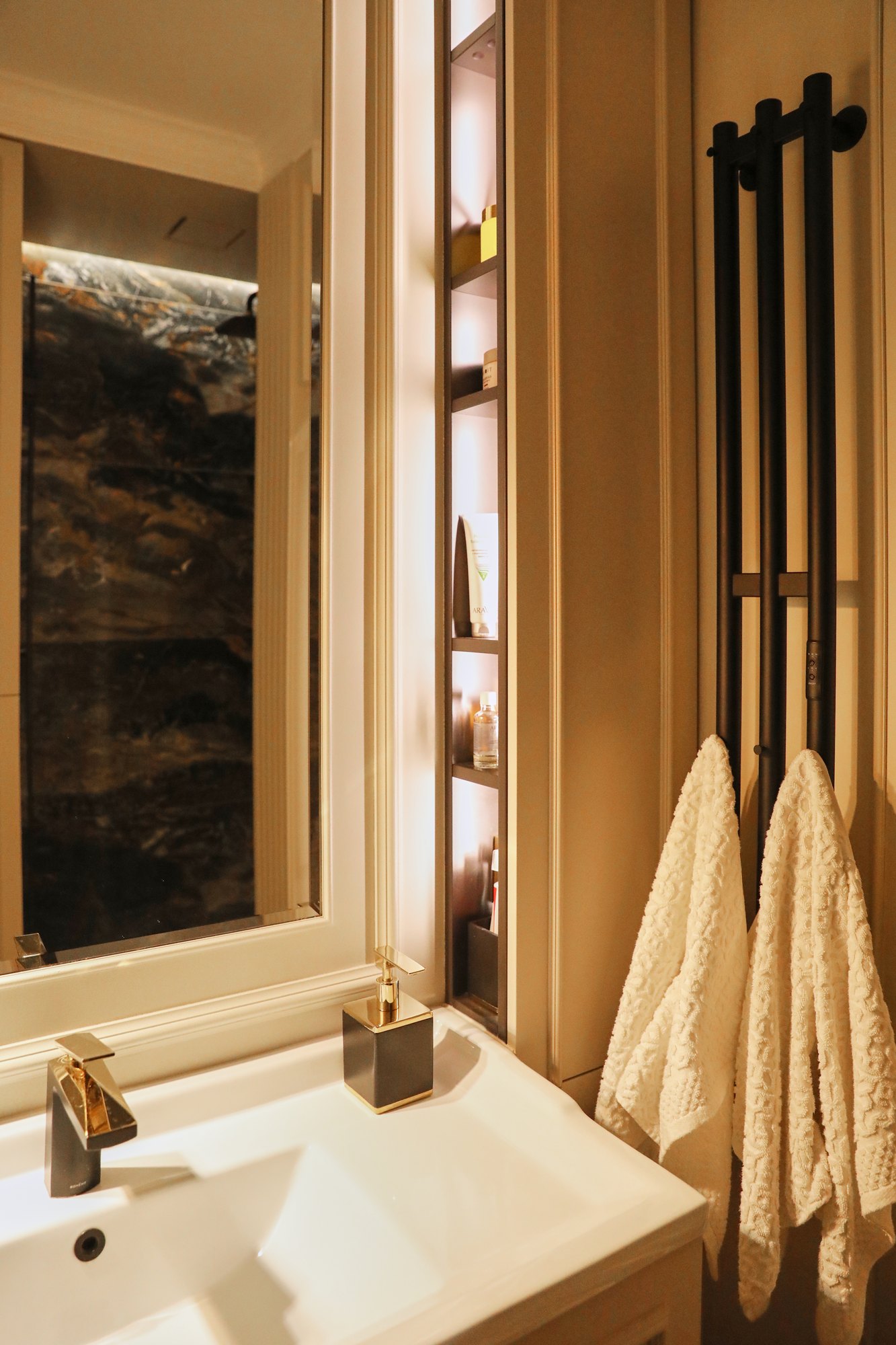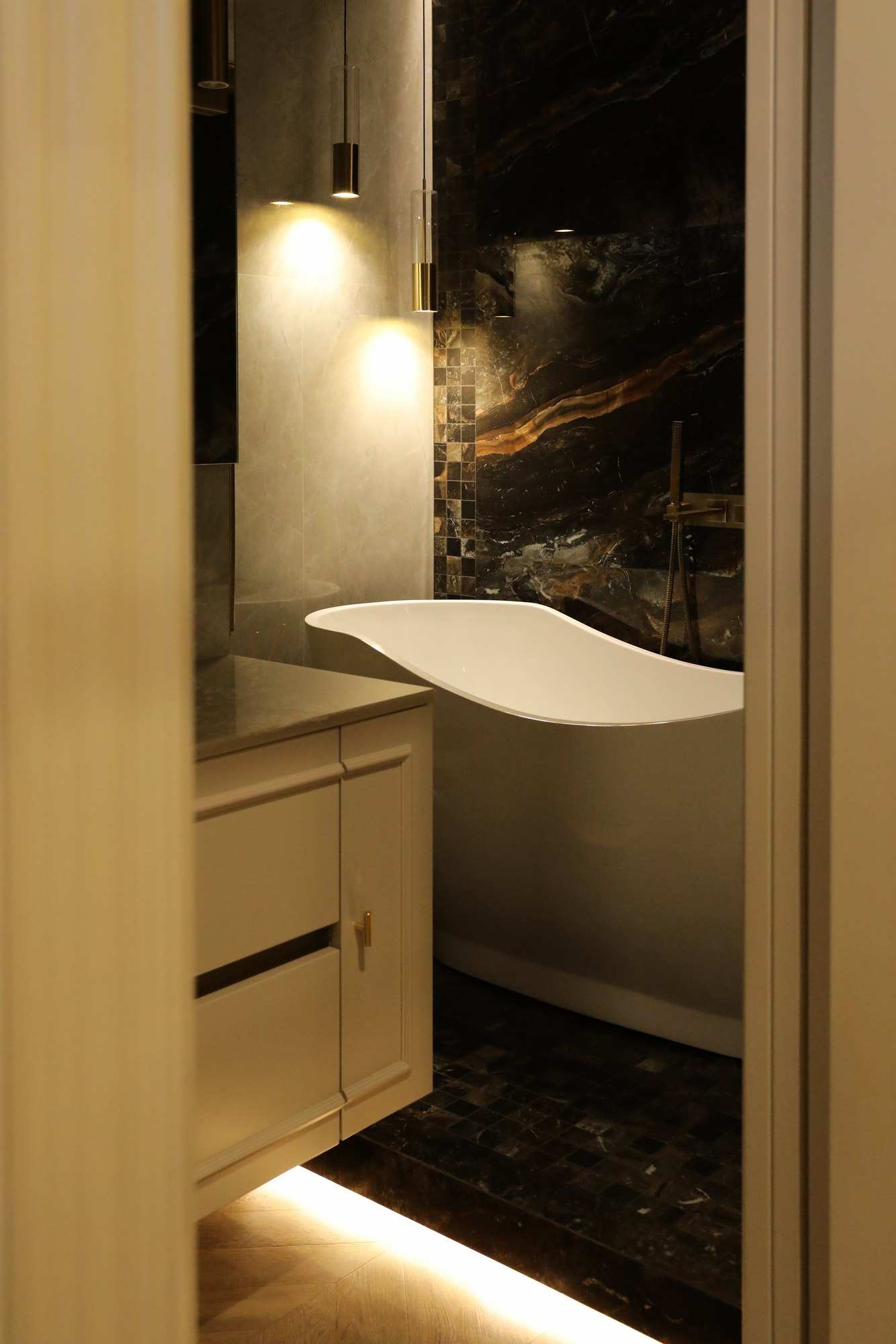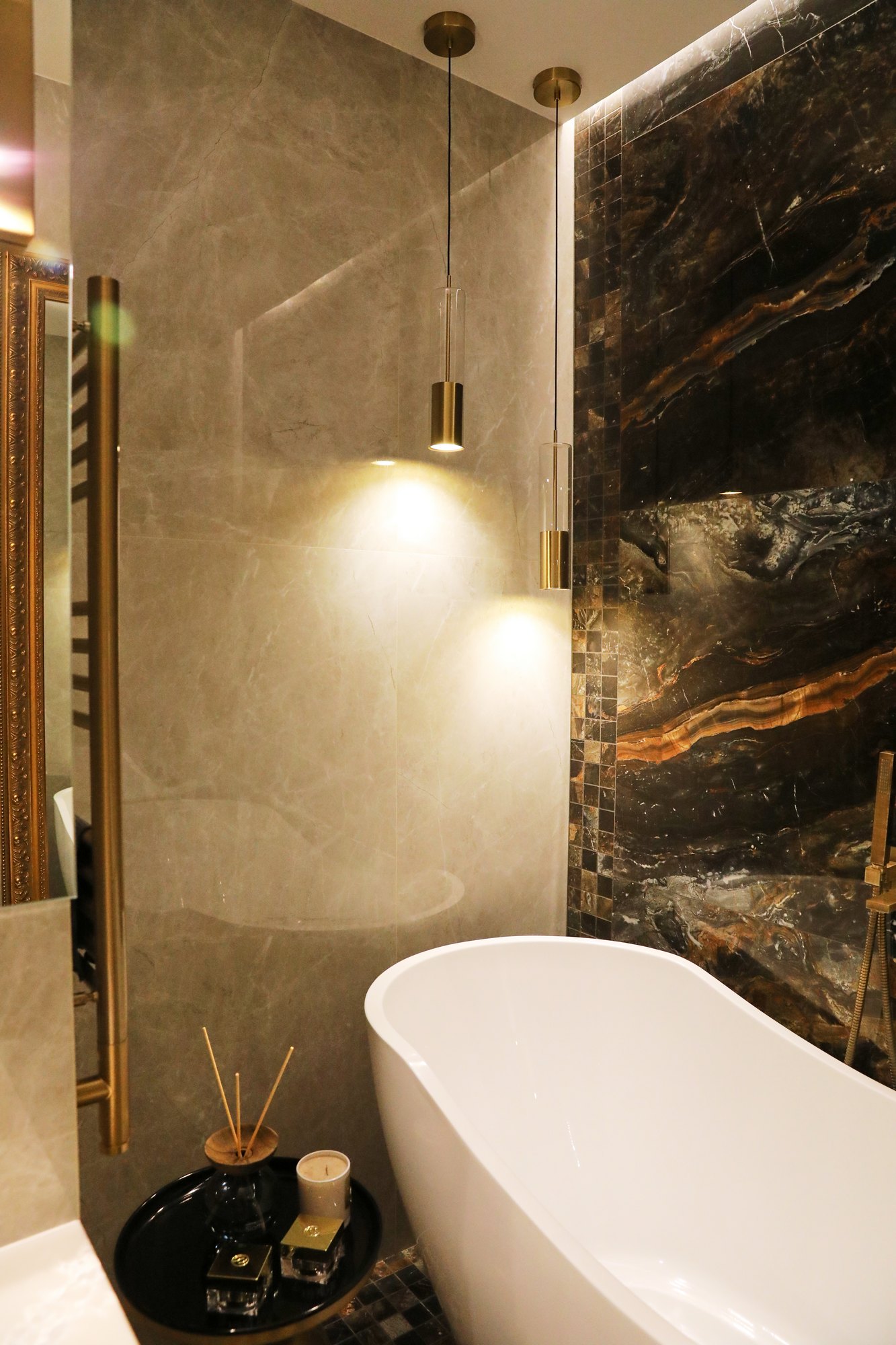 Особого внимания заслуживает ванная комната. Именно здесь интерьер раскрывается наиболее эффектно и эмоционально. Главным акцентом становится крупноформатная плитка с выразительным рисунком натурального камня в глубоких тёмных оттенках с золотистыми, медными и дымчатыми прожилками. Поверхность выглядит очень декоративно и создаёт почти арт объект в интерьере. Такая плитка не просто оформляет стены, а формирует весь характер пространства, делая его визуально дорогим, камерным и по настоящему впечатляющим.