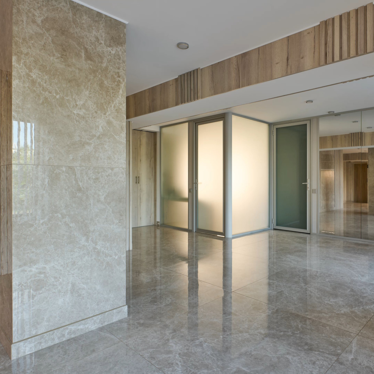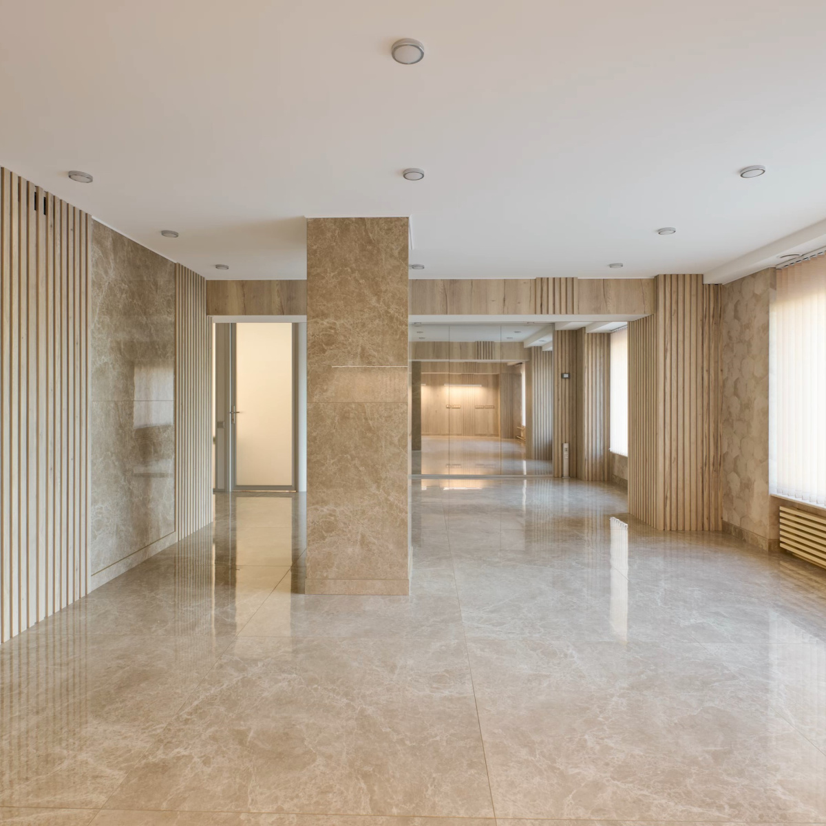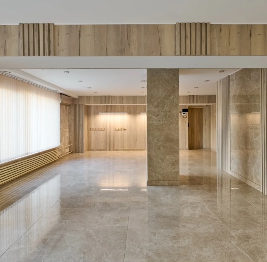 Преобладают мягкие тона бежевого и серого, создающие спокойную и уютную атмосферу. Гладкая поверхность пола из плитки отражает свет, визуально увеличивая пространство, а стены отделаны натуральными материалами, такими как дерево и камень. Зона ожидания оформлена двумя комфортными креслами пастельных тонов, что придаёт помещению ощущение уюта и комфорта.
