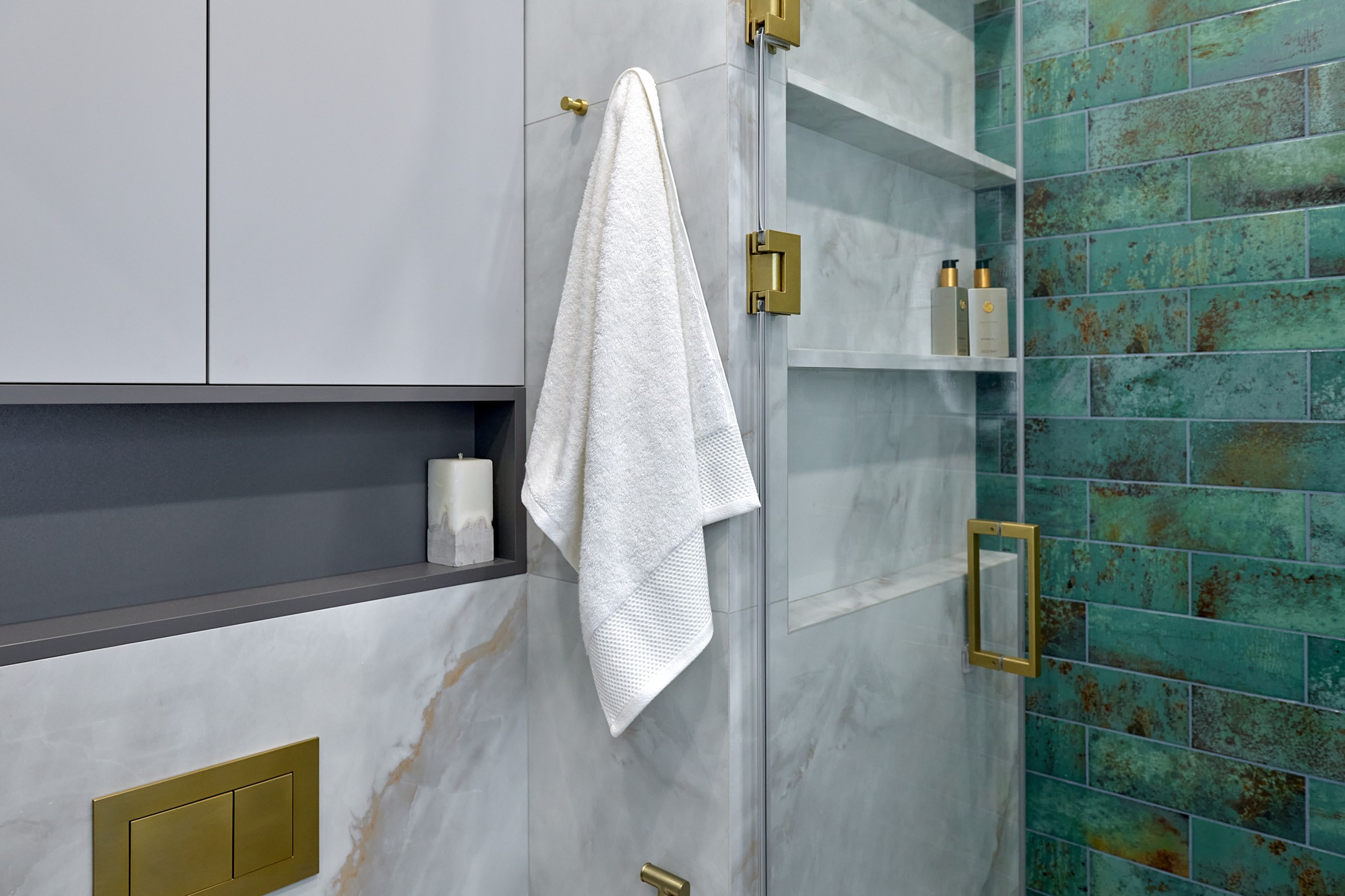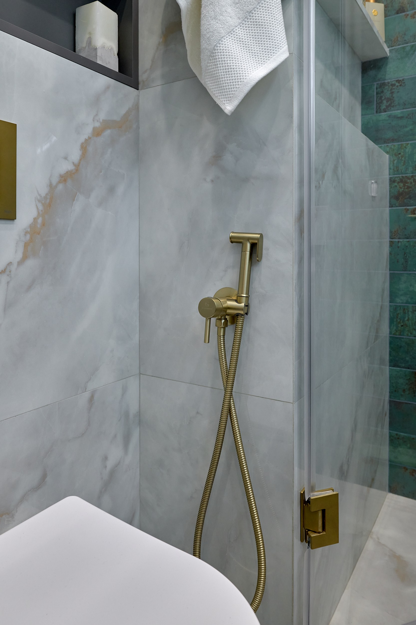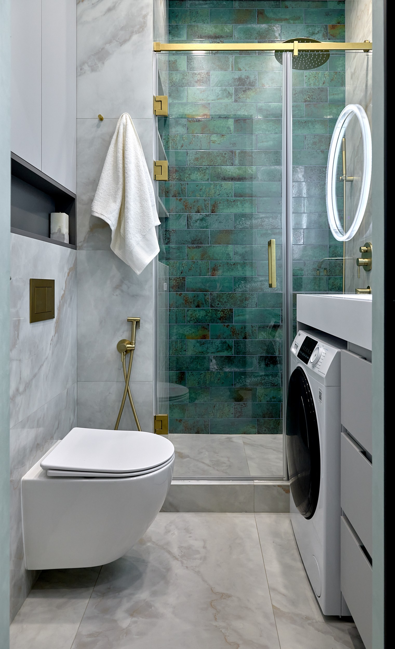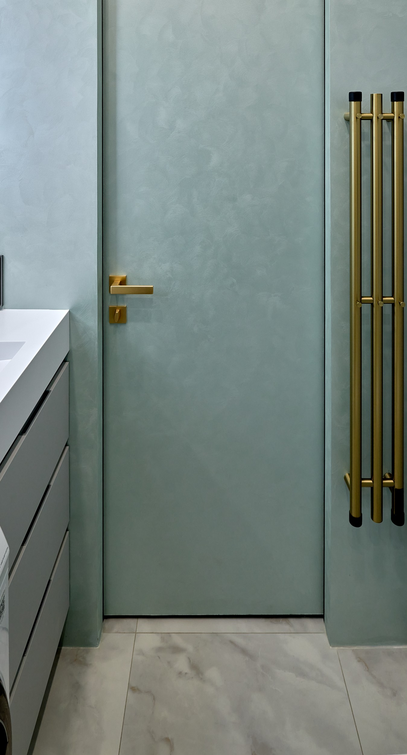 Стены: нейтральные серые оттенки, визуально расширяющие пространство. Пол: керамогранит под мрамор с серым оттенком Neodom Sale Ornato Wave Carving 600x1200 арт. N20538 - придаёт интерьеру природную текстуру и устойчив к эксплуатации. Санузел: в качестве акцента: настенная глянцевая керамическая плитка Mainzu Bellagio Smeraldo 100х300 с потрясающей текстурой и со следами окисления. Бирюзовый цвет - яркий визуальный якорь санузла, оживляющий монохромную гамму.