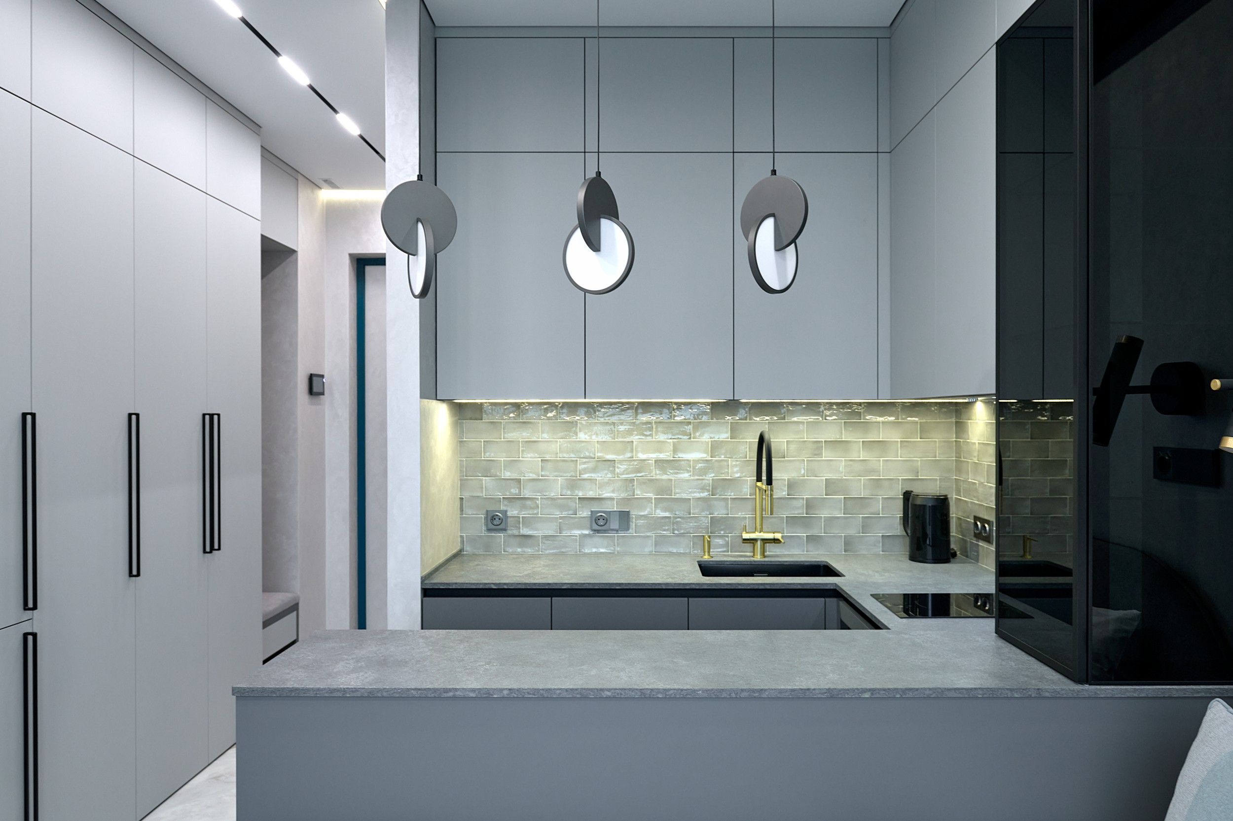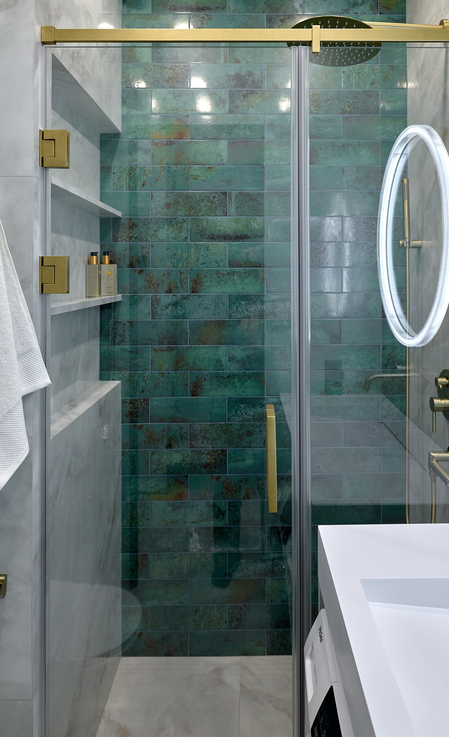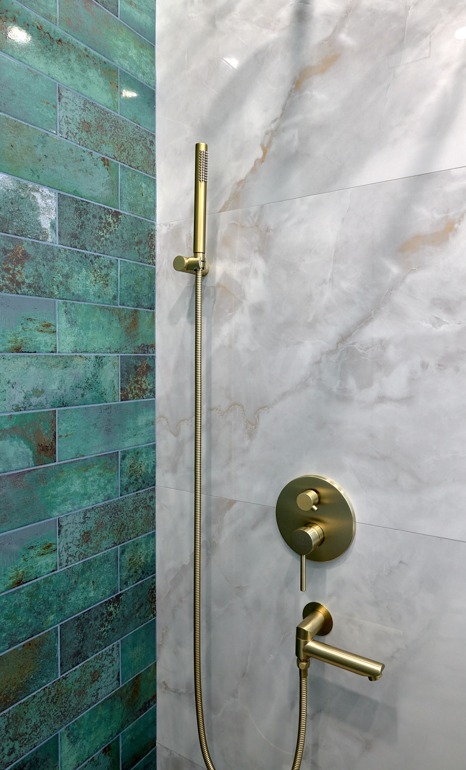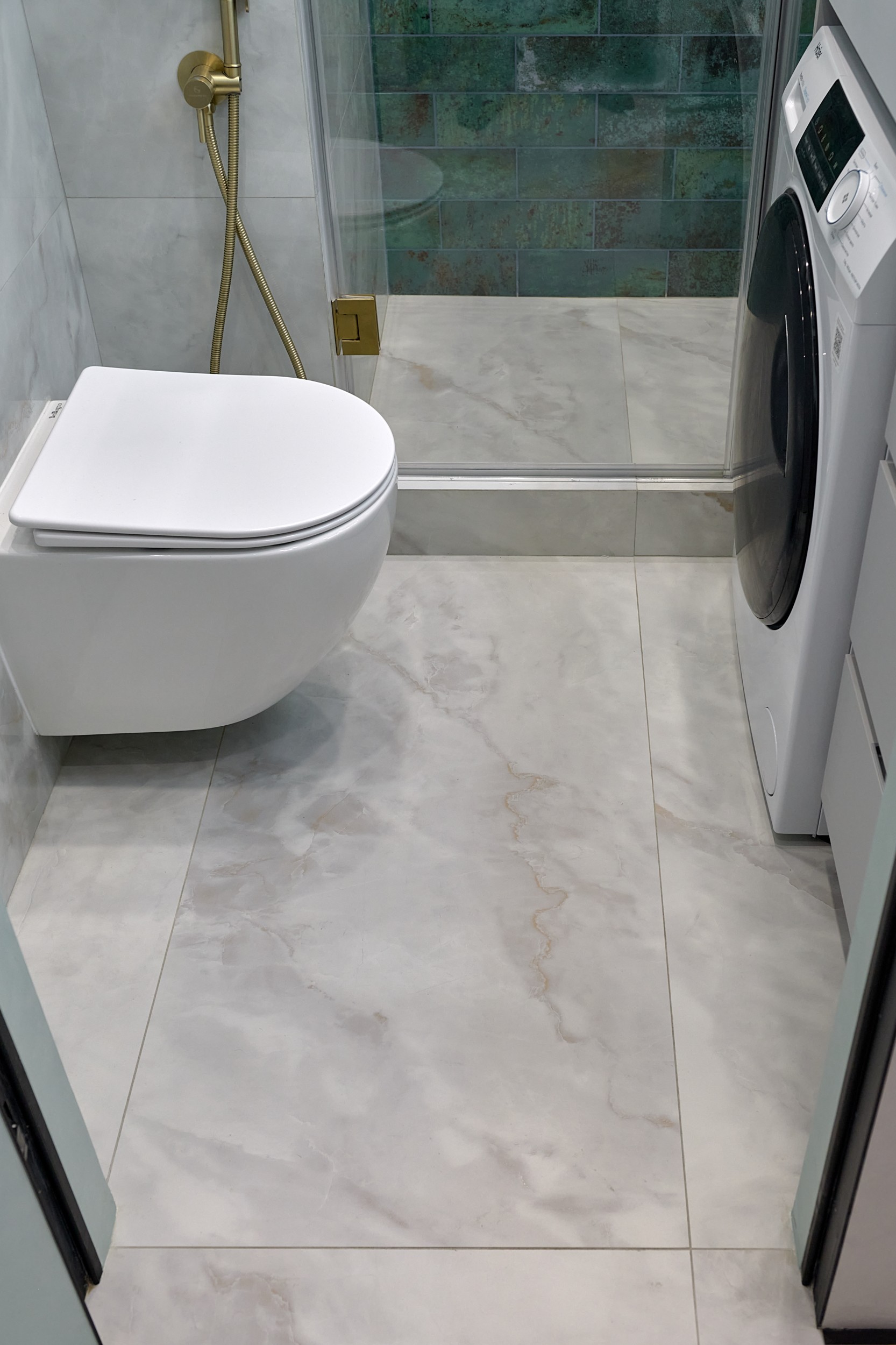 Стены: нейтральные серые оттенки, визуально расширяющие пространство. Пол: керамогранит под мрамор с серым оттенком Neodom Sale Ornato Wave Carving 600x1200 арт. N20538 - придаёт интерьеру природную текстуру и устойчив к эксплуатации. Санузел: в качестве акцента: настенная глянцевая керамическая плитка Mainzu Bellagio Smeraldo 100х300 с потрясающей текстурой и со следами окисления. Бирюзовый цвет - яркий визуальный якорь санузла, оживляющий монохромную гамму.