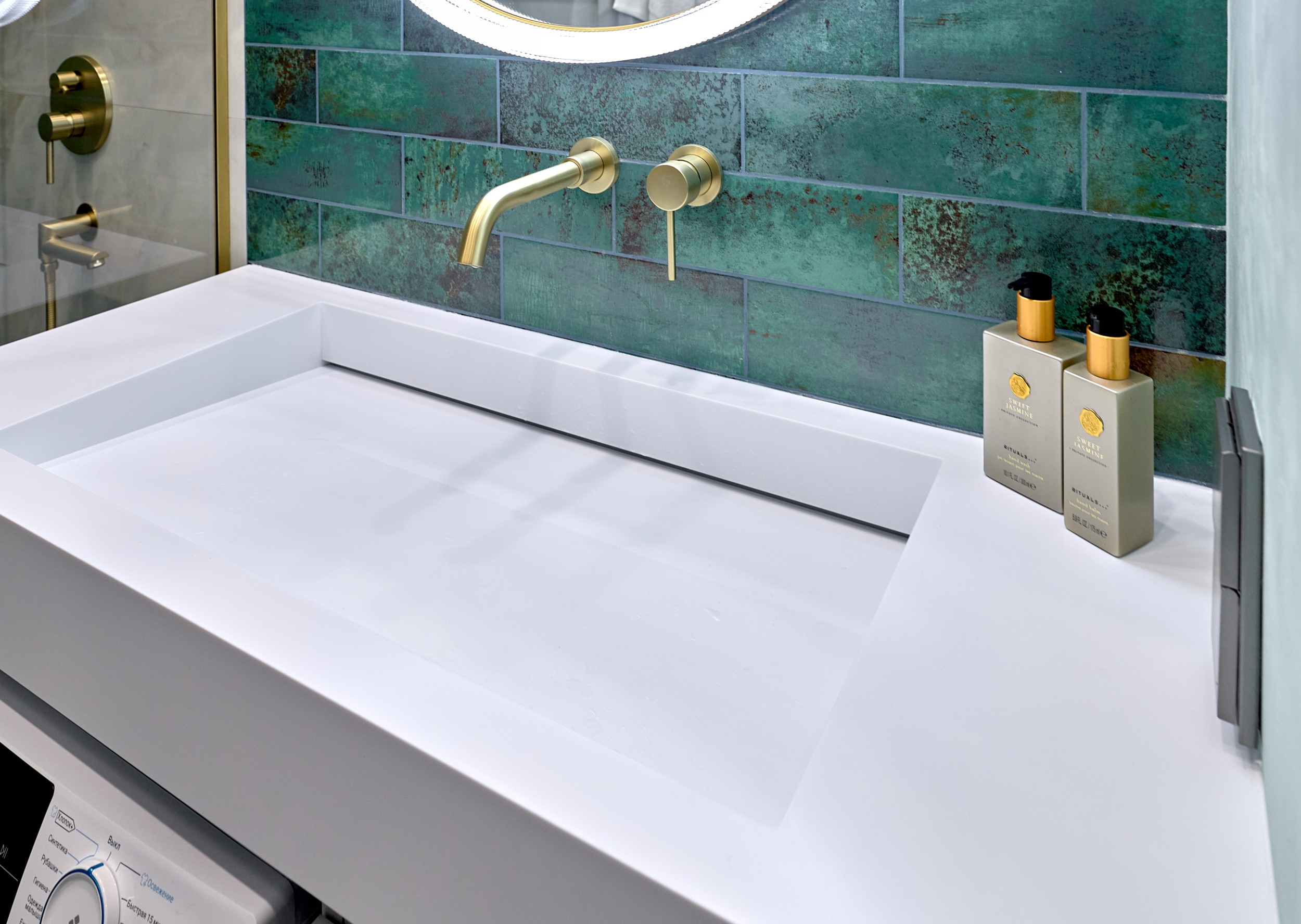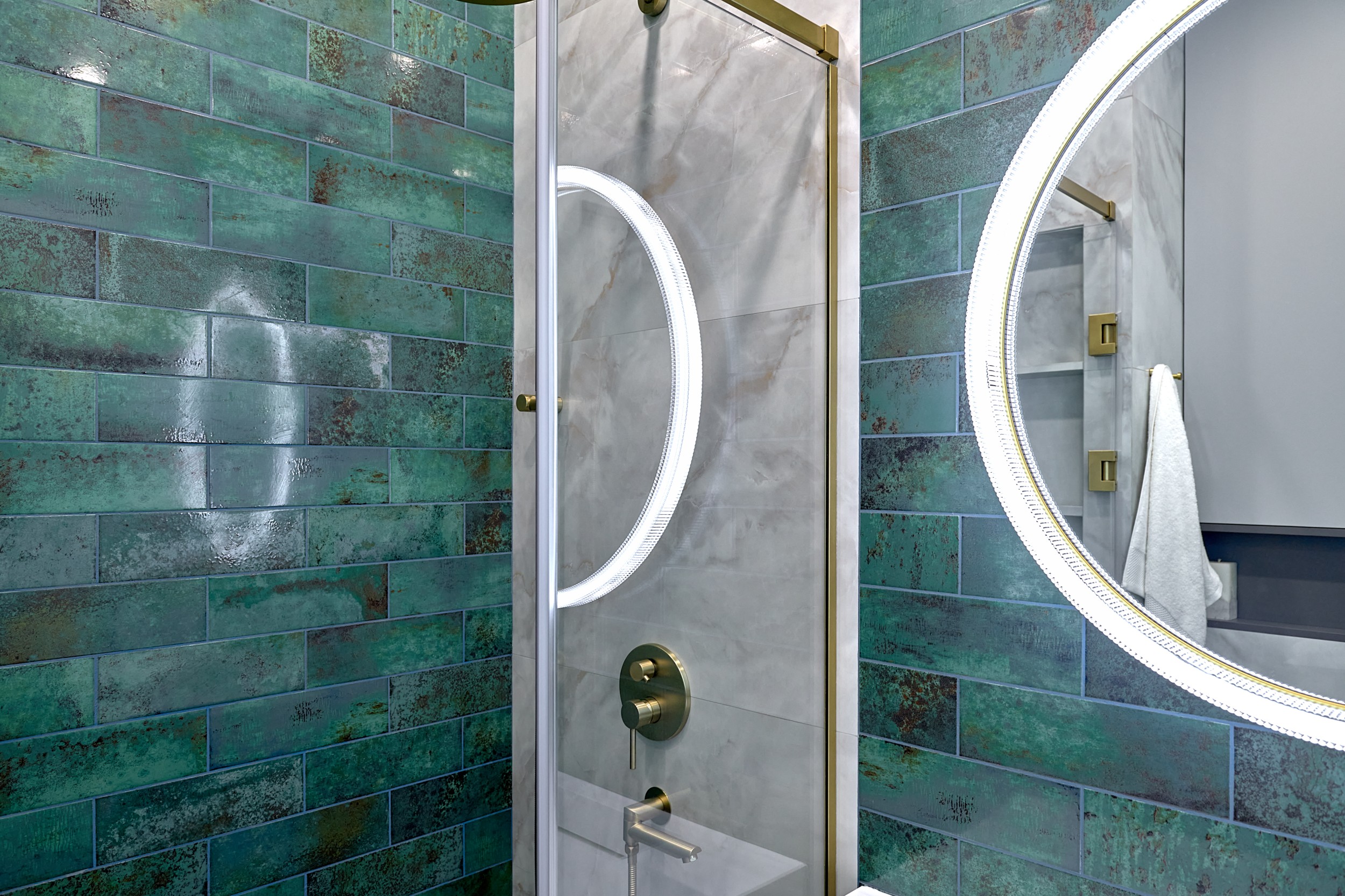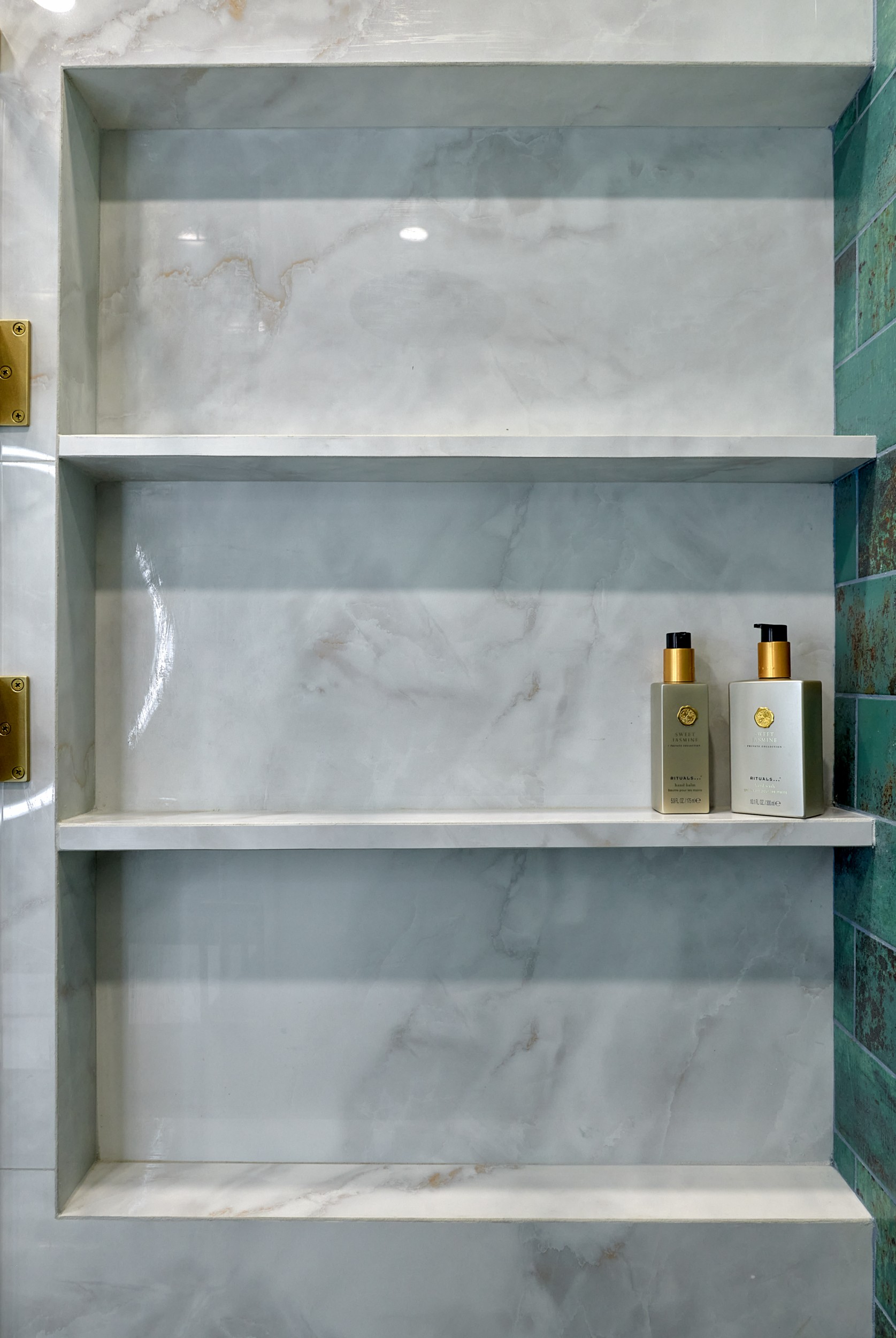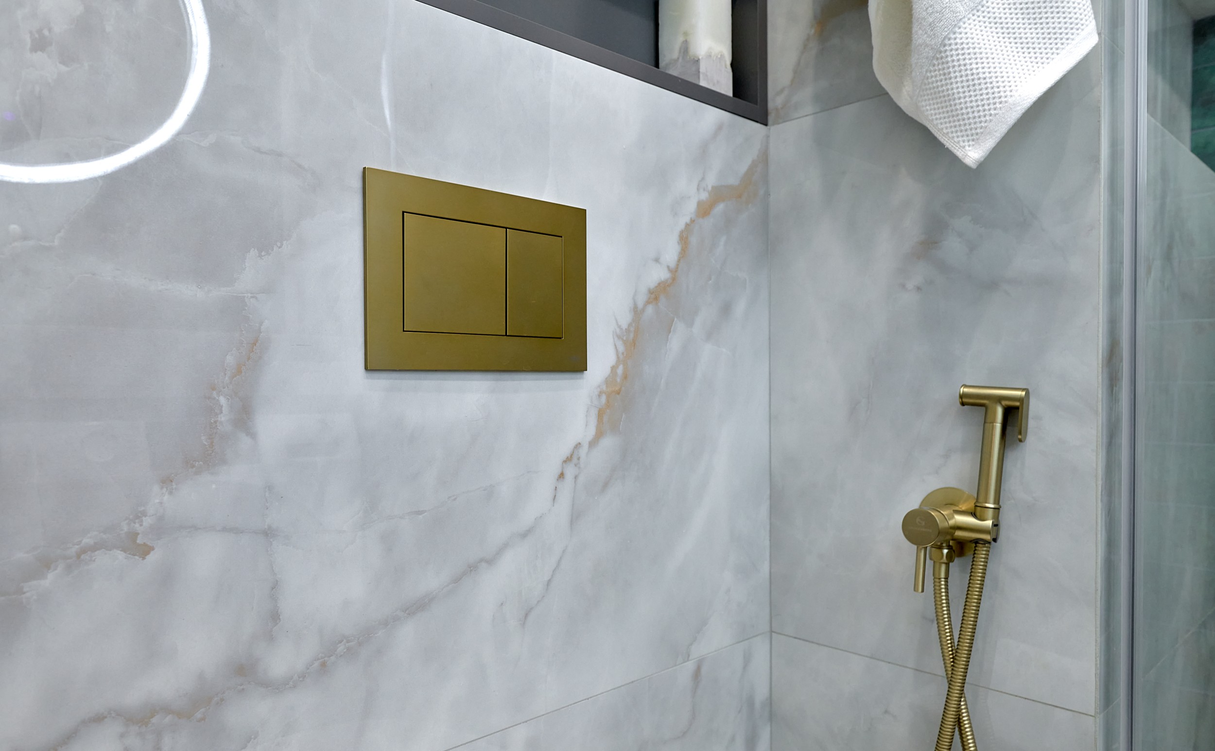 Стены: нейтральные серые оттенки, визуально расширяющие пространство. Пол: керамогранит под мрамор с серым оттенком Neodom Sale Ornato Wave Carving 600x1200 арт. N20538 - придаёт интерьеру природную текстуру и устойчив к эксплуатации. Санузел: в качестве акцента: настенная глянцевая керамическая плитка Mainzu Bellagio Smeraldo 100х300 с потрясающей текстурой и со следами окисления. Бирюзовый цвет - яркий визуальный якорь санузла, оживляющий монохромную гамму.
