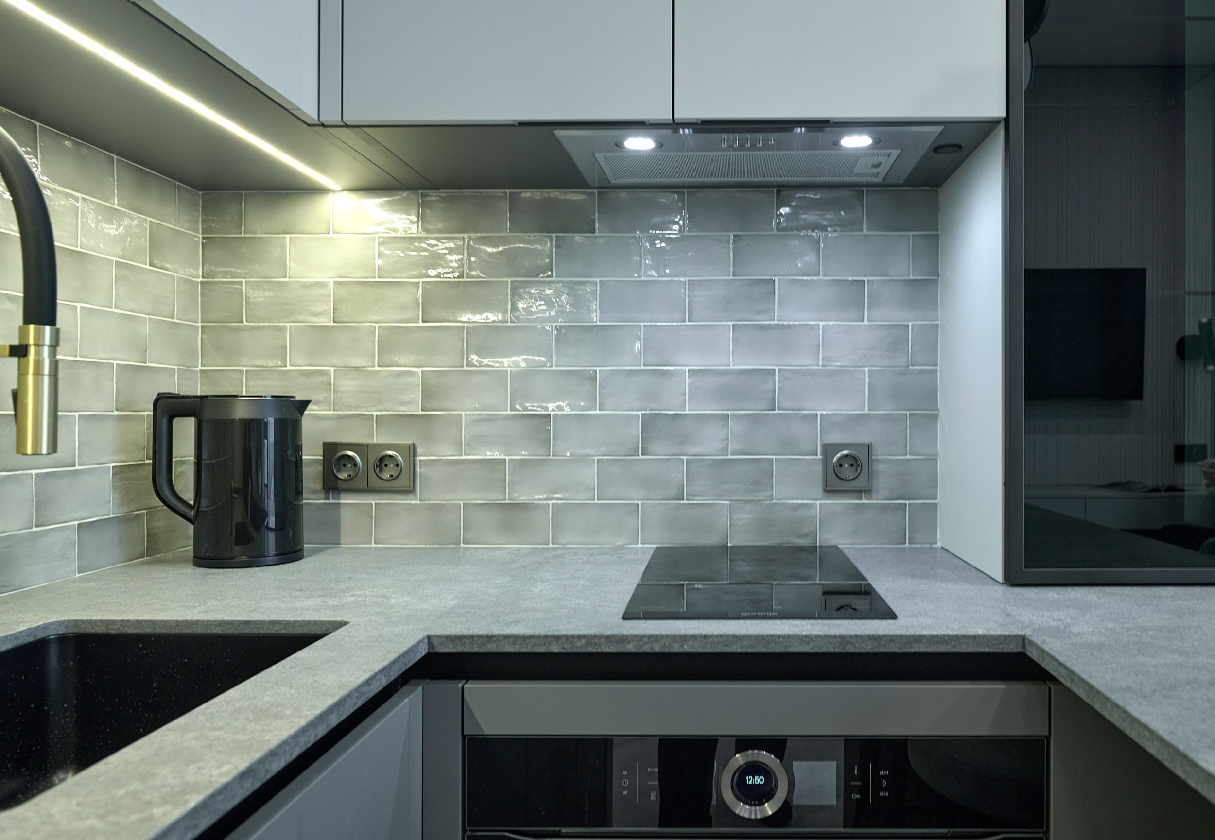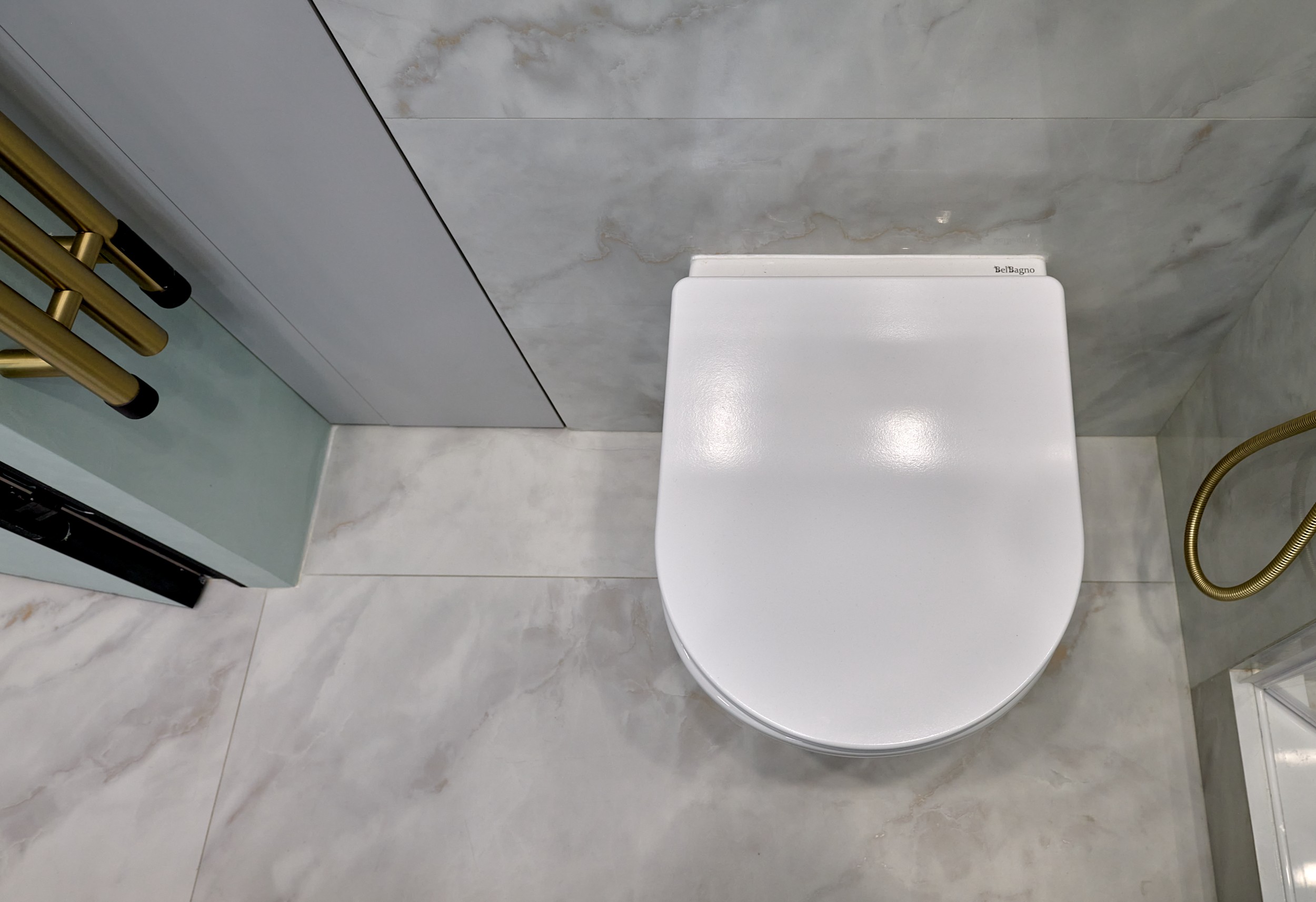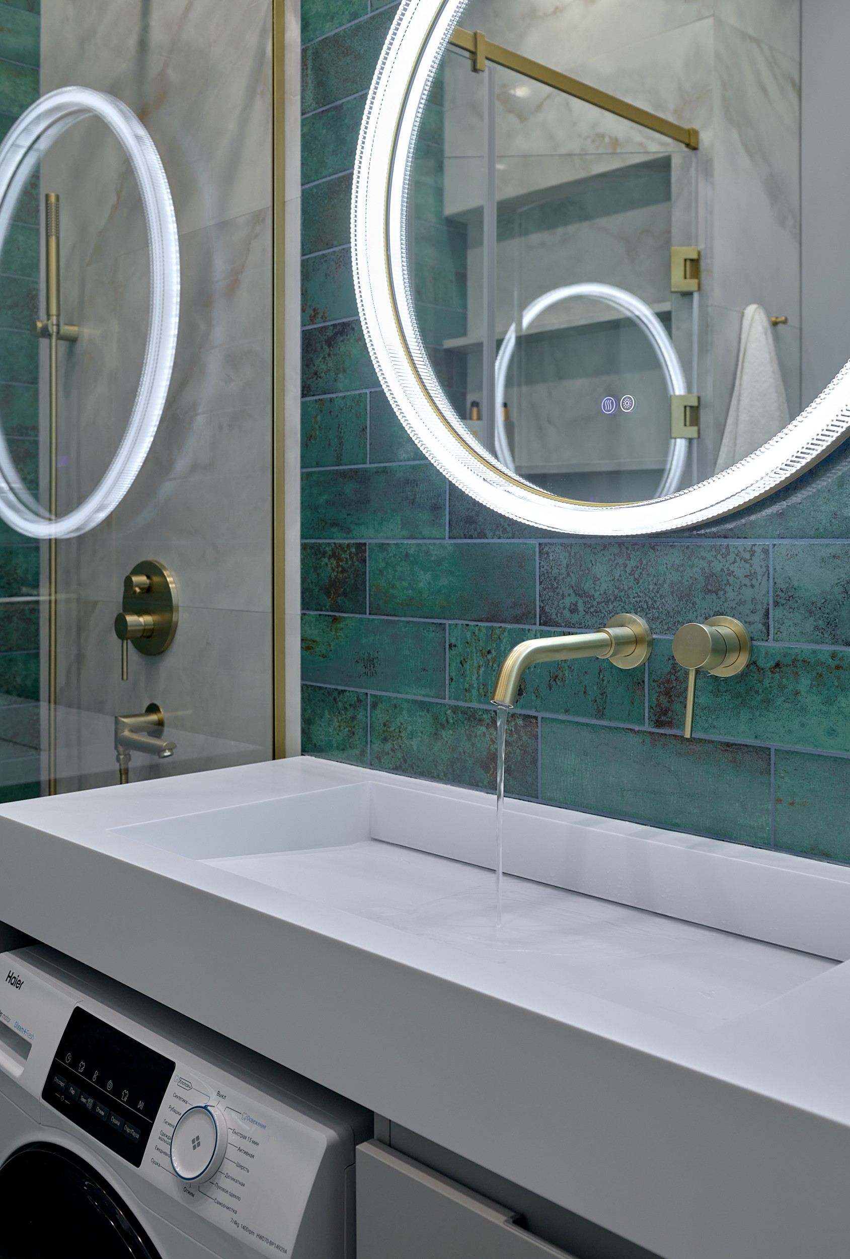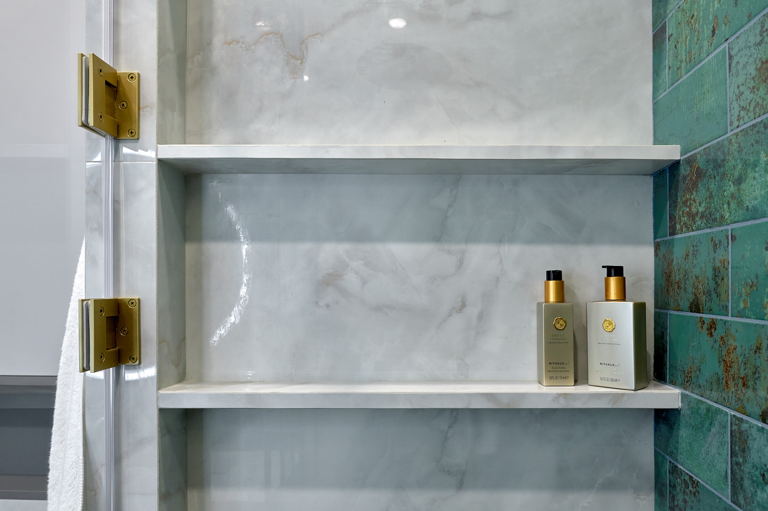 Стены: нейтральные серые оттенки, визуально расширяющие пространство. Пол: керамогранит под мрамор с серым оттенком Neodom Sale Ornato Wave Carving 600x1200 арт. N20538 - придаёт интерьеру природную текстуру и устойчив к эксплуатации. Санузел: в качестве акцента: настенная глянцевая керамическая плитка Mainzu Bellagio Smeraldo 100х300 с потрясающей текстурой и со следами окисления. Бирюзовый цвет - яркий визуальный якорь санузла, оживляющий монохромную гамму.