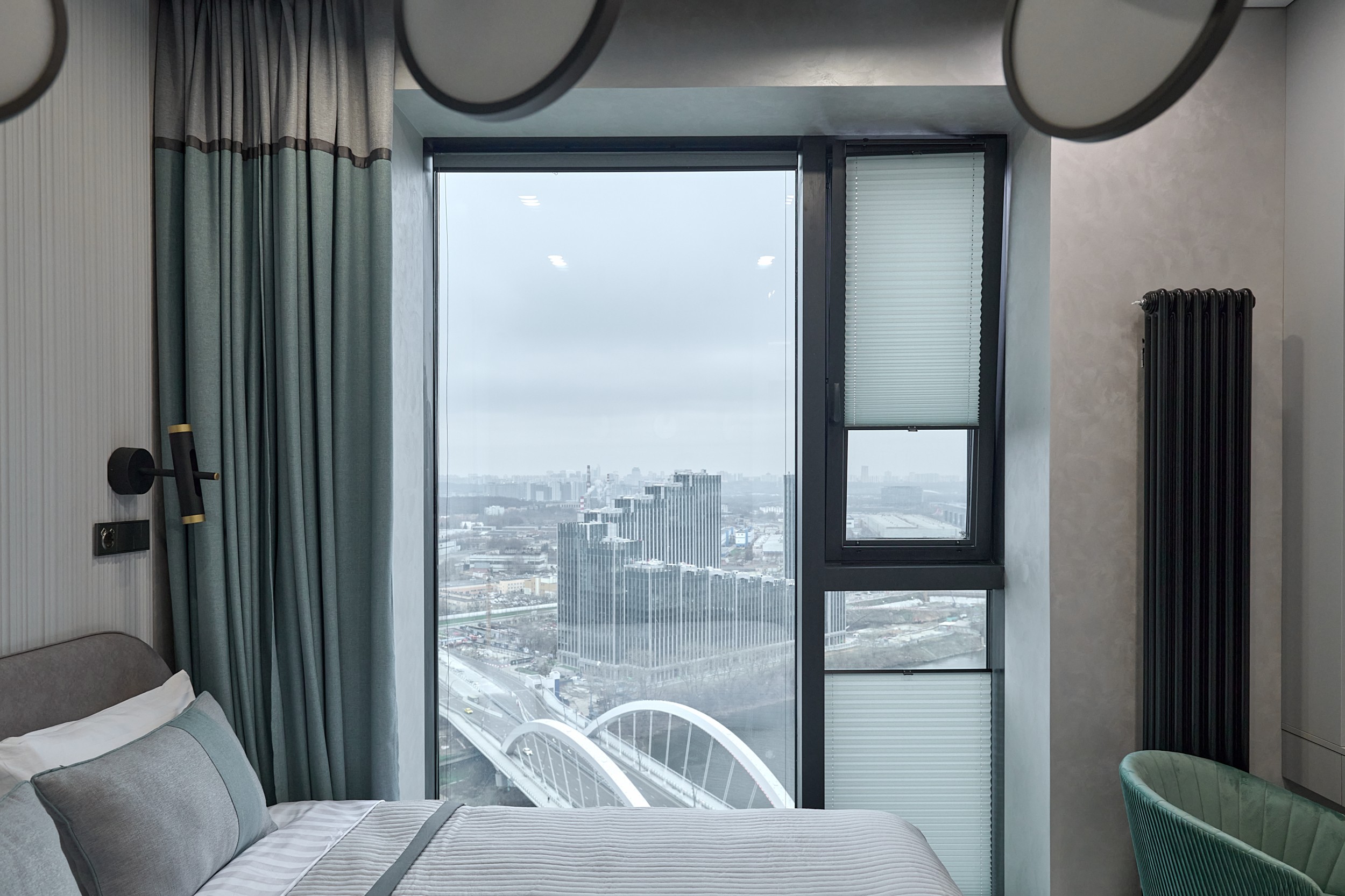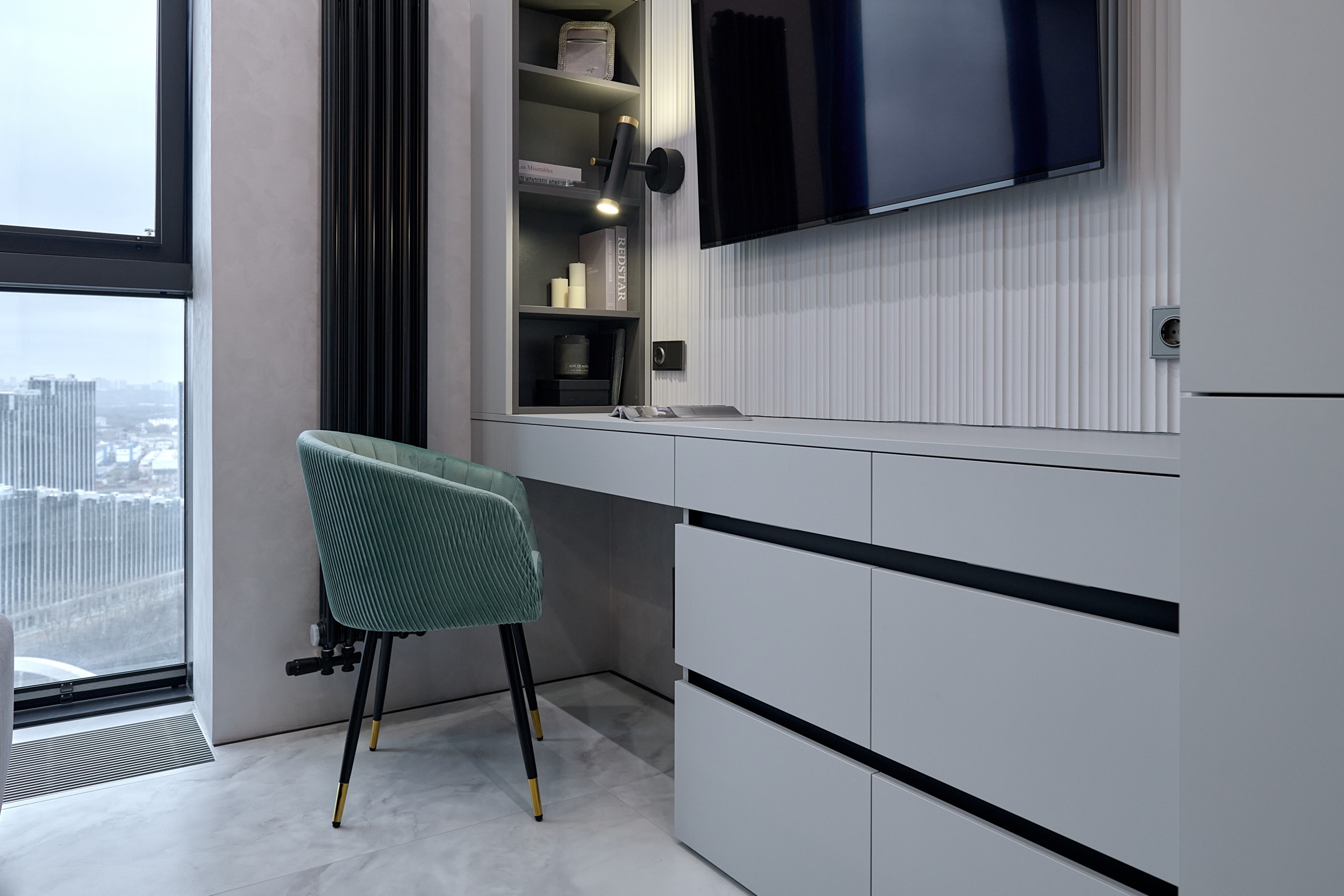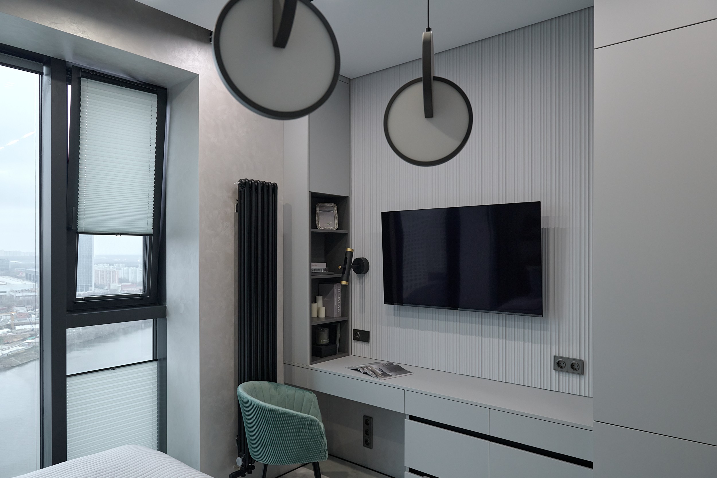 Основная палитра - оттенки серого, создающие ощущение спокойствия и простора. Акценты выражены в бирюзовых тонах: они привносят свежесть и динамичность, гармонируя с живописным видом на воду из панорамного окна.
