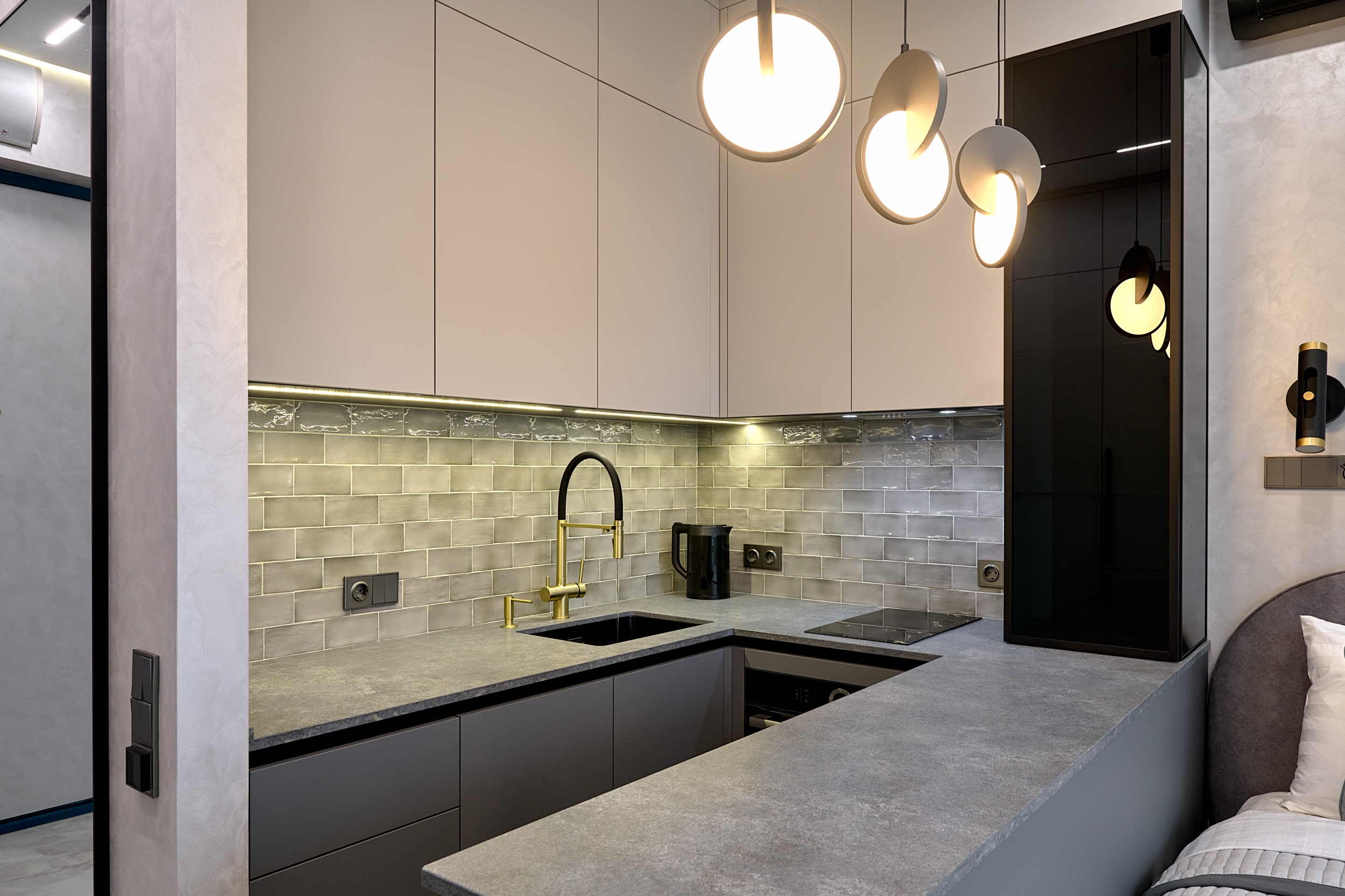 Пространство продуманно зонировано для максимального использования площади. Вся мебель выполнена в серых оттенках, что обеспечивает целостность восприятия.