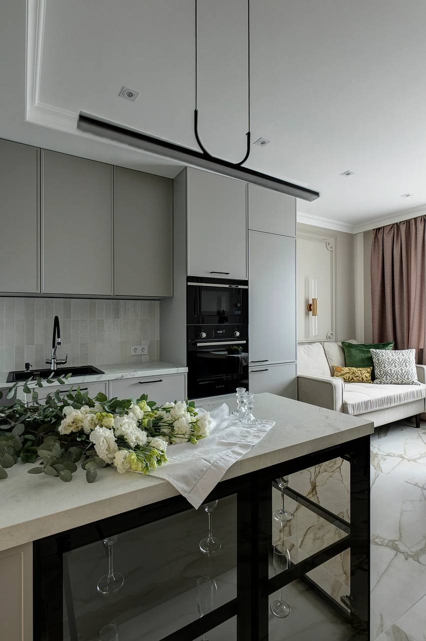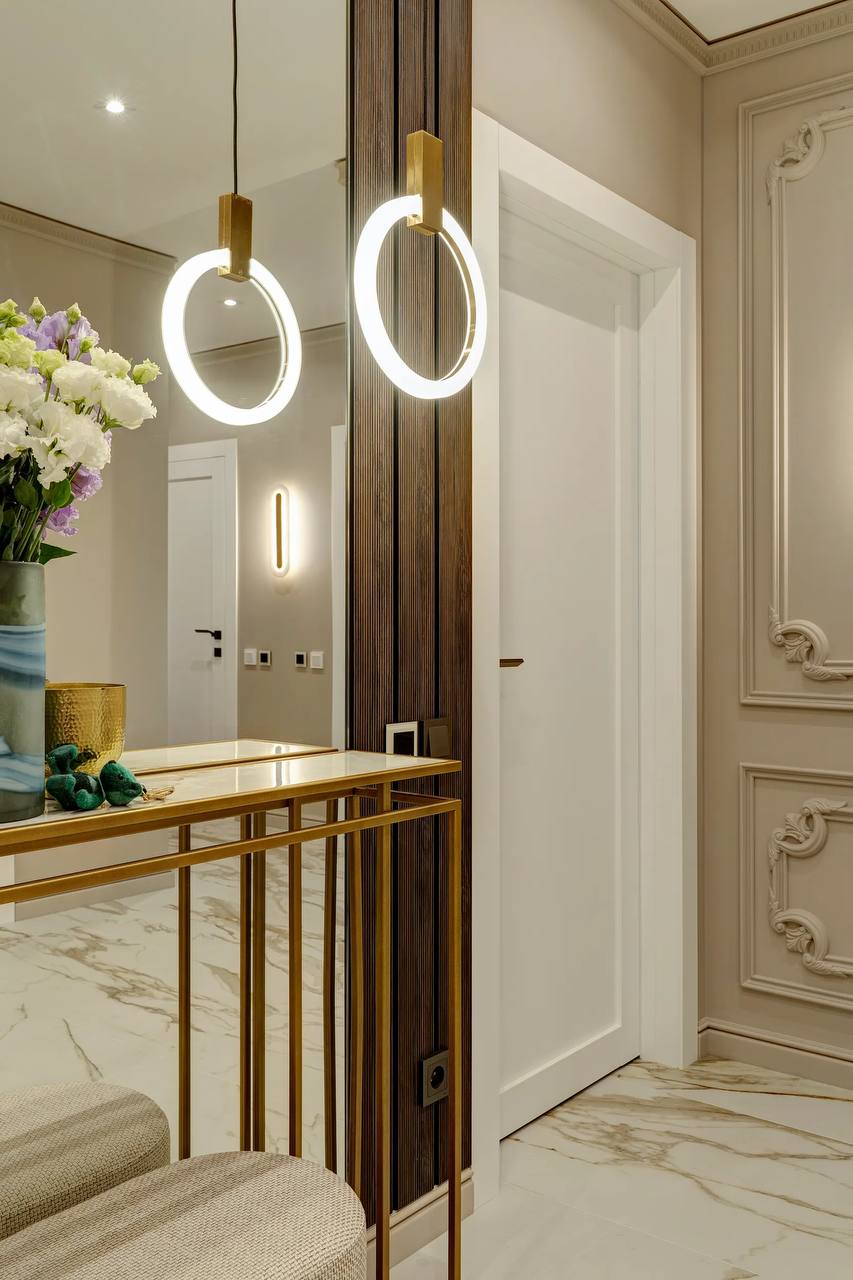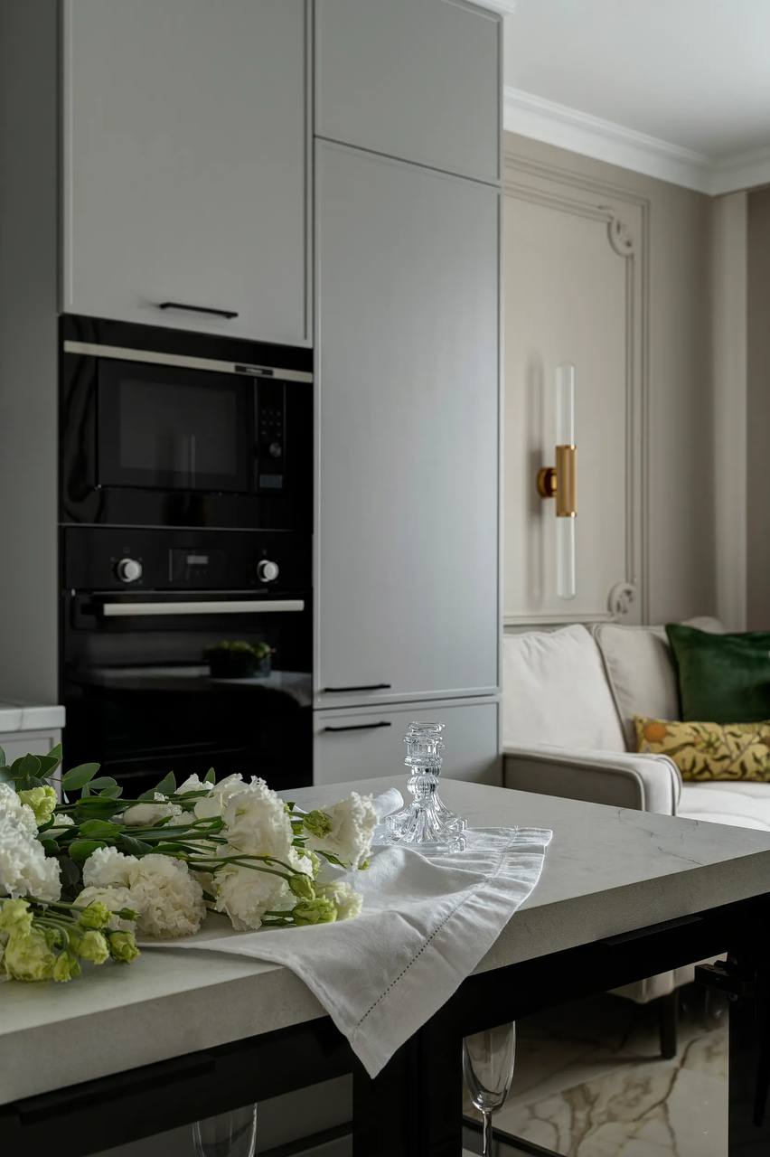 Светлые стены с молдингами создают архитектурный «каркас», а латунь и зеркала добавляют глубину и мягкие отражения света. На кухне - строгие матовые фасады и каменная столешница, которые держат чистую геометрию пространства и поддерживают ощущение порядка.