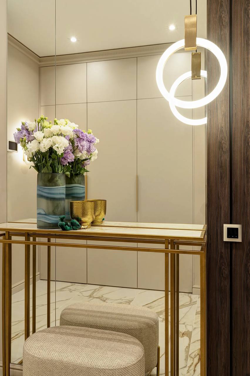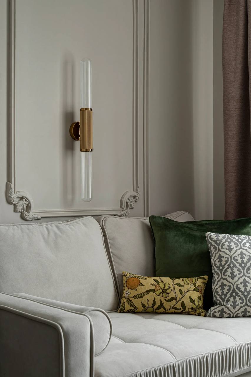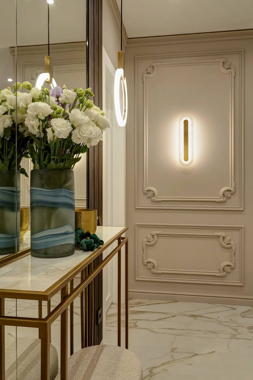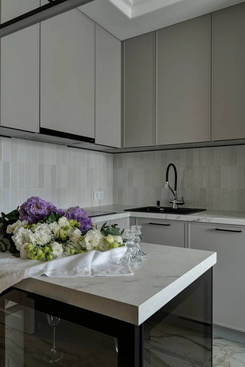 Светлые стены с молдингами создают архитектурный «каркас», а латунь и зеркала добавляют глубину и мягкие отражения света. На кухне - строгие матовые фасады и каменная столешница, которые держат чистую геометрию пространства и поддерживают ощущение порядка.