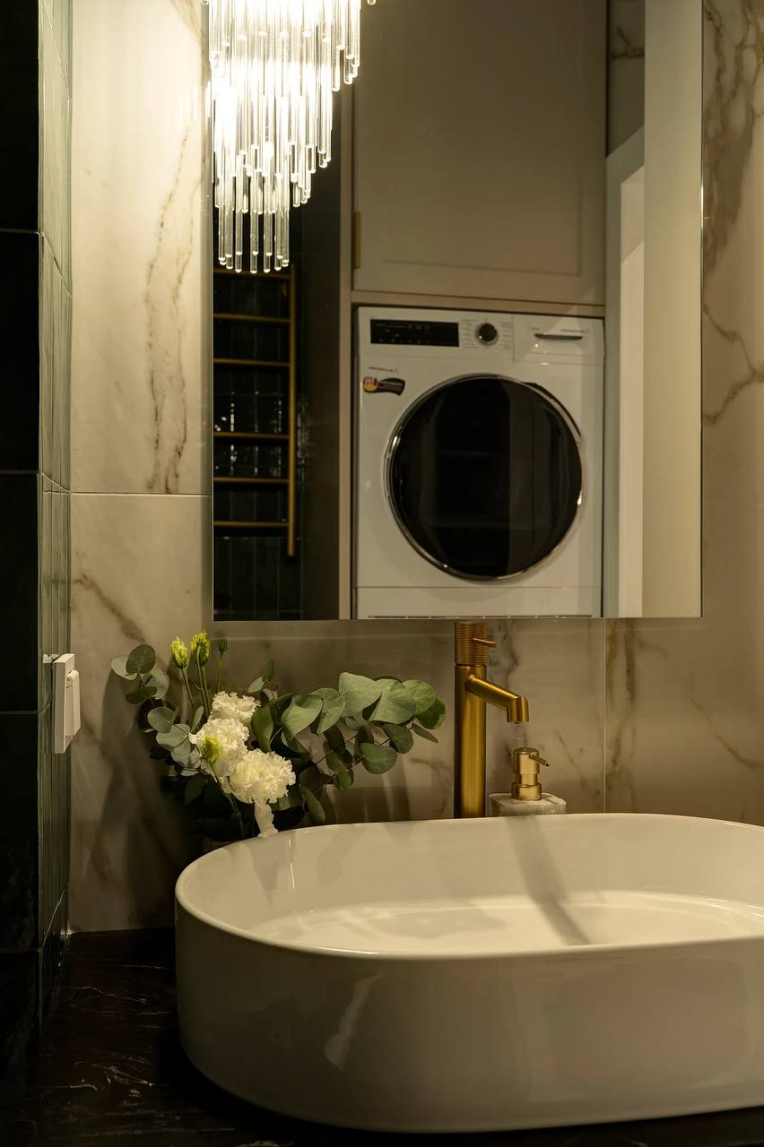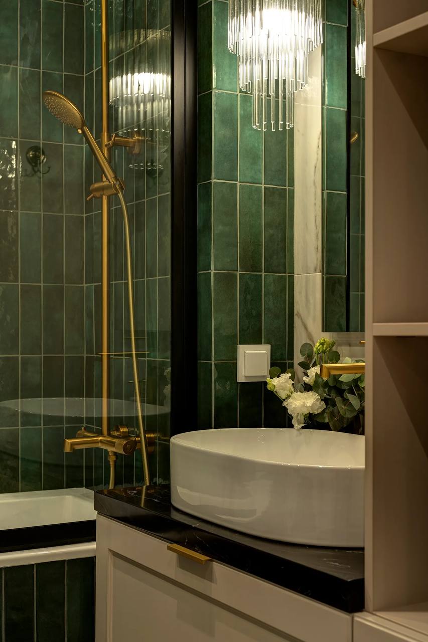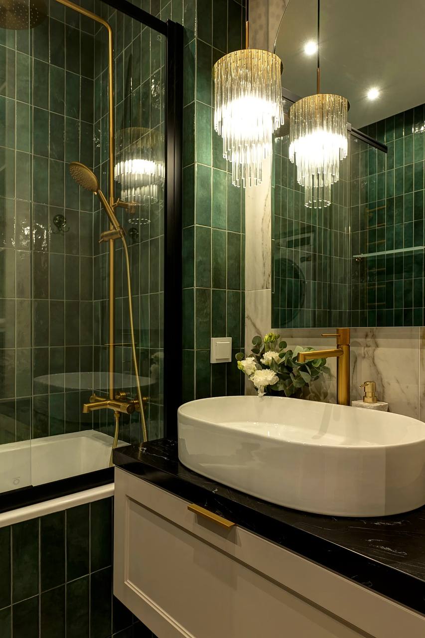 Санузел - отдельный вау-кадр: глубокая зелёная глянцевая плитка, чёрные контуры душевого ограждения и тёплая латунная сантехника. Хрустальные подвесы дают атмосферу бутик-отеля, а сочетание мраморной фактуры и блестящей глазури делает пространство максимально «дорогим» на вид и при этом практичным в быту.