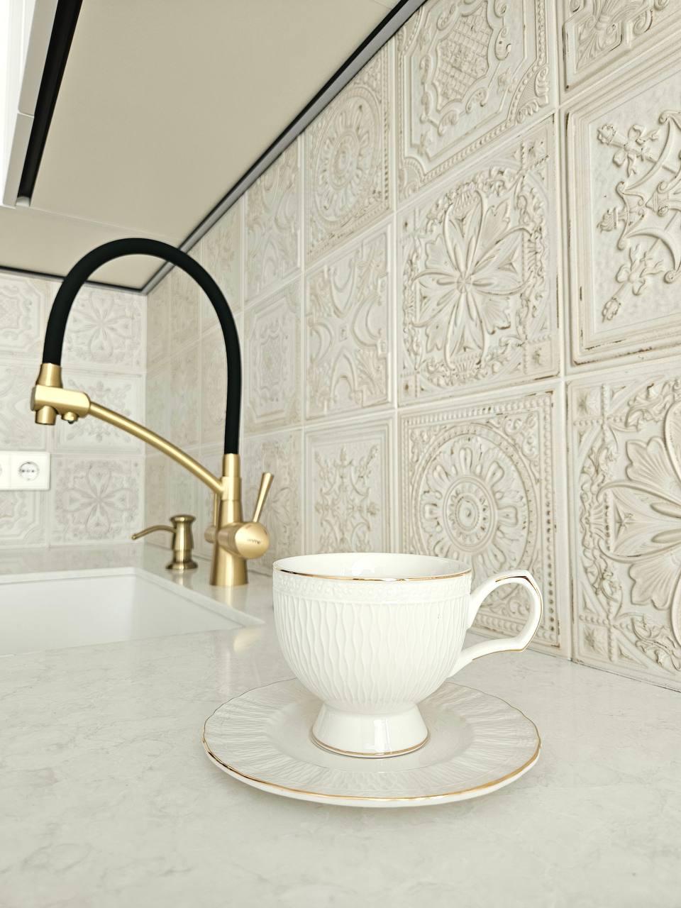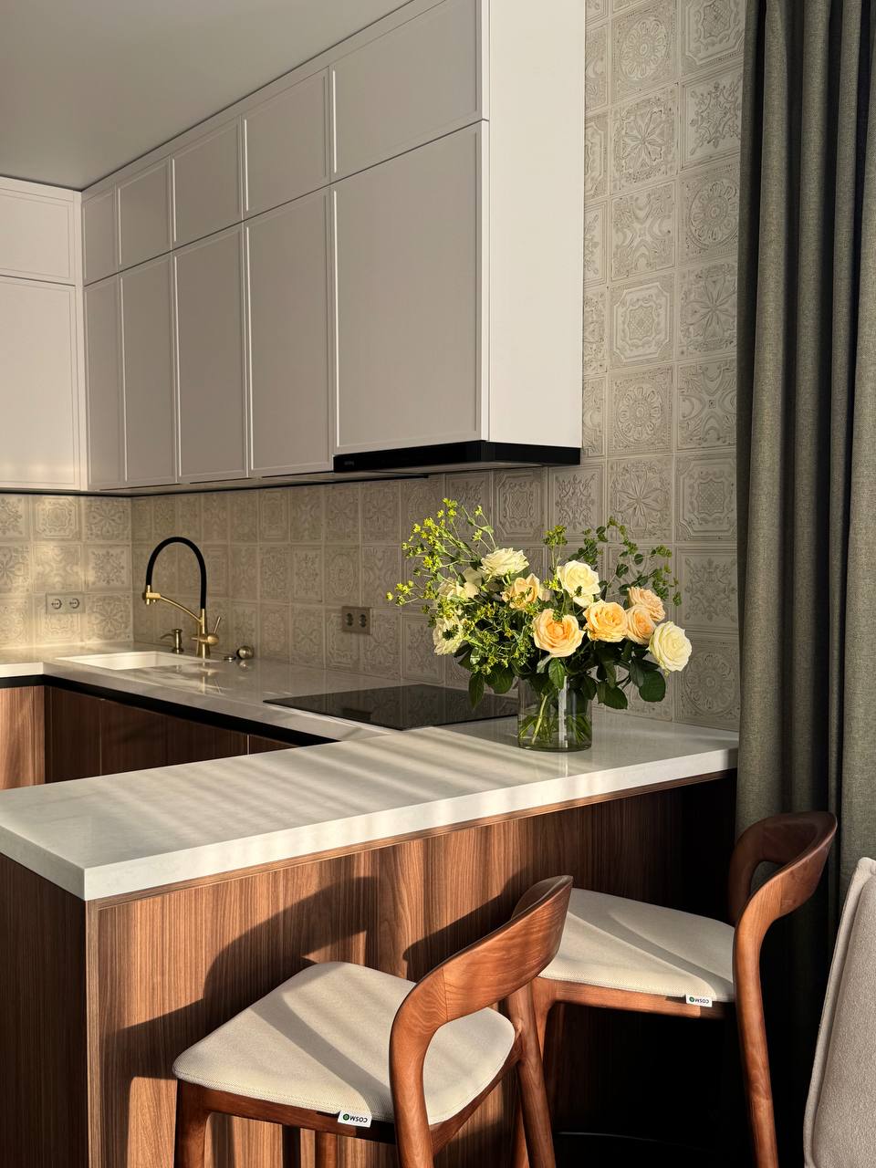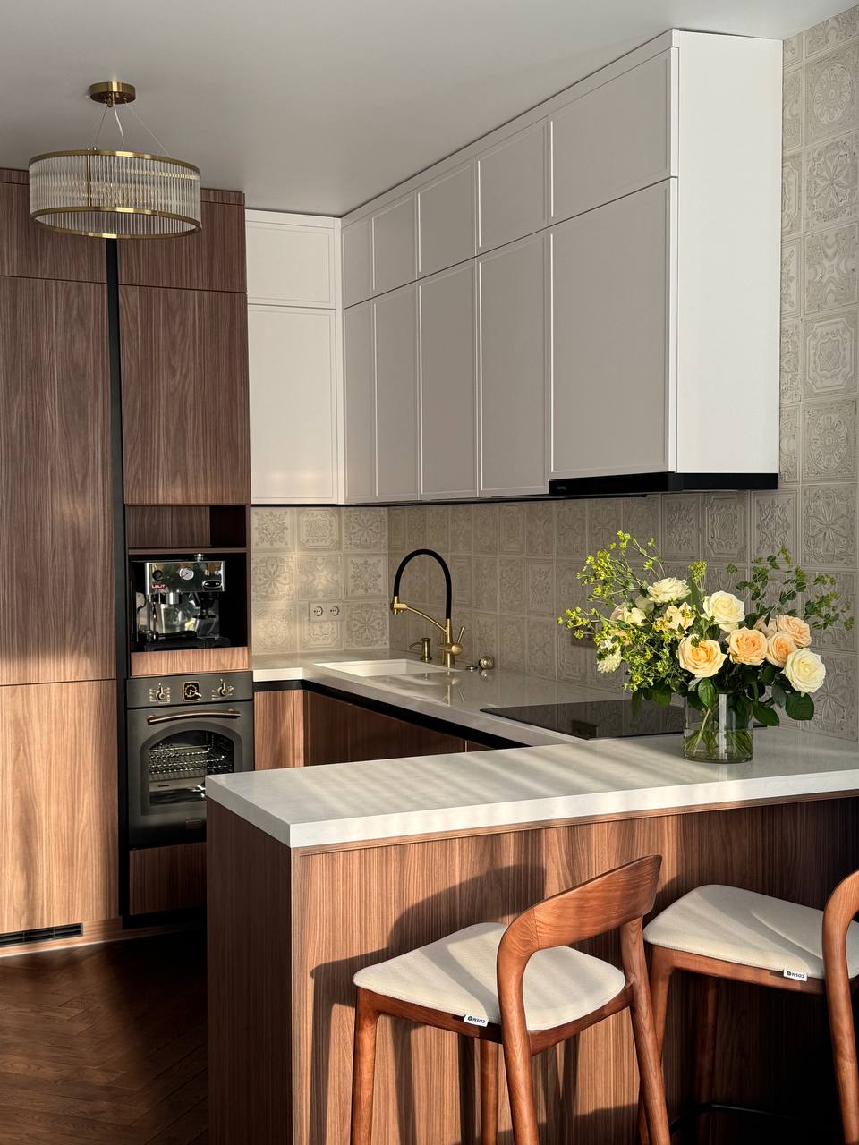 Кухня выполнена в сочетании тёплого дерева и светлых фасадов, а фартук из рельефной плитки с орнаментом добавляет интерьеру глубину и характер даже без ярких цветов. Латунные смесители и детали освещения поддерживают ощущение уюта и мягкого света, а каменная столешница делает пространство цельным и практичным.