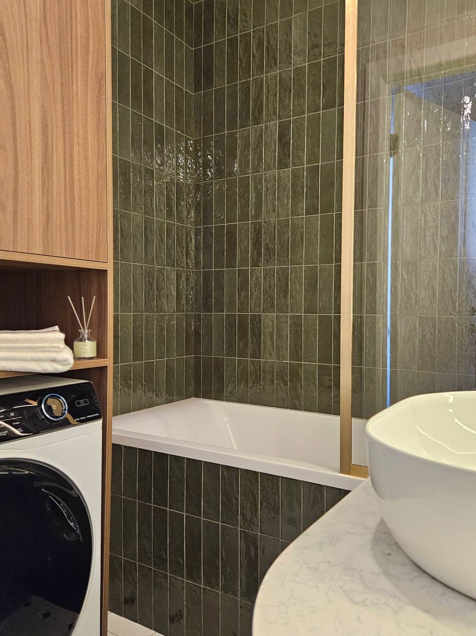 Санузел решён контрастно и графично: изумрудная глянцевая плитка внизу, светлая — сверху, плюс классический шестигранник на полу. В результате получился интерьер, который выглядит современно, но не «холодно» — с правильным балансом текстур, тепла дерева и благородных акцентов.
